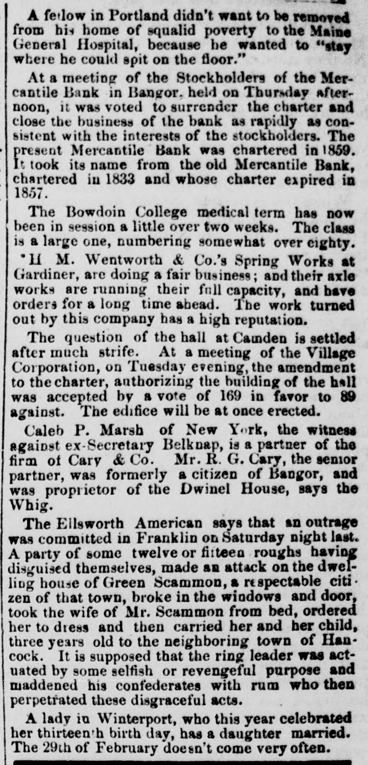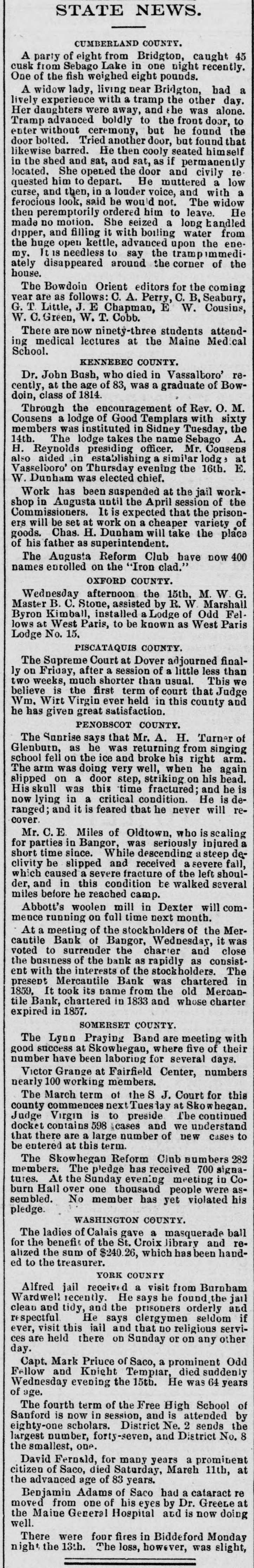 STATE NEWS. CUMBERLAND COUNTY. A party of eight from Bridgton, caught 45 cusk from Sebago Lake in one night recently. One of the fish weighed eight pounds. A widow lady, living near Bridgton, had a lively experience with a tramp the other day. Her daughters were away, and the was alone. Tramp advanced boldly to the front door, to enter without ceremony, but he found the door bolted. Tried another door, but found that likewise barred. He then cooly seated himself in the shed and sat, and sat, as if permanently located. She opened the door and civily 10 quested him to depart. He muttered a low curse, and then, in a louder voice, and with a ferocious look, said be would not. The widow He then peremptorily ordered him to leave. made no motion. She seized a long handled dipper, and filling it with boiling water from the huge open kettle, advanced upon the enemy. It 18 needless to say the trampimmediately disappeared around the corner of the house. The Bowdoin Orient editors for the coming year are as follows: A. Perry, C.1 B, Seabury, Cousins, G. T. Little, J. . E Chapman, E W. W. C. Green, W. T. Cobb. There are now ninety-three students attending medical lectures at the Maine Medical School. KENNEBEC COUNTY. Dr. John Bush, who died in Vassaltoro' recently, at the age of 83, was a graduate of Bowdoin, class of 1814. Through the encouragement of Rev. O. M. Cousens a lodge of Good Templars with sixty members was instituted in Sidney Tuesday, the A. 14th. The lodge takes the name Sebago H. Reynolds presiding officer. Mr. Cousens also aided .in establishing a similar lodge at Vasselboro' on Thursday evening the 16th. E. W. Dunham was elected chief. Work has been suspended at the jail workshop in Augusta until the April session of the Commissioners. It is expected that the prisonwill be set at work on a cheaper variety of goods. ers Chas. H. Dunham will take the place of his father as superintendent. The Augusta Reform Club have now 400 names enrolled on the "Iron clad.' OXFORD COUNTY. Wednesday afternoon the 15th. M.W.G. Master B. C. Stone, assisted by R. W Marshall Byron Kimball, installed a Lodge of Odd Fellows at West Paris, to be known as West Paris Lodge No. 15, PISCATAQUIS COUNTY. The Supreme Court at Dover adjourned finally on Friday, after a session of a little less than two weeks, much shorter than usual. This we believe is the first term of court that Judge Wm. Wirt Virgin ever held in this county and he has given great satisfaction. PENOBSCOT COUNTY. The Sunrise says that Mr. A. H. Turner of Glenburn, as he was returning from singing school fell on the ice and broke his right arm. The arm was doing very well, when he again slipped on a door step, striking on his head. His skull was this time fractured; and he is now lying in a critical condition. He is decover. ranged; and it is feared that he never will reMr. C.E Miles of Oldtown, who is scaling for parties in Bangor, was seriously injured short time since. While descending steep declivity be slipped and received a severe fall, which caused a severe fracture of the left shoulder, and in this condition be walked several miles before he reached camp. Abbott's woolen mill in Dexter will commence running on full time next month. At a meeting of the stockholders of the Mercantile Bank of Bangor, Wednesday, it was voted to surrender the charter and close the business of the bank as rapidly as consistent with the interests of the stockholders. The present Mercautile Bank was chartered in 1859, It took its name from the old Mercantile Bank, chartered in 1833 and whose charter expired in 1857. SOMERSET COUNTY. The Lynn Praying Band are meeting with good success at Skowhegan, where five of their number have been laboring for several days. Victor Grange at Fairfield Center, numbers nearly 100 working members. The March term of the S J. Court for this county commences next Tuesday at Skowhegan. Judge Virgin is to preside The continued docket contains 598 .cases and we understand that there are a large number of new cases to e entered at this term. The Skowhegan Reform Club numbers 282 members. The pledge has received 700 signatures. At the Sunday evening meeting in Coburn Hall over one thousand people were assembled. No member has yet violated his pledge. WASHINGTON COUNTY. The ladies of Calais gave a masquerade ball for the benefit of the St. Croix library and realized the sum of $240.26, which has been handed to the treasurer. YORK COUNTY Alfred jail received a visit from Burnham Wardwell recently. He says he found. the jail clean and tidy, and the prisoners orderly and respectful He says clergymen seldom if ever, visit this iail and that no religious services are held there on Sunday or on any other day. Capt. Mark Priuce of Saco, a prominent Odd Fellow and Knight Tempiar, died suddenly Wednesday evening the 15th. He was 64 years of age. The fourth term of the Free High School of Sanford is now in session, and is attended by eighty-one scholars. District Ne. 2 sends the 8 largest number, forty-seven, and District No. the smallest, one. David Fernald, for many years a prominent citizen of Saco, died Saturday, March 11th, at the advanced age of 83 years. Benjamin Adams of Saco had a cataract re moved from one of his eyes by Dr. GreeLe at the Maine General Hospital and is now doing well. There were four fires in Biddeford Monday night the 13th. The loss, however, was slight,