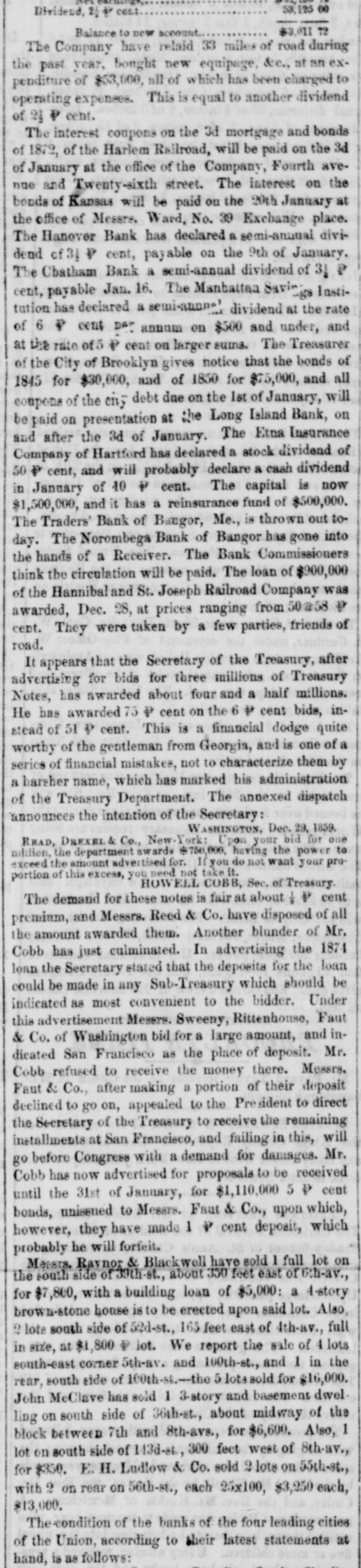 58,125 00 Dividend, 24 cent $3,011 72 Balance to new account The Company have relaid 33 miles of road during the past year, bought new equipage, &c., at an expenditure of $53,000, all of which has been charged to operating expenses. This is equal to another dividend of 21 ₽ cent. The interest coupons on the 3d mortgage and bonds of 1879, of the Harlem Rsilroad, will be paid on the 3d of January at the office of the Company, Fourth avenue and Twenty-sixth street. The interest on the bonds of Kansas will be paid ou the 20th January at the office of Measrs. Ward, No. 39 Exchange place. The Hanover Bank has declared a semi-annual dividend of 34 ₽ cent, payable on the 9th of January, The Cbatham Bank a semi-annual dividend of 31 ₽ cent, payable Jan. 16. The Manhattan Savings Iastitution has declared a semi-annne? dividend at the rate of 6 P cent Dan annum on $500 and under, and at the rate of ₽ cent on larger sums. The Treasurer of the City of Brooklyn gives notice that the bonds of 1845 for $30,000, and of 1850 for $75,000, and all coupons of the city debt due on the 1st of January, will be paid on presentation at the Long Island Bank, on and after the 3d of January. The Etna Insurance Company of Hartford has declared a stock dividend of 50 ₽ cent, and will probably declare a cash dividend in January of 40 ₽ cent. The capital is now $1,500,000, and it has a reinsurance fund of $500,000. The Traders' Bank of Bangor, Me., is thrown out today. The Norombega Bank of Bangor has gone into the hands of a Receiver. The Bank Commissioners think the circulation will be paid. The loan of $900,000 of the Hannibal and St. Joseph Railroad Company was awarded, Dec. 28, at prices ranging from 50@58 ₽ cent. They were taken by a few parties, friends of road. It appears that the Secretary of the Treasury, after advertising for bids for three millions of Treasury Notes, has awarded about four and a half millions. He has awarded 75 ₽ cent on the 6 ₽ cent bids, instead of 51 ₽ cent. This is a financial dodge quite worthy of the gentleman from Georgia, and is one of a series of financial mistakee, not to characterize them by a harsher name, which has marked his administration of the Treasury Department. The annexed dispatch announces the intention of the Secretary: WASHINGTON. Dec. 29, 1859. READ, DREXEL & Co., New York: Upon your bid for one million, the department awards $750,000, having the power to exceed the amount advertised for. you do not want your proportion of this excess, you need not take HOWELL COBB, Sec. of Treasury. The demand for these notes is fair at about 1/8 ₽ cent premium, and Messrs. Reed & Co. have disposed of all the amount awarded them. Another blunder of Mr. Cobb has just culminated. In advertising the 1874 loan the Secretary stated that the deposita for the loan could be made in any Sub-Treasury which should be indicated as most convenient to the bidder. Under this advertisement Mesers. Sweeny, Rittenhouse, Faut & Co. of Washington bid for a large amount, and indicated San Francisco as the place of deposit. Mr. Cobb refused to receive the money there. Messrs. Faut & Co., after making a portion of their deposit declined to go on, appealed to the President to direct the Secretary of the Treasury to receive the remaining installments at San Francisco, and failing in this, will go before Congress with a demand for damages. Mr. Cobb has now advertised for proposals to be received until the 31st of January, for $1,110,000 5 ₽ cent bonds, unisened to Messrs. Faut & Co., upon which, however, they have made 1 P cent deposit, which probably he will forfeit. Measts. Raynor & Blackwell have sold 1 full lot on the south side of 39th-st., about 350 feet east of 6th-av., for $7,800, with a building loan of $5,000: a 4-story brown-stone house is to be erected upon said lot. Also, 2 lote south side of 52d-st., 165 feet east of 4th-av., full in size, at $1,800 P lot. We report the sale of 4 lots south-east corner 5th-av. and 100th-st., and 1 in the rear, south side of 100th-st.--the otasold for $16,000. John McClave has sold 1 3-story and basement dwel ling on south side of 36th-st., about midway of the block between 7th and 8th-avs., for $6,600. Also, 1 lot on south side of 143d-at., 300 feet west of 8th-av., for $350. E. H. Ludlow & Co. sold 2 lots on 55th-st., with 2 on rear on 56th-st., each 25x100, $3,250 each, $13,000. The condition of the banks of the four leading cities of the Union, according to their latest statements at hand, is as follows: