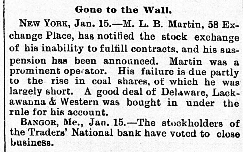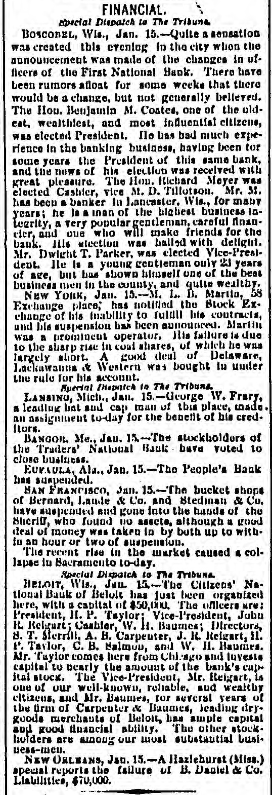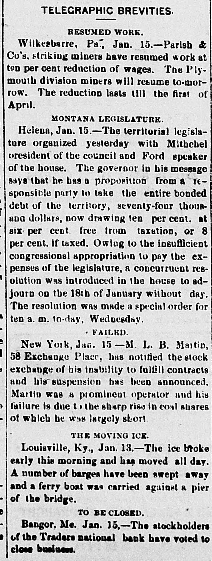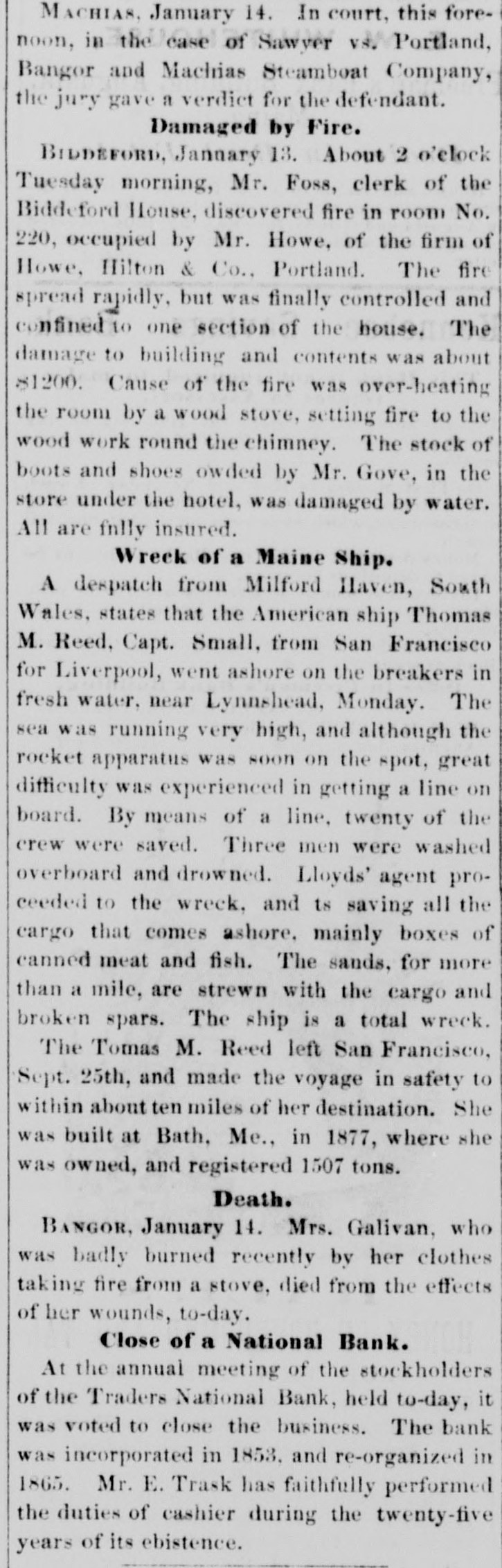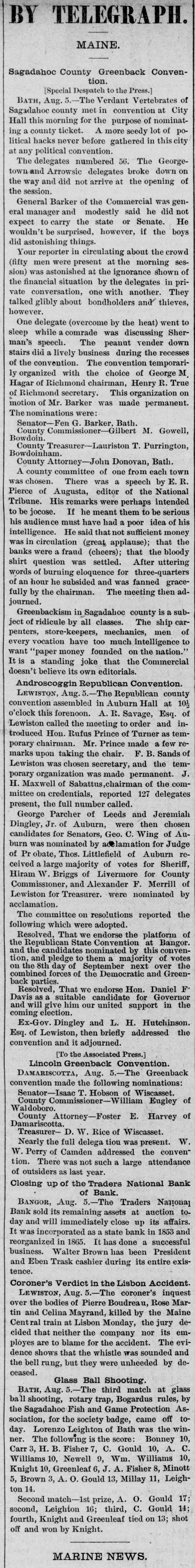 BY TELEGRAPH. MAINE. Sagadahoc County Greenback Convention. [Special Despatch to the Press.] BATH, Aug. 5.-The Verdant Vertebrates of Sagadahoc county met in convention at City Hall this morning for the purpose of nominating a county ticket. A more seedy lot of political hacks never before gathered in this city at any political convention. The delegates numbered 56. The Georgetown and Arrowsic delegates broke down on the way and did not arrive at the opening of the session. General Barker of the Commercial was general manager and modestly said he did not expect to carry the state or Senate. He wouldn't be surprised, however, if the boys did astonishing things. Your reporter in circulating about the crowd (fifty men were present at the morning session) was astonished at the ignorance shown of the financial situation by the delegates in private conversation, one with another. They talked glibly about bondholders and thieves, however. One delegate (overcome by the heat) went to sleep while a comrade was discussing Sherman's speech. The peanut vender down stairs did a lively business during the recesses of the convention. The convention temporarily organized with the choice of George M Hagar of Richmond chairman, Henry R. True of Richmond secretary. This organization on motion of Mr. Barker was made permanent. The nominations were: Senator-Fen G. Barker, Bath. County Commissioner-Gilbert M. Gowell, Bowdoin. County Treasurer-Lauriston T. Purrington, Bowdoinham. County Attorney-John Donovan, Bath. A county committee of one from each town was chosen. There was a speech by E. R. Pierce of Augusta, editor of the National Tribune. His remarks were perhaps intended to be jocose. If he meant them to be serious his audience must have had a poor idea of his intelligence. He said that not sufficient money was in circulation (great applause); that the banks were a fraud (cheers); that the bloody shirt question was settled. After uttering words of burning eloquence for three-quarters of an hour he subsided and was fanned gracefully by the chairman. The meeting then adjourned. Greenbackism in Sagadahoc county is a subject of ridicule by all classes. The ship carpenters, store-keepers, mechanics, men of every vocation have too much intelligence to want "paper money founded on the nation. It is a standing joke that the Commercial doesn't believe its own editorials. Androscoggin Republican Convention. LEWISTON, Aug. 5.-The Republican county convention assembled in Auburn Hall at 101/2 o'clock this forenoon. A. R. Savage, Esq. of Lewiston called the meeting to order and introduced Hon. Rufus Prince of Turner as temporary chairman. Mr. Prince made a few remarks upon taking the chair. F. B. Sands of Lewiston was chosen secretary, and the temporary organization was made permanent. J. H. Maxwell of Sabattus,chairman of the committee on credentials, reported 127 delegates present, the full number called. George Parcher of Leeds and Jeremiah Dingley, Jr. of Auburn, were then chosen candidates for Senators, Geo. C. Wing of Auburn was nominated by acelamation for Judge of Pr obate, Thos. Littlefield of Auburn received a large majority of votes for Sheriff, Hiram W. Briggs of Livermore for County Commissioner, and Alexander F. Merrill of Lewiston for Treasurer. were nominated by acclamation. The committee on resolutions reported the following which were adopted. Resolved, That we endorse the platform of the Republican State Convention at Bangor. and the candidates nominated by this convention, and pledge to them majority of votes on the 8th day of September next over the combined forces of the Democratic and Greenback parties. Resolved, That we endorse Hon. Daniel F' Davis as a suitable candidate for Governor and will give him our united support in the coming election. Ex-Gov. Dingley and L. H. Hutchinson. Esq. of Lewiston, then briefly addressed the convention and it adjourned. [To the Associated Press.] Lincoln Greenback Convention. DAMARISCOTTA, Aug. 5.-The Greenback convention made the following nominations: Senator-Isaac T. Hobson of Wiscasset. County Commissioner-William Eugley of Waldoboro. County Attorney-Foster E. Harvey of Damariscotta. Treasurer- D. W. Rice of Wiscasset. Nearly the full delega tiou was present. W. W. Perry of Camden addressed the conven" tion. There was not such a large attendance of outsiders as last year. Closing up of the Traders National Bank of Bank. BANGOR, ,Aug. 5.-The Traders National Bank sold its remaining assets at auction today and will immediately close up its affairs. It was incorporated as a state bank in 1853 and reorganized in 1865. It has done a successful business. Walter Brown has been President and Eben Trask cashier during its entire existence. Coroner's Verdict in the Lisbon Accident. LEWISTON, Aug. 5.-The coroner's inquest over the bodies of Pierre Boudreau, Rose Martin and Celina Mayrand, killed by the Maine Cent ral train at Lisbon Monday, the jury decided that neither the company nor its employes are to blame for the accident. The evidence shows that the whistle was sounded and the bell rung, but they were unheeded by deceased. Glass Ball Shooting. BATH, Aug. 5.-The third match at glass ball shooting, rotary trap, Bogardus rules, by the Sagadahoc Fish and Game Protection Association, for the society badge, came off today. Lorenzo Leighton of Bath was the winner. The following is the score: Bonney 10, Carr 3, H. B. Fisher 7, C. Gould 10, A. C. Williams 10, Newell 9, Wm. Williams 10, Knight 10, Greenleaf 6, J. A. Fisher 8, Minott 5, Brown 3, A. O. Gould 13, Millay 11, Leighton 14. Second match-1st prize, A. O. Gould 17; second, Leighton 16; third, C. Gould 14;