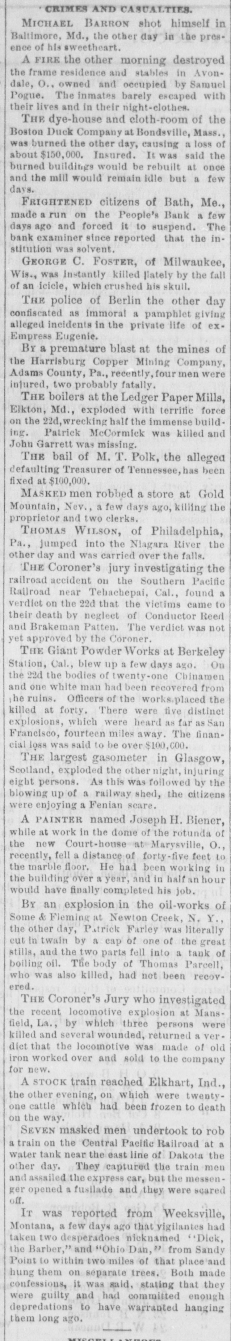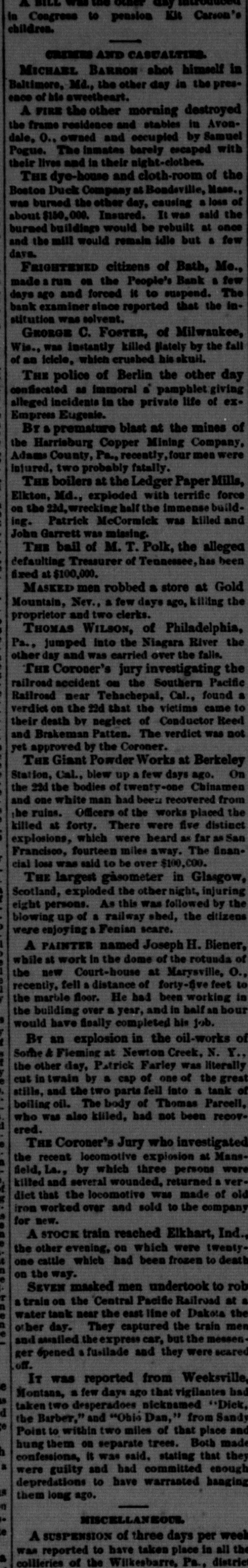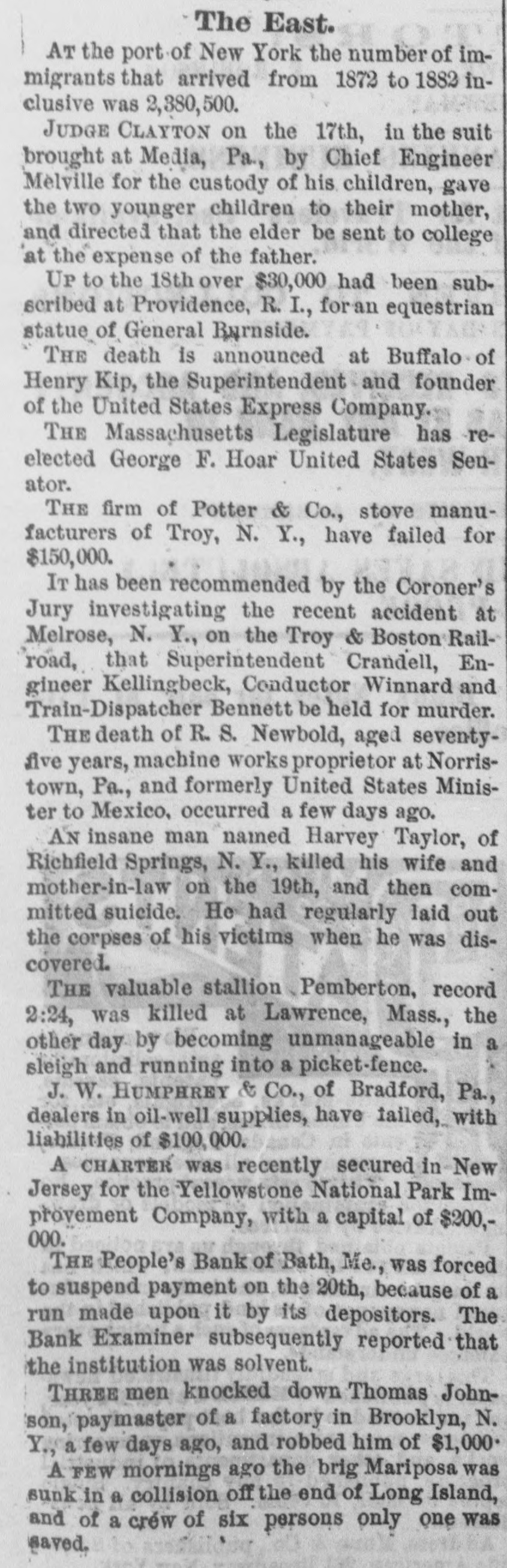 The East. AT the port of New York the number of immigrants that arrived from 1872 to 1882 inclusive was 2,380,500. JUDGE CLAYTON on the 17th, in the suit brought at Media, Pa., by Chief Engineer Melville for the custody of his children, gave the two younger children to their mother, and directed that the elder be sent to college at the expense of the father. Up to the 18th over $30,000 had been subscribed at Providence, R. I., for an equestrian statue of General Burnside. THE death is announced at Buffalo of Henry Kip, the Superintendent and founder of the United States Express Company. THE Massachusetts Legislature has reelected George F. Hoar United States Senator. THE firm of Potter & Co., stove manufacturers of Troy, N. Y., have failed for $150,000. IT has been recommended by the Coroner's Jury investigating the recent accident at Melrose, N. Y., on the Troy & Boston Railroad, that Superintendent Crandell, Engineer Kellingbeck, Conductor Winnard and Train-Dispatcher Bennett be held for murder. THE death of R.S. Newbold, aged seventyfive years, machine works proprietor at Norristown, Pa., and formerly United States Minister to Mexico, occurred a few days ago. AN insane man named Harvey Taylor, of Richfield Springs, N. Y., killed his wife and mother-in-law on the 19th, and then committed suicide. He had regularly laid out the corpses of his victims when he was discovered. THE valuable stallion Pemberton, record 2:24, was killed at Lawrence, Mass., the other day by becoming unmanageable in a sleigh and running into a picket-fence. J. W. HUMPHREY & Co., of Bradford, Pa., dealers in oil-well supplies, have failed, with liabilities of $100,000. A CHARTER was recently secured in New Jersey for the Yellowstone National Park Improvement Company, with a capital of $200,000. THE People's Bank of Bath, Me., was forced to suspend payment on the 20th, because of a run made upon it by its depositors. The Bank Examiner subsequently reported that the institution was solvent. THREE men knocked down Thomas Johnson, paymaster of a factory in Brooklyn, N. Y., a few days ago, and robbed him of $1,000. A FEW mornings ago the brig Mariposa was sunk in a collision off the end of Long Island, and of a créw of six persons only one was saved.