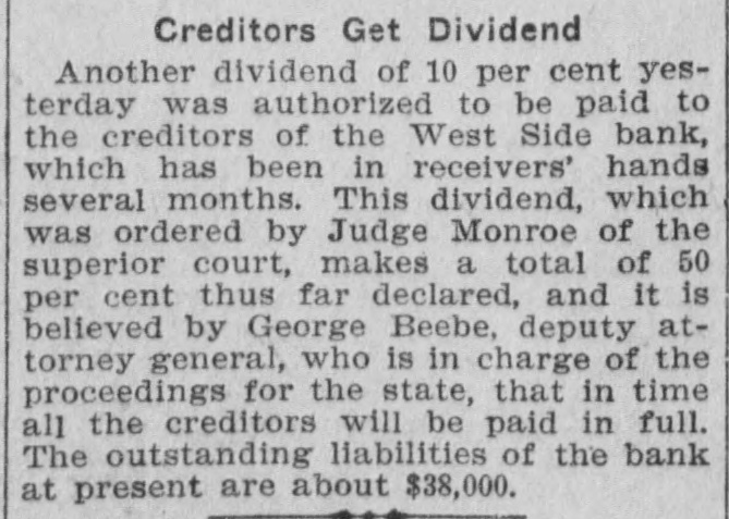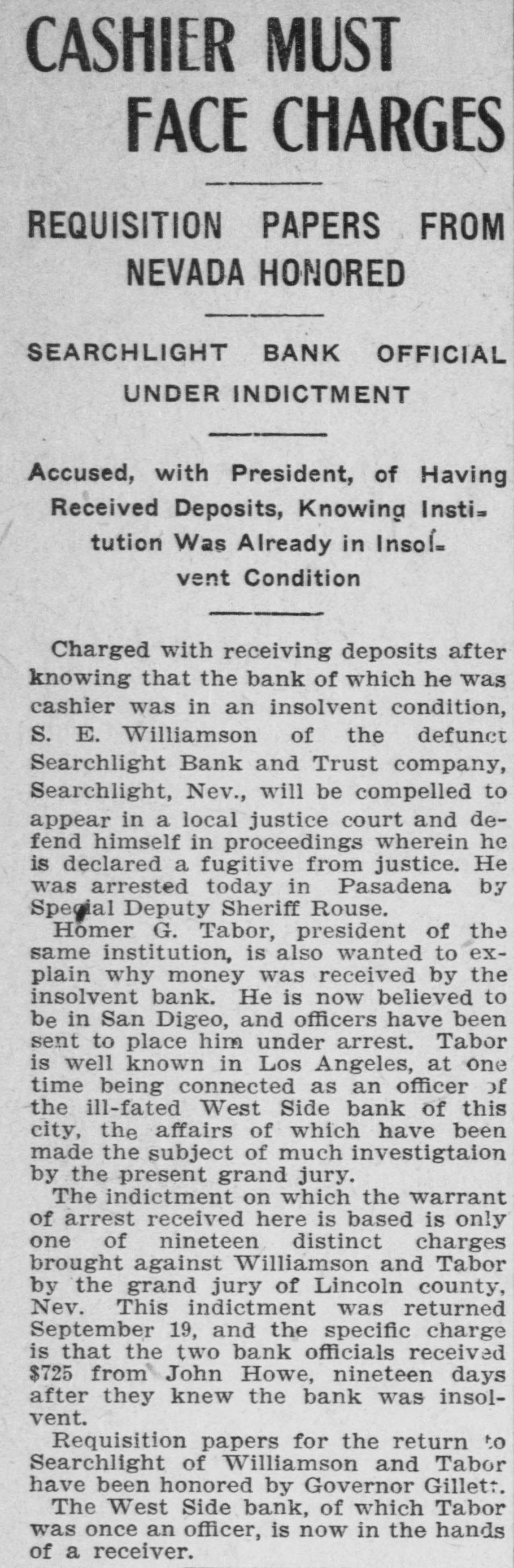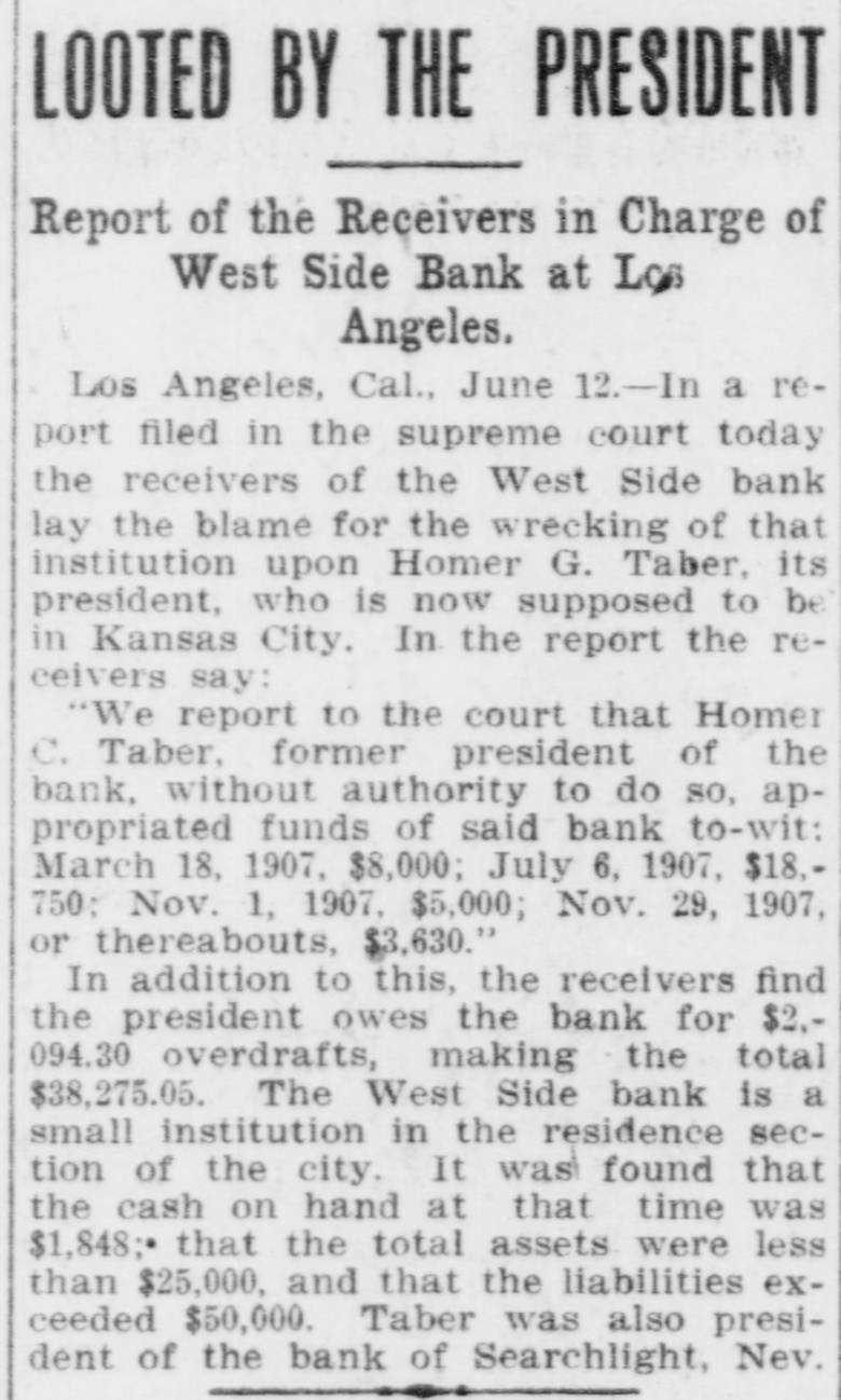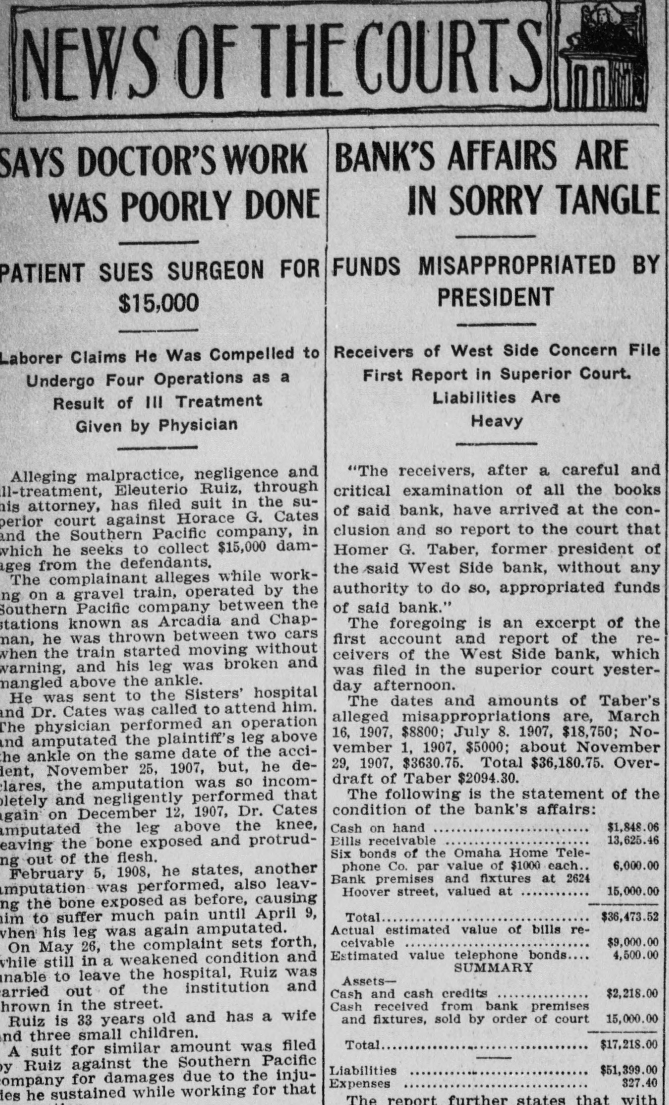 NEWS OF THE COURTS BANK'S AFFAIRS ARE SAYS DOCTOR'S WORK IN SORRY TANGLE WAS POORLY DONE FUNDS MISAPPROPRIATED BY PATIENT SUES SURGEON FOR PRESIDENT $15,000 Receivers of West Side Concern File Laborer Claims He Was Compelled to First Report in Superior Court. Undergo Four Operations as a Liabilities Are Result of III Treatment Heavy Given by Physician "The receivers, after a careful and Alleging malpractice, negligence and critical examination of all the books ll-treatment, Eleuterio Ruiz, through attorney, has filed suit in the suof said bank, have arrived at the conperior court against Horace G. Cates clusion and so report to the court that and the Southern Pacific company, in which he seeks to collect $15,000 damHomer G. Taber, former president of ages from the defendants. the said West Side bank, without any The complainant alleges while workauthority to do so, appropriated funds on a gravel train, operated by the of said bank." Southern Pacific company between the stations known as Arcadia and ChapThe foregoing is an excerpt of the first account and report of the renan, he was thrown between two cars when the train started moving without ceivers of the West Side bank, which warning, and his leg was broken and was filed in the superior court yestermangled above the ankle. day afternoon. He was sent to the Sisters' hospital The dates and amounts of Taber's nd Dr. Cates was called to attend him. alleged misappropriations are, March The physician performed an operation 16, 1907, $8800; July 8. 1907, $18,750; Nond amputated the plaintiff's leg above vember 1, 1907, $5000; about November he ankle on the same date of the acci29, 1907, $3630.75. Total $36,180.75. Overlent, November 25, 1907, but, he dedraft of Taber $2094.30. lares, the amputation was SO incomThe following is the statement of the letely and negligently performed that condition of the bank's affairs: gain on December 12, 1907, Dr. Cates Cash on hand $1,848.06 imputated the leg above the knee, 13,625.46 Bills receivable eaving the bone exposed and protrudSix bonds of the Omaha Home Teleout of the flesh. 6,000.00 phone Co. par value of $1000 each February 5, 1908, he states, another Bank premises and fixtures at 2624 imputation was performed, also leav15,000.00 Hoover street, valued at the bone exposed as before, causing Total $36,473.52 to suffer much pain until April 9, Actual estimated value of bills revhen his leg was again amputated. ceivable $9,000.00 On May 26, the complaint sets forth, 4,500.00 Estimated value telephone bonds while still in a weakened condition and SUMMARY nable to leave the hospital, Ruiz was Assetsarried out of the institution and Cash and cash credits $2,218.00 Cash received from bank premises hrown in the street. 15,000.00 and fixtures, sold by order of court Ruiz is 33 years old and has a wife nd three small children. Total $17,218.00 A suit for similar amount was filed Ruiz against the Southern Pacific Liabilities $51,399.00 327.40 ompany for damages due to the injuExpenses he sustained while working for that The report further states that with