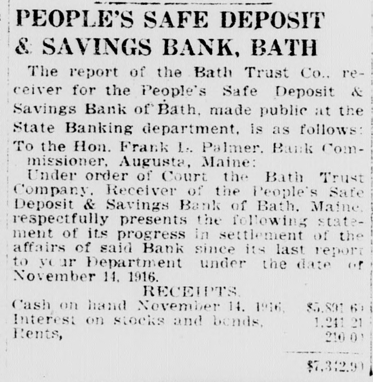 # PEOPLE'S SAFE DEPOSIT # & SAVINGS BANK, BATH The report of the Bath Trust Co., receiver for the People's Safe Deposit & Savings Bank of Bath, made public at the State Banking department, is as follows: To the Hon. Frank L. Palmer. Bank Commissioner, Augusta, Maine: Under order of Court the Bath Trust Company, Receiver of the People's Safe Deposit & Savings Bank of Bath, Maine, respectfully presents the following statement of its progress in settlement of the affairs of said Bank since its last report to your Department under the date of November 14, 1916. RECEIPTS. Cash on hand November 14, 1916, $5.801 61 Interest on stocks and bends, 1.211 21 Rents, 210.0 $7,312.90