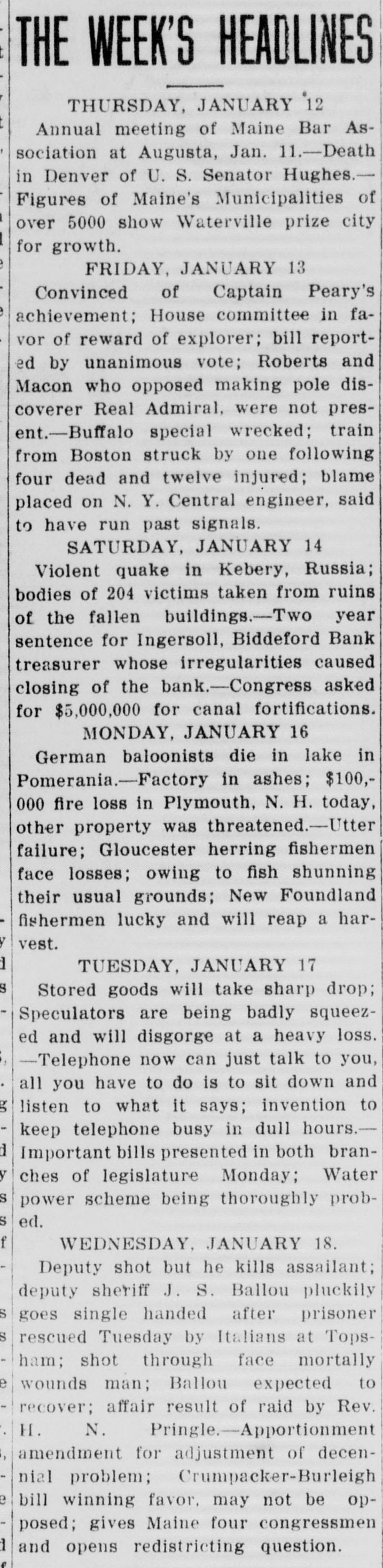 THE WEEK'S HEADLINES THURSDAY, JANUARY 12 Annual meeting of Maine Bar Association at Augusta, Jan. 11.-Death in Denver of U. S. Senator Hughes.Figures of Maine's Municipalities of over 5000 show Waterville prize city for growth. FRIDAY, JANUARY 13 Convinced of Captain Peary's achievement; House committee in favor of reward of explorer; bill reported by unanimous vote; Roberts and Macon who opposed making pole discoverer Real Admiral, were not present.-Buffalo special wrecked; train from Boston struck by one following four dead and twelve injured; blame placed on N. Y. Central engineer, said to have run past signals. SATURDAY, JANUARY 14 Violent quake in Kebery, Russia; bodies of 204 victims taken from ruins of the fallen buildings.-Two year sentence for Ingersoll, Biddeford Bank treasurer whose irregularities caused closing of the bank.-Congress asked for $5,000,000 for canal fortifications. MONDAY, JANUARY 16 German baloonists die in lake in Pomerania.-Factory in ashes; $100,000 fire loss in Plymouth, N. H. today, other property was threatened.-Utter failure; Gloucester herring fishermen face losses; owing to fish shunning their usual grounds; New Foundland fishermen lucky and will reap a harvest. TUESDAY, JANUARY 17 Stored goods will take sharp drop; Speculators are being badly squeezed and will disgorge at a heavy loss. -Telephone now can just talk to you, all you have to do is to sit down and listen to what it says; invention to keep telephone busy in dull hours.Important bills presented in both branches of legislature Monday; Water power scheme being thoroughly probed. f WEDNESDAY, JANUARY 18. Deputy shot but he kills assailant; deputy sheriff J. S. Ballou pluckily goes single handed after prisoner rescued Tuesday by Italians at Topsham; shot through face mortally wounds man; Ballou expected to recover; affair result of raid by Rev. H. N. Pringle.-Apportionment amendment for adjustment of decennial problem; Crumpacker-Burleigh e bill winning favor, may not be opposed; gives Maine four congressmen and opens redistricting question.