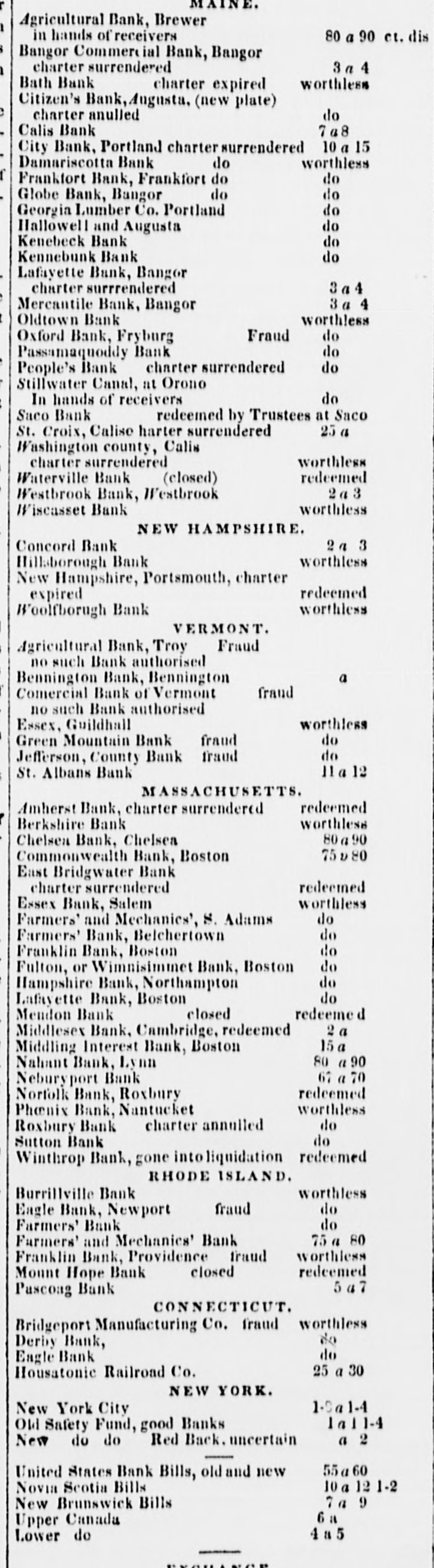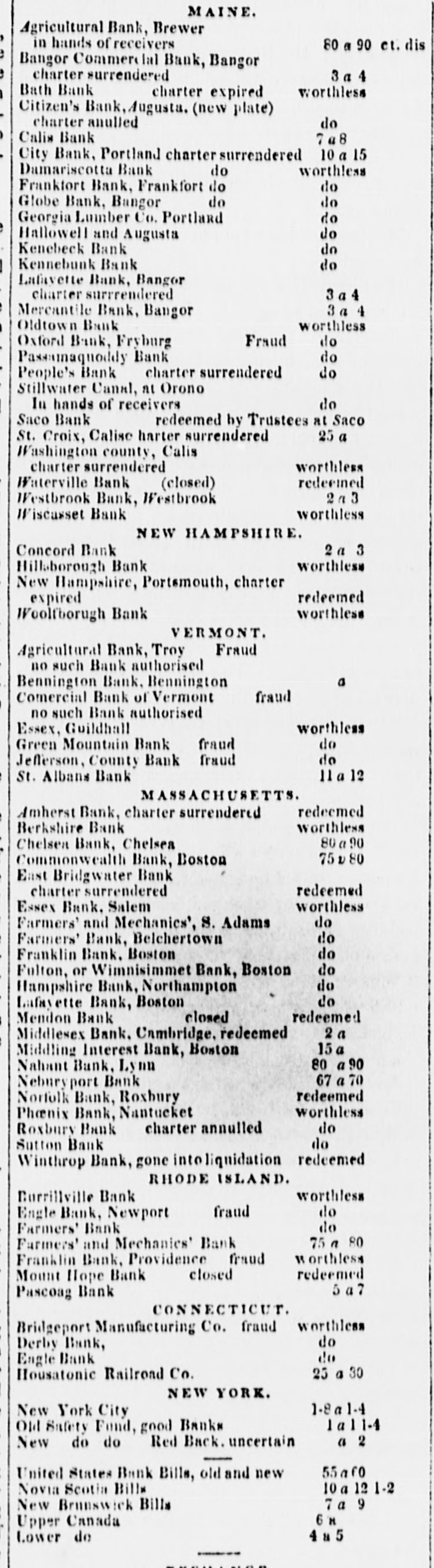 MAINE. Agricultural Bank, Brewer in hands of receivers 80 a 90 ct. dis. Bangor Commercial Bank, Bangor charter surrendered 3 a 4 Bath Bank redeemed charter expired Castine Bank worthless Citizen's Bank, Augusta. (new plate) charter anulled do Calis Bank 10 a 10 a City Bank. Portland charter surrendered do Damariscotta Bank worthless Frankfort Bank, Frankfort do do do Globe Bank, Bangor do do Georgia Lumber Co. Portland do Hallowell and Augusta Kenebeck Bank do Kennebunk Bank do Lafavette Bank, Bangor charter surrrendered 3 a 3 4 Mercantile Bank, Bangor Oldtown Bank worthless Fraud Oxford Bank. Fryburg do do Passamaquoddy Bank charter surrendered do People's Bank Stillwater Canal, A1 Orono In hands of receivers do Saco Bank redeemed by Trustees at Saco St. Croix, Calis 15 (1 Washington county, Calis worthless charter surrendered Waterville Bank redeemed (closed) 2a Westbrook Bank, Westbrook Wiscasset Bank worthless NEW HAMPSHIRE. Concord Bank 2 a worthless Hillsborough Bank New Hampshire, Portsmouth, charter redeemed expired worthless Woolfborgin Bank VERMONT. Agricultural Bank, Troy Frued no such Bank authorised a 80 Bennington Bank. Bennington fraud Comercial Bank of Vermont no such Bank authorised worthless Essex, Guildhall fraud do Green Mountain Bank fraud do Jefferson, County Bank 2a 3 St. Albans Bank MASSACHUSETTS. redeemed Amherst Bank. charter surrendered Berkshire Bank worthless 80 90 Chelsen Bank. Chelsen 75 80 Commonwealth Bank, Boston East Bridgwater Bank redeemed charter surrendered worthless Essex Bank, Salem do Farmers' and Mechanics', 8. Adams do Farmers' Bank, Helchertown Franklin Bank. Boston do do Fulton, or Wimnisimmet Bank. Boston do Hampshire Bank. Northampton do Lafayette Bank, Boston closed Mendon Bank do 2 a Middlexex Bank. Cambridge redeemed 15 20 Middling Interest Bank, Boston Nahant Bank. Lvnn a 90 75a Neburyport Bank redeemed Norfolk Bank, Roxbury worthless Phoenix Bank. Nantucket do Roxbury Bank charter annulled Sutton Bank do Wisthrop Bank, gone into liquidation redeemed RHODE ISLAND. Burrillville Bank worthless fraud do Eagle Bank. Newport do Farmers' Bank 75 80 Farmers' and Mechanics' Bank worthless Franklin Bank. Providence fraud closed redeemed Mount Hope Bank a 10 Puscoag Bank CONNECTICUT. worthless Bridgeport Manufacturing Co. fraud do Derby Bank, do Eagle Bank a 50 Housatonic Railroad Co. NEW YORK. 1-8a14 New York City Old Safety Fund, good Banks do a 2 New do Red Back. uncertain 65 United States Bank Bills, old and new 10 a 12 1-2 Novia Scotia Bills 7 9 New Brunswick Bills EXCHANGE. Drafts on New York par n 1-10 premium " 1.4 Albany Philadeiphia par 1-10 dis Baltimore par a 1-10 Norfolk 13.4 a 2 13.4 a 2 Bichmond 1 1.2a 2 Charlestown 2 a 3 Savannah 4 a 5 Augusta, Gs. nominal " 10 Mobile+ 6 a 7 New Orleans 16 a 17 Nashville a 20 St. Louis 4 a 5 Cinemanti