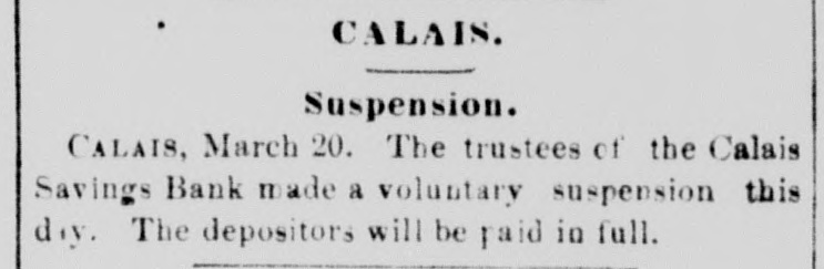 . CALAIS. Suspension. CALAIS, March 20. The trustees of the Calais Savings Bank made a voluntary suspension this day. The depositors will be paid in full.