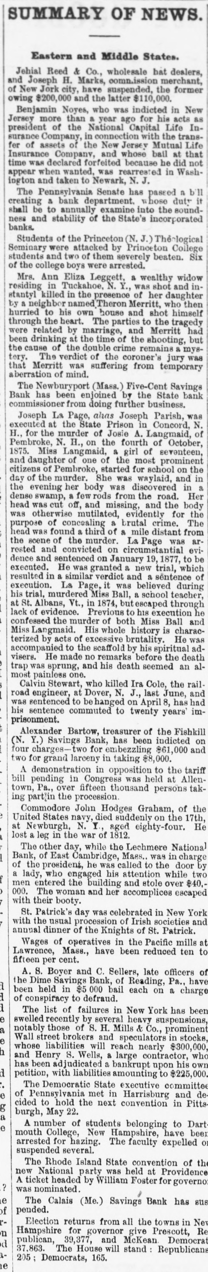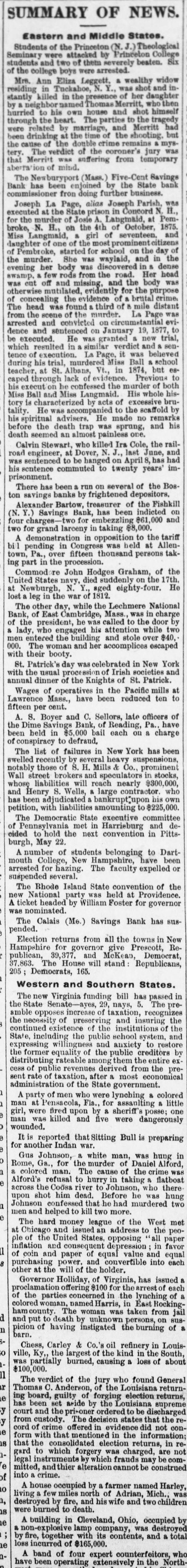 SUMMARY OF NEWS. Eastern and Middle States. Students of the Princeton (N. Theological Seminary were attacked by Princeton College students and two of them severely beaten. Six of the college boys were arrested. Mrs. Ann Eliza Leggett, & wealthy widow residing in Tuckahoe, N. Y., was shot and instantly killed in the presence of her daughter by neighbor named Thomas Merritt, who then hurried to his own house and shot himself through the heart. The parties to the tragedy were related by marriage, and Merritt had been drinking at the time of the shooting. but the cause of the double crime remains & mystery. The verdict of the coroner's jury was that Merritt was suffering from temporary aberrati of mind. The Newburyport (Mass.) Five-Cent Savings Bank has been enjoined by the State bank commissioner fron doing further business. Joseph La Page, alias Joseph Parish, was executed at the State prison in Concord N. H. for the murder of Josie A. Langmaid, at Pembroke, N. H., on the 4th of October, 1875. Miss Langmaid, a girl of seventeen. and daughter of one of the most prominent citizens of Pembroke, started for school on the day of the murder. She was waylaid, and in the evening her body was discovered in & dense swamp. a few rods from the road. Her head was out off and missing, and the body was otherwise mutilated, evidently for the purpose of concealing the evidence of brutal crime, The head was found & third of mile distant from the scene of the murder. La Page was arrested and convicted on circumstantial evidence and sentenced on January 19, 1877, to be executed. He was granted a new trial, which resulted in similar verdict and sentence of execution. La Page, it was believed during his trial, murdered Miss Ball & school teacher at St. Albans, Vt., in 1874. but 08caped through lack of evidence. Previous to his execut on he confessed the murder of both Miss Ball and Miss Langmaid. His whole history is characterized by acts of excessive brutality. He was accompanied to the scaffold by his spiritual advisers. He made no remarks before the death trap was sprung, and his death seemed an almost painless one. Calvin Stewart, who killed Ira Cole, the railroad engineer, at Dover, N. J., last June, and was sentenced to be hanged on April 8, has had prisonment. his sentence commuted to twenty years' imThere has been a run on several of the Boston savings banks by frightened depositors. Alexander Bartow, treasurer of the Fishkill (N. Y.) Savings Bank, has been indicted on four charges- for embezzling $61 000 and two for grand larceny in taking $8,000. A demonstration in opposition to the tariff bill pending in Congress was held at Allentown, Pa., over fifteen thousand persons taking part in the procession. Commod re John Hodges Graham, of the United States navy, died suddenly on the 17th, at Newburgh, N. Y., aged eighty-four. He lost a leg in the war of 1812. The other day, while the Lechmere National of Bank, of East Cambridge, Mass., was in charge the president, he was called to the door by & lady, who engaged his attention while two men entered the building and stole over $40, 000. with their The woman booty. and her accomplices escaped St. Patrick's day was celebrated in New York with the usual procession of Irish societies and annual dinner of the Knights of St. Patrick. Wages of operatives in the Pacific mills at Lawrence Mass., have been reduced ten to fifteen per cent. A. S. Boyer and C. Sellors, late officers of the Dime Savings Bank, of Reading, Pa., have been held in $5,000 bail each on a charge of conspiracy to defraud, The list of failures in New York has been swelled recently by several heavy suspensions, notably those of S. H. Mills & Co., prominent Wall street brokers and speculators in stocks, whose liabilities will reach nearly $800,000, and Henry S. Wells, & large contractor. who has been adjudicated a bankrupt"upon his own petition, with liabilities amounting to $225,000. The Democratic State executive committee of Pennsylvania met in Harrieburg and decided to hold the next convention in Pittsburgh, May 22. A number of students belonging to Dartmouth College, New Hampshire, have been arrested for hazing. The faculty expelled or suspended several. The Bhode Island State convention of the new National party was held at Providence. A was ticket nominated. headed by William Foster for governor pended. The Calais (Me.) Savings Bank has susElection returns from all the towns in New Hampshire for governor give Prescott, Republican, 39,377. and McKeau, Democrat, 37.863. The House will stand Republicans, 205; Democrats, 165. Western and Southern States. The new Virginia funding bill has passed in the State Senate-ayes, 29, nays, 5. The amble opposes increase of taxation, recognizes prethe necessity of preserving and insuring the continued existence of the institutions of the State, including the public school system, and expressing willingness and anxiety to the former equality of the public creditors restore distributing rateable among them the entire ex by cess of public revenues derived from the sent rate of taxation, after a most economical preadministration of the State government. A party of men who were lynching a colored man at Pensacola, Fla., for assaulting a little girl, were fired upon by a sheriff's posse; man wounded. was killed and five were dangerously one It is reported that Sitting Bull is preparing for another Indan war. Gus Johnson, a white man, was hung in Rome, Ga., for the murder of Daniel Alford, a colored man. The cause of the crime was Alford's refusal to hurry in taking a flatboat across the Coosa river to Johnson, who there Johnson upon shot him dead. Before he was hung confessed that he had murdered two men and helped to kill two more. The hard money league of the West met at Chicago and issued an address to the ple of the United States, opposing all peoinflation and consequent depression in paper favor of coin and paper of equal value and equal 8 purchasing power. a
