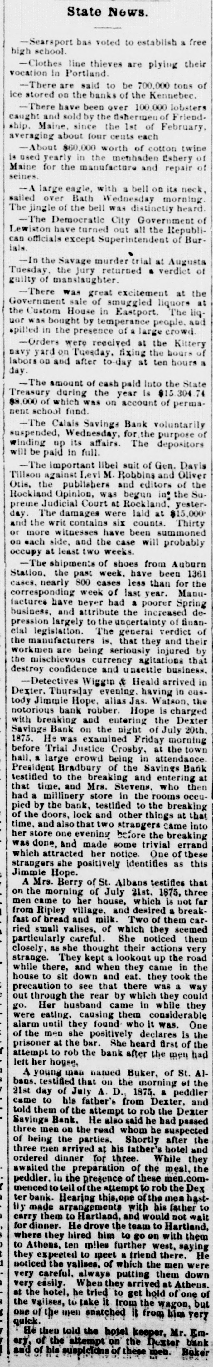 State News. -Searsport bas voted to establish a free high school. -Clothes line thieves are plying their vocation In Portland. -There are said to be 700,000 tons of Ice stored on the banks of the Kennebec. -There have been over 100.000 lobsters caught and sold by the disherment of Friendship. Maine, since the 1st of February, averaging about four cents each -About $60,000 worth of cotton twine is used yearly in the metihaden Eshery of Maine for the manufacture and repair of seines. -A large eagle, with a bell on its neck, sailed over Bath Wednesday morning. The jingle of the bell was distinctly heard. -The Democratic City Government of Lewiston have turned out all the Republican officials except Superintendent of Burials. -In the Savage murder trial at Augusta of verdict Tuesday, the jury returned guilty of manslaughter. -There was great excitement at the Government sale of smuggled liquors at the Custom House in Eastport. The liquor was bought by temperance people. and spilled in the presence of a large crowd. -Orders were received at the Kittery navy yard on Tuesday, fixing the hours of labors on and after to-day at ten hours a day. -The amount of cash paid Into the State Treasury during the year is $15 304 74 $8,000 of which was on account of permanent school fund. -The Calais Savings Bank voluntarily suspended, Wednesday, for the purpose of winding up its affairs. The depositors will be paid in full. -The important libel suit of Gen. Davis Tillson against Levi M. Robbins and Oliver Otis, the publishers and editors of the Rockland Opinlon, was begun in: the Supreme Judicial Court at Rockland. yesterday. The damages were laid at $15,000 and the writ contains six counts. Thirty or more witnesses have been summoned on each side, and the case will probably occupy at least two weeks. -The shipments of shoes from Auburn Station. the past week. have been 1361 cases, nearly 800 cases less than for the corresponding week of last year. Manufactures have never had a poorer Spring business, and attribute the increased depression largely to the uncertainty of financlal legislation. The general verdict of the manufacturers is, that they and their workmen are being seriously injured by the mischievous currency agitations that destroy confidence and unsettle business. -Detectives Wiggin & Heald arrived in Dexter, Thursday evening. having in oustody Jimmie Hope, alias Jas. Watson, the notorious bank robber. Hope is charged with breaking and entering the Dexter Savings Bank on the night of July 20th. 1875. He was examined Friday morning before Trial Justice Crosby, at the town hall, a large crowd being in attendance. President Bradbury of the Savings Bank testified to the breaking and entering at that time, and Mrs. Stevens, who then had a millinery store In the rooms occupied by the bank, testified to the breaking of the doors, lock and other things at that time, and also that two strangers Came into her store one evening before the breaking was done, and made some trivial errand which attracted her notice. One of these strangers she positively identifies as this Jimmie Hope. A Mrs. Berry of St. Albans testifies that on the morning of July 21st. 1875, three men came to her house, which is not far from Ripley village, and desired a breakfast of bread and milk. Two of them carried small valises, of which they seemed particularly careful. She noticed them closely, as she thought their actions very strange. They kept a lookout up the road while there, and when they came in the house to sit down and eat. they took the precaution to see that there was a way out through the rear by which they could go. Her husband came in while they were eating, causing them considerable alarm until they found who it was. One of the men she positively declares is the prisoner at the bar. She heard first of the attempt to rob the bank after the men had left her house, A young man named Buker, of St. Albans. testified that on the morning of the 21st day of July A. D., 1875. a peddler came to his father's from Dexter, and told them of the attempt to rob the Dexter Savings Bank. He also said he had passed three men on the read whom he suspected of being the parties. Shortly after the three men arrived at his father's hotel and ordered dinner for three. While they awaited the preparation of the meal, the peddler, in the presence of these commenced to tell of the attempt to rob the Dex ter bank. Hearing this,ope of the mea hastBy made arrangements with his father to carry them to Hartland, and would not wait for dinner. He drove the team to Hartland, where they hired him to go on with them to Athens, ten miles further west, saying they expected to meet a friend there. He noticed the valises, of which the men were very careful, always putting them down very easily. When they arrived at Athens. at the hotel, he tried to get hold of one of the valises, to take it from the wagon, but quick. one of the men snatched it from him very