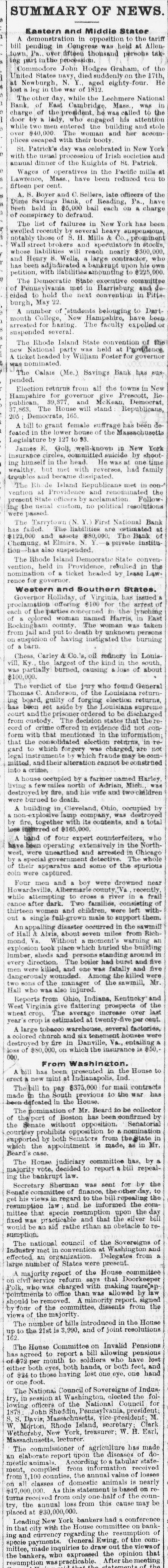 United States DRVY, died suddenly on the 17th, Newburgh N.Y. aged eighty four. He is leg in the war of 1812. The other day, while the Lechmere National Bank of East Cambridge Mass. was in charge of the president he was called to the door by a lady, who engaged his attention while two men entered the building and stole $40,000 The woman and her accomplices escaped with their booty St. Patrick's day was celebrated in New York with the usual procession of Irish societion and annual dinner of the Knights of St. Patrick Wages of operatives in the Pacific mills at Lawrence, Mass. have been reduced ten to fifteen per cent. A., S. Boyer and C. Sellers, late officers of the Dime Savings Bank, of Reading, Pa., have been held in $5,000 bail each on A charge comspiracy to defraud. The list of failures in New York has been swelled recently by several heavy suspensions, notably those of 8. H. Mills & Co., prominent street brokers and speculators in stocks, whose liabilities will reach nearly $300,000, and Henry B. Wells, large contractor, who been adjudicated bankrupt upon his OWN petition, with liabilities amounting to $225,000. The Democratic State executive committee Pennsylvania met in Harrisburg and docided to hold the next convention in Pittsburgh, May 22. A number of students belonging to Dartmouth College, New Hampshire, have been arrested for having. The faculty expelled or suspended several The Rhode Island State convention of the National party was held at Providence ticket headed by William Foster for governor nominated The Calais (Me.) Savings Bank has sus. pended. Election returns from all the towns in New Hampshire for governor give Prescott, Republican, 39,877 and McKean, Democrat, 863, The House will stand Republicans, Democrats, 165. A bill to grant female suffrage has been defeated in the lower house of the Massachusetts Legislature by 127 to 93. James E. Golf, well-known in New York nsurance circles, committed suicide by shoothimself in the head. He was at one time realthy but met with reverses, had family roubles and became dissipated. The Rh de Island Republicans met in convention at Providence and renominated the resent State officers by acclamation Followthe usual custom, no political resolutions vere passed The Tarrytown (N. Y. First National Bank failed. The liabilities are estimated at 122,000 and assets $80,000. The Bank of homung at Elmira, N. Y. . private instituhas also suspended. The Rhode Island Democratic State convenention, held in Providence resulted in the omination of ticket headed by Isanc Lawonce for governor. Western and Southern States. Governor Holliday, of Virginia, has instied roclamation offering 8100 for the arrest of of the parties concerned m the lynching & colored woman named Harris, in East lockingham county The woman was taken rom jail and put to death by unknown persons suspicion of having instigated the burning barn. Chess, Carley & Co. 's, oil rednery in LouisKy the largest of the kind in the south, partially burned, causing loss of about 100,000. The verdict of the jury who found General Thomas C. Anderson, of the Louisiana returnboard, guilty of forging election returns, been set aside by the Louisiana supreme ourt and the prisoner ordered to be discharged rom custody. The decision states that thereord of crime offered in evidence did not conorm with that mentioned in the information the consolidated election returns, in reand to which forgery was charged. are not instruments by which frauds may be coinnitted and their alteration cannot be construed crime. A house occupled by & farmer named Harley lving few miles north of Adrisn, Mich. was lestroyed by fire, and his wife and two children burned to death. A building in Cleveland, Ohio, occupied by on-explosive Ismp company, was destroyed fire, together with its contents, and a total insurred of $165,000. A band of four expert counterfeiters, who been operating extensively in the Northrest, were unearthed and arrested in Chicago special government detective. The whole their apparatus and some of the spurious were captured. Four men and a boy were drowned near Iowardsville, Albermarle county (Va recently. while attempting to cross river in frail anoe after dark. Two families, consisting of hirteen women and children. were left withsingle full-grown male to support them. An appalling disaster occurred in the sawmill Hall Alvis, about seven miles from Richsond, Va. Without moment's warning an xplomion took place which burled the building umber, sheds and persons standing around in very direction. The boiler had burst and five were killed, and one was fatally and five langerously wounded. Among the killed were sons of the manager of the sawmill, Mr. who was also injured. Reports from Ohio, Indiana, Kentucky and Vest Virginia give flattering prospects of the theat crop. The average increase over last crop is estimated at twenty five per cent. A large tobacco warehouse, several factories, colored church and SIX tenement houses were estroyed by fire in Danville, Va., entailing of $80,000, on which the insurance is $50,From Washington. A bill has been presented in the House to a new mint at Indianapolis, Ind. The bill to pay $375,000 for mail contracts iade in the South previous to the war has defeated in the House. The nomination of Mr. Beard to be collector the port of Boston has been confirmed by Senate without opposition. Senatorial ourtesy prohibits opposition to A nomination apported by both Senators from the State in hich the appointment in made, as in Mr. case. The House judiciary committee has, by & majority vote, decided to report a bill repealthe bankrupt law. Secretary Sherman was sent for by the enate of finance, the other day, to his views in regard to the bill repealing the esumption law and he informed the comlittee that specie resumption upon the day xed was practicable and that the silver bill ould be an aid rathe rthan an obstacle to reumption. The national council of the Sovereigns of 