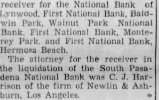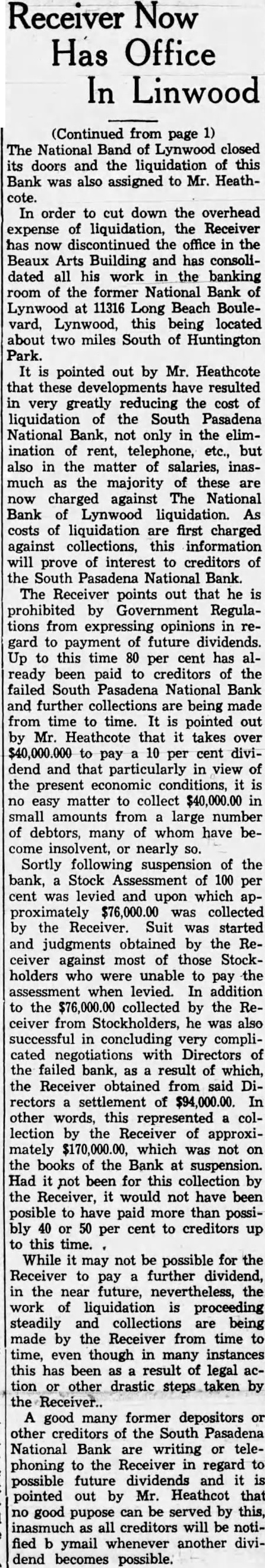Receiver Now Has Office In Linwood (Continued from page 1) The National Band of Lynwood closed its doors and the liquidation of this Bank was also assigned to Mr. Heathcote. In order to cut down the overhead expense of liquidation, the Receiver has now discontinued the office in the Beaux Arts Building and has consolidated all his work in the banking room of the former National Bank of Lynwood at 11316 Long Beach Boulevard, Lynwood, this being located about two miles South of Huntington Park. It is pointed out by Mr. Heathcote that these developments have resulted in very greatly reducing the cost of liquidation of the South Pasadena National Bank, not only in the elimination of rent, telephone, etc., but also in the matter of salaries, inasmuch as the majority of these are now charged against The National Bank of Lynwood liquidation. As costs of liquidation are first charged against collections, this information will prove of interest to creditors of the South Pasadena National Bank. The Receiver points out that he is prohibited by Government Regulations from expressing opinions in regard to payment of future dividends. Up to this time 80 per cent has already been paid to creditors of the failed South Pasadena National Bank and further collections are being made from time to time. It is pointed out by Mr. Heathcote that it takes over $40,000.000 to pay a 10 per cent dividend and that particularly in view of the present economic conditions, it is no easy matter to collect $40,000.00 in small amounts from a large number of debtors, many of whom have become insolvent, or nearly so. Sortly following suspension of the bank, a Stock Assessment of 100 per cent was levied and upon which approximately $76,000.00 was collected by the Receiver. Suit was started and judgments obtained by the Receiver against most of those Stockholders who were unable to pay the assessment when levied. In addition to the $76,000.00 collected by the Receiver from Stockholders, he was also successful in concluding very complicated negotiations with Directors of the failed bank, as a result of which, the Receiver obtained from said Directors a settlement of $94,000.00. In other words, this represented a collection by the Receiver of approximately $170,000.00, which was not on the books of the Bank at suspension. Had it not been for this collection by the Receiver, it would not have been posible to have paid more than possibly 40 or 50 per cent to creditors up to this time. While it may not be possible for the Receiver to pay a further dividend, in the near future, nevertheless, the work of liquidation is proceeding steadily and collections are being made by the Receiver from time to time, even though in many instances this has been as a result of legal action or other drastic steps taken by the Receiver.. A good many former depositors or other creditors of the South Pasadena National Bank are writing or telephoning to the Receiver in regard to possible future dividends and it is pointed out by Mr. Heathcot that no good pupose can be served by this, inasmuch as all creditors will be notified b ymail whenever another dividend becomes possible.