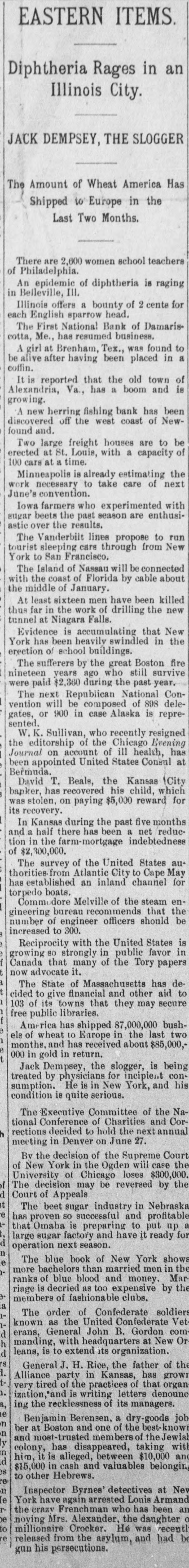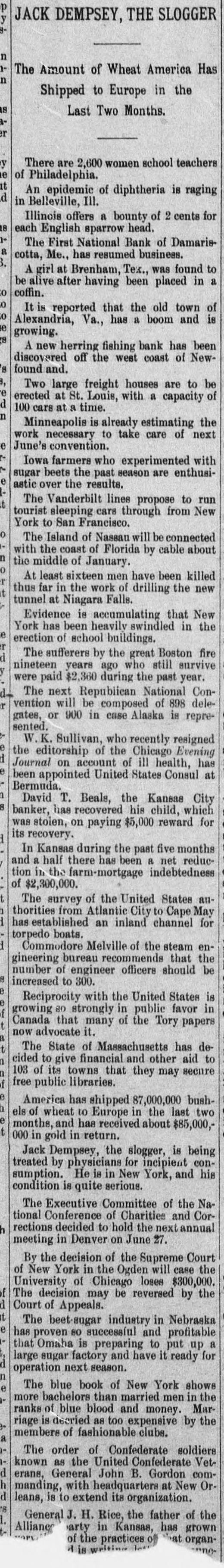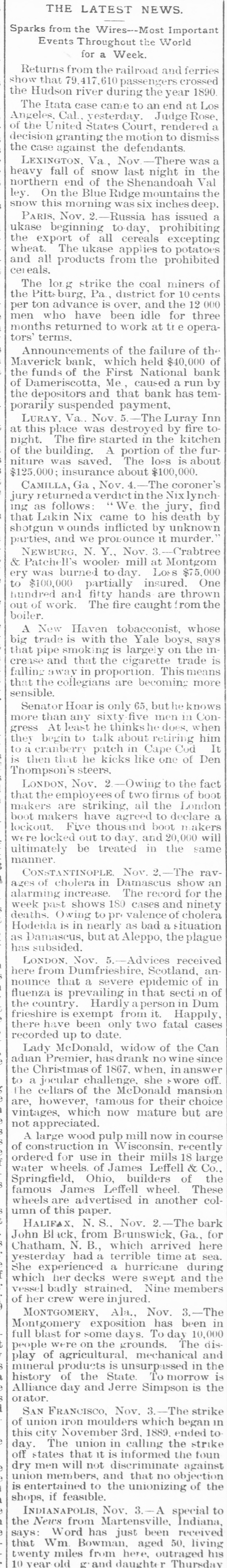 THE WIDE WORLD. GENERAL TELEGRAPHIC AND CABLE CULLINGS Of Brief Items of Interest From Various Sources. A London cablegram says: In the court of appeals the Maybrick case was commenced Monday. Dispatches of Sunday say that destructive prairie fires are sweeping the country between Monon, Ill,, and Chicago. Simonson & Weiss, cloak manufacturers at Green and Canal streets, New York, failed Saturday. Liabilities estimated at $180,000. The firm began business in 1870. Patrick McDermott, McCarthyite candidate, has been elected without opposition to the seat in the house of commons for no th Kilkenney, left vacant by the death of Sir John Hennessey. The treasury department, at the request of Secretary Blaine, directed the New Orleans customs colleetor to extend the usual courtesies to Mrs. Montt, wife of the Chilean minister, who arrived there Thursday morning, The statement prepared at the treasury department shows that there was a net incresse in circulation during the month of October of $33,310,125, and a net increase of $9,182,403 in money and bullion in the treasury during the same period. The announcement of the failure of the Maverick bank, which had $40,000 of the funds of the First National bank of Damariscotta, Me., caused a run by depositors Tuesday and the bank has temporarily suspended payment. The bank is perfectly solvent. A London cablegram says: Owing to the fact that the employes of two firms of bootmakers are striking, all London bootmakers have agreed to declare a lock-out. Five thousand bootmakers were locked out Monday and 20,000 will ultimately be treated in the same manner. President Potter, of the American bank WHS arranged before United States Commissioner Hallett, at Boston, Mass., Tuesday, and pleaded not guilty. His bail was fixed at $200,000 and that of Jonas French at $100,000. Dana is out on $60,000 bail. A Dublin cablegram of Tuesday says: The United Ireland prints another letter from the late Mr. Parnell's mother appealing to Irishmen to vote for Parnell candidates and adding that their great rallying cry must be "Remember Parnell and his murderers." A San Francisco dispatch of Wednesday say The following Chincse advices have been received by the steamer City of Rio Janeiro: Particulars of a serious riot in the province of Fukien have reached Hong Kong. The scene of the trouble is Tehbua, which was attacked and captured by 8,000 insurgents. A cablegram of Monday from Constantinople reports that ravages of cholera in Damascus show an alarming increase. The record for the week past shows 180 cases and ninety deaths. Owing to the prevalence of cholera, Hodeida is in nearly as bad a situation as Damascus, but at Aleppo the plague has subsided. The bark Liberia sailed from New York Saturday morning with fixty-six negro colonists for Liberia. Only thirty-three of them are adults. They go under the auspices of the American Colonization Society, which def:ays expenses of разваgе and of maintenance for several months after they reach their destination. The debt statement, issued from Washing Monday, shows that the interest and non-interest-bearing debt decreased durOctober this being brought about by a reduction of $2,918.060 in debt on bonds, the interest on which has ceased, and $1.109,467 in the debt bearing no. interest. The interest-bearing debt has actually increased $2,000. The total interest-bearing debt outstanding is $585,026,720. Fire broke out in Lorillard's tobacco factory at Jersey City, N. J., Monday morning, on the top fioor of the brick building used as a drying room for tobacco in the first process of manufacture. Fifty thousand pounds of tobacco were stored there. It was worth $10,000, and was totally destroyed. The damage by the fire to that floor was $10,000, and the d mage to the building and the floors below was $25,000. The loss was entirely covered by insurance. A Washington dispatch of Wednesday says: Notices of intention to contest the right to the seats of six members-elect to the house of representatives in the fifty-second congress, have been filed the clerk of the house. They are as follows: Noyes, republican, will contest Rockwell's seat from the twenty-eighth New York; Miller, republican, contests Ellio't from the seventh South Carolina, and McDuffle, republican, contests Turpin's from the fourth Alabama district. from