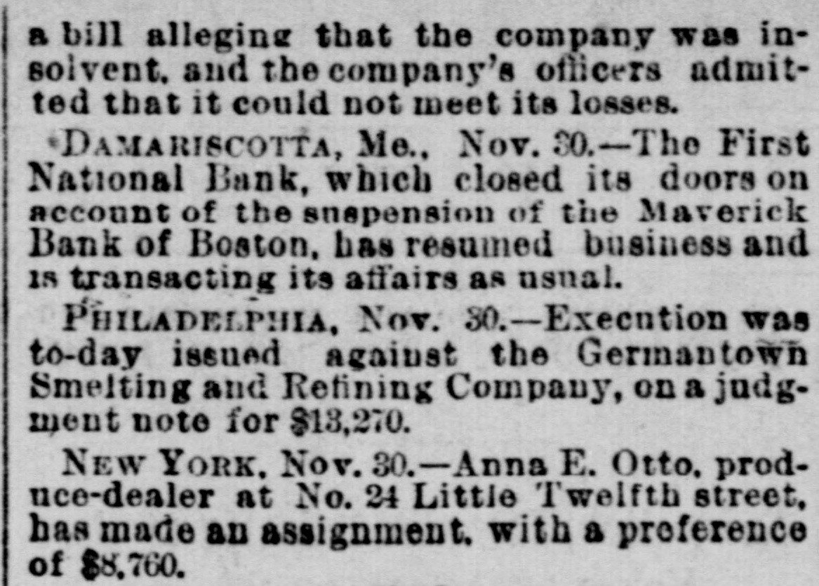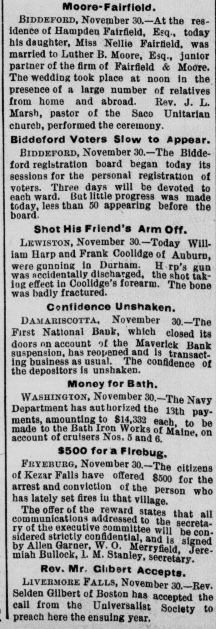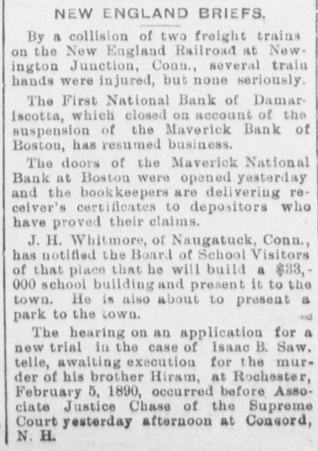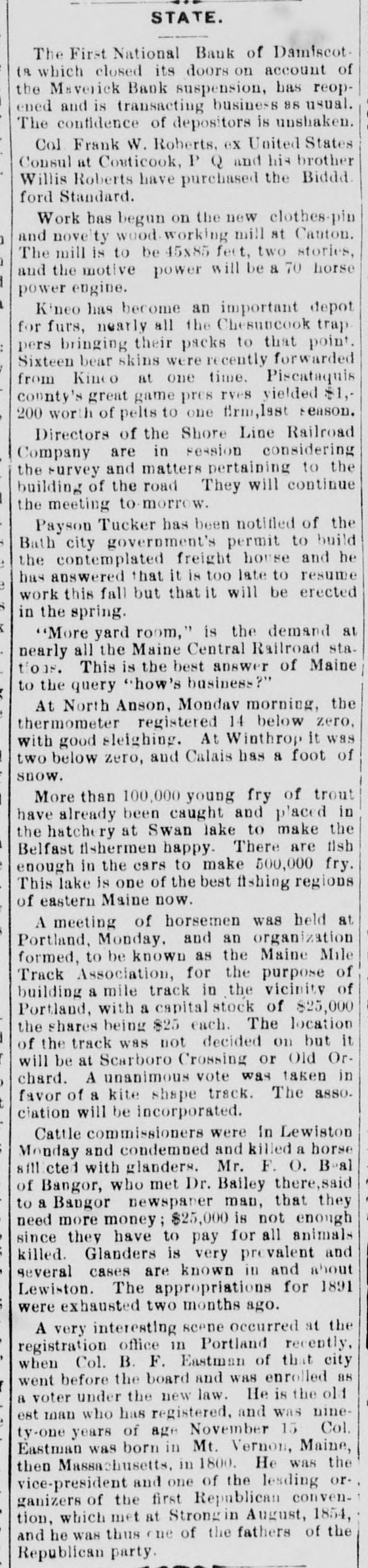 THE WIDE WORLD. GENERAL TELEGRAPHIC AND CABLE CULLINGS Of Brief Items of Interest From Various Sources. A London cablegram says: In the court of appeals the Maybrick case was commenced Monday. Dispatches of Sunday say that destructive prairie fires are sweeping the country between Monon, Ill,, and Chicago. Simonson & Weiss, cloak manufacturers at Green and Canal streets, New York, failed Saturday. Liabilities estimated at $180,000. The firm began business in 1870. Patrick McDermott, McCarthyite candidate, has been elected without opposition to the seat in the house of commons for no th Kilkenney, left vacant by the death of Sir John Hennessey. The treasury department, at the request of Secretary Blaine, directed the New Orleans customs colleetor to extend the usual courtesies to Mrs. Montt, wife of the Chilean minister, who arrived there Thursday morning, The statement prepared at the treasury department shows that there was a net incresse in circulation during the month of October of $33,310,125, and a net increase of $9,182,403 in money and bullion in the treasury during the same period. The announcement of the failure of the Maverick bank, which had $40,000 of the funds of the First National bank of Damariscotta, Me., caused a run by depositors Tuesday and the bank has temporarily suspended payment. The bank is perfectly solvent. A London cablegram says: Owing to the fact that the employes of two firms of bootmakers are striking, all London bootmakers have agreed to declare a lock-out. Five thousand bootmakers were locked out Monday and 20,000 will ultimately be treated in the same manner. President Potter, of the American bank WHS arranged before United States Commissioner Hallett, at Boston, Mass., Tuesday, and pleaded not guilty. His bail was fixed at $200,000 and that of Jonas French at $100,000. Dana is out on $60,000 bail. A Dublin cablegram of Tuesday says: The United Ireland prints another letter from the late Mr. Parnell's mother appealing to Irishmen to vote for Parnell candidates and adding that their great rallying cry must be "Remember Parnell and his murderers." A San Francisco dispatch of Wednesday say The following Chincse advices have been received by the steamer City of Rio Janeiro: Particulars of a serious riot in the province of Fukien have reached Hong Kong. The scene of the trouble is Tehbua, which was attacked and captured by 8,000 insurgents. A cablegram of Monday from Constantinople reports that ravages of cholera in Damascus show an alarming increase. The record for the week past shows 180 cases and ninety deaths. Owing to the prevalence of cholera, Hodeida is in nearly as bad a situation as Damascus, but at Aleppo the plague has subsided. The bark Liberia sailed from New York Saturday morning with fixty-six negro colonists for Liberia. Only thirty-three of them are adults. They go under the auspices of the American Colonization Society, which def:ays expenses of разваgе and of maintenance for several months after they reach their destination. The debt statement, issued from Washing Monday, shows that the interest and non-interest-bearing debt decreased durOctober this being brought about by a reduction of $2,918.060 in debt on bonds, the interest on which has ceased, and $1.109,467 in the debt bearing no. interest. The interest-bearing debt has actually increased $2,000. The total interest-bearing debt outstanding is $585,026,720. Fire broke out in Lorillard's tobacco factory at Jersey City, N. J., Monday morning, on the top fioor of the brick building used as a drying room for tobacco in the first process of manufacture. Fifty thousand pounds of tobacco were stored there. It was worth $10,000, and was totally destroyed. The damage by the fire to that floor was $10,000, and the d mage to the building and the floors below was $25,000. The loss was entirely covered by insurance. A Washington dispatch of Wednesday says: Notices of intention to contest the right to the seats of six members-elect to the house of representatives in the fifty-second congress, have been filed the clerk of the house. They are as follows: Noyes, republican, will contest Rockwell's seat from the twenty-eighth New York; Miller, republican, contests Ellio't from the seventh South Carolina, and McDuffle, republican, contests Turpin's from the fourth Alabama district. from