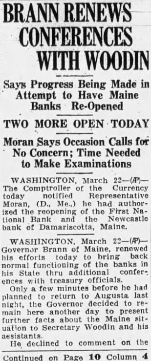 BRANN RENEWS CONFERENCES WITH WOODIN Says Progress Being Made in Attempt to Have Maine Banks Re-Opened TWO MORE OPEN TODAY Moran Says Occasion Calls for No Concern; Time Needed to Make Examinations The Comptroller of the Currency today notified Representative Moran, (D., Me.) he had authorized the reopening of the First NaLional Newcastle bank of Damariscotta, Maine. Governor Brann of Maine, renewed efforts today to bring back normal functioning of the banks in his State thru additional conferences with treasury officials Only minutes before he had planned return to Augusta last night, the Governor decided to main another day present further about Maine sitto Secretary Woodin and his He declined to comment on the Continued on Page 10 Column 4