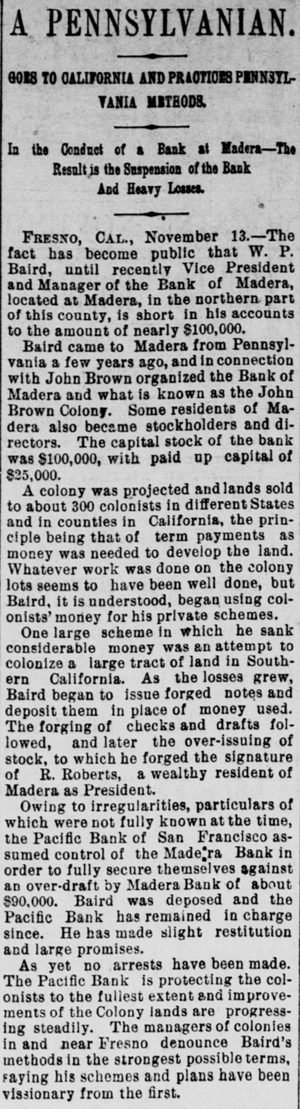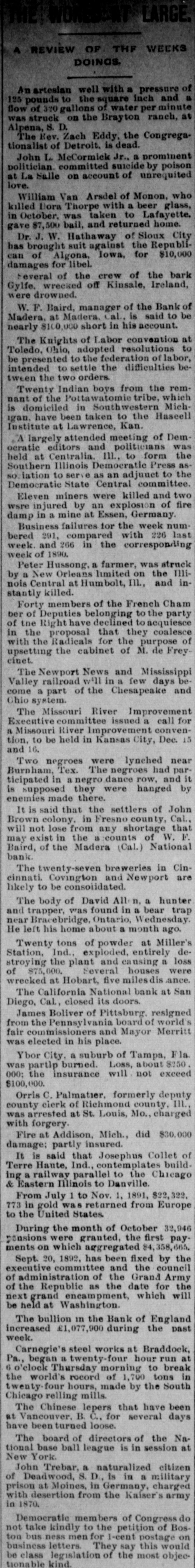 LARGE. A REVIEW OF THF WEEKS DOINGS. An artesian well with a pressure of 125 pounds to the square inch and a flow of 370 gallons of water per minute was struck on the Brayton ranch, at Alpena, S. D. The Rev. Zach Eddy, the Congregationalist of Detroit. dead. John L. McCormick Jr., a prominent politician. committed suicide by poison at La Salle on account of unrequited love. William Van Arsdel of Monon, who killed Dora Thorpe with a beer glass, in October, was taken to Lafayette. gave $7,500 bail, and returned home. Dr. J. W. Hathaway of Sloux City has brought suit against the Republican of Algona, Iowa, for $10,000 damages for libel. Feveral of the crew of the bark Gylfe, wrecked off Kinsale, Ireland, were drowned. W. F. Baird, manager of the Bank of Madera, at Madera. Cal., is said to be nearly $100,000 short in his account. The Knights of Labor convention at Toledo, Ohio, adopted resolutions to be presented to the federation of labor, intended to settle the difficulties between the two orders. Twenty Indian boys from the remnant of the Pottawatomie tribe, which is domiciled in Southwestern Michigan, have been taken to the Haseell Institute at Lawrence, Kan. "A largely attended meeting of Democratic editors and politicians was held at Centralia. 111., to form the Southern Illinois Democratic Press asiation to serve as an adjunct to the Democratic State Central committee. Eleven miners were killed and two wsre injured by an explosion of fire damp in a mine at Essen, Germany. Business failures for the week numbered 291, compared with 226 last week and 266 in the corresponding week of 1890. Peter Hussong, a farmer, was struck by a New Orleans limited on the Illinois Central at Humbolt, III., and instantly killed. Forty members of the French Cham ber of Deputies belonging to the party of the Right have declined to acquiesce in the proposal that they coalesce with the Radicals for the purpose of upsetting the cabinet of M. de Freycinet. The Newport News and Mississippi Valley railroad will in a few days become a part of the Chesapeake and Chio system. The Missouri River Improvement Executive committee issued a call for a Missouri River Improvement convention, to be held in Kansas City, Dec. 15 and 16. Two negroes were lynched near Burnham, Tex. The negroes had participated in a negro dance row, and it is supposed they were hanged by enemies made there. It is said that the settlers of John Brown colony, in Fresno county, Cal., will not lose from any shortage that may exist in the a counts of W. F. Baird, of the Madera (Cal.) National bank. The twenty-seven breweries in Cincinnati. Covington and Newport are likely to be consolidated. The body of David Allen, a hunter and trapper, was found in a bear trap near Bracebridge, Ontario, Wednesday. He left his home about a month ago. Twenty tons of powder at Miller's Station, Ind., exploded, entirely destroying the plant and causing a loss of $75,000. Several houses were wrecked at Hobart, five milesdis ance. The California National bank at San Diego, Cal, closed its doors. James Boliver of Pittsburg. resigned from the Pennsylvania board of world's fair commissioners and Mayor Merritt was elected in his place. Ybor City, a suburb of Tampa, Fla. was partlp burned. Loss, about $250. 000; the insurance will not exceed $100,000. Orris C. Palmatier, formerly deputy county clerk of Richmond county, III., was arrested at St. Louis, Mo., charged with forgery. Fire at Addison, Mich., did $30,000 damage; partly insured. It is said that Josephus Collet of Terre Haute, Ind., contemplates building a railway parallel to the Chicago & Eastern Illinois to Danville. From July 1 to Nov. 1, 1891, $22,322, 773 in gold was returned from Europe to the United States During the month of October 32,946 pensions were granted, the first payments on which aggregated 4,358,665. Sept. 20, 1892. has been fixed by the executive committee and the council of administration of the Grand Army of the Republic as the date for the next grand encampment, which will be held at Washington. The bullion in the Bank of England increased £1,077,900 during the past week. Carnegie's steel works at Braddock, Pa., began a twenty-four hour run at 6 o'clock Thursday morning to break the world's rocord of 1,700 tons in twenty-four hours, made by the South Chicago relling mills. The Chinese lepers that have been at Vancouver. B. C., for several days have been turned loose. The board of directors of the National base ball league is in session at New York. John Trebar, a naturalized citizen of Deadwood S. D in military