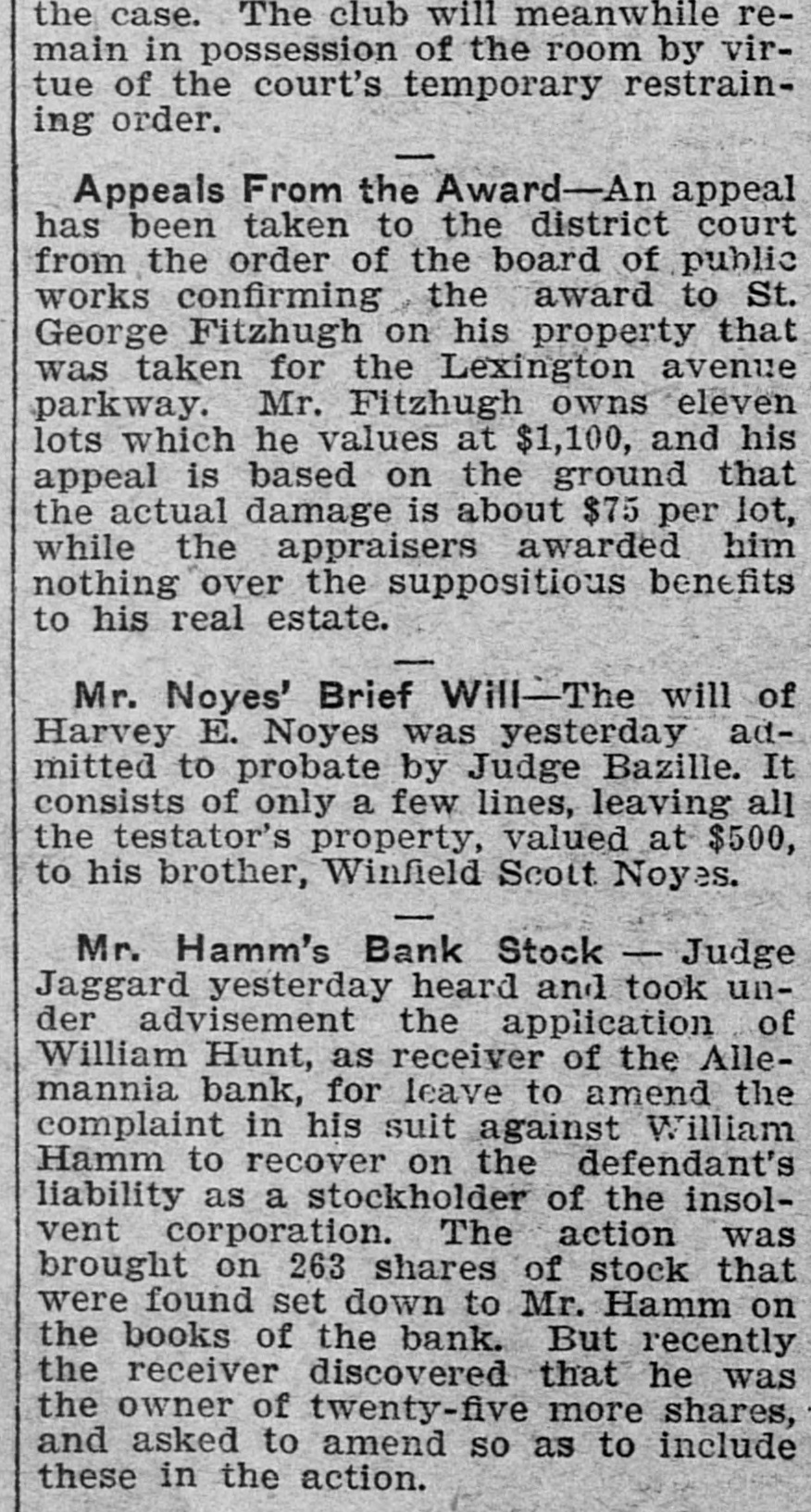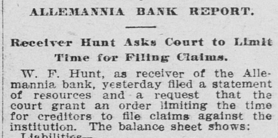 COURT NAMES RECEIVER WILLIAM F. HUNT IS PLACED IN CHARGE OF THE ALLEMANNIA BANK SALARY IS FIXED AT $1,500 Receiver Is Directed to Enforce Statutory Liability of Stockholders and Convert Assets Into Money. William F. Hunt was yesterday appointed receiver of the Allemannia bank by Judge Lewis of the district court. The appointment was made upon the application of W. B. Douglas, attorney general of this state. The court orders that said receiver shall file a bond for $15,000, to be signed by one or more good sureties, and that he shall take charge of the property of said institution and collect, sue for and recover the debts and demands now due, and if necessary, enforce the statutory individual liability of the stockholders of said bank. He shall also, as speedily as possible, convert the bank's property and effects into money and in due time, as the court may direct, apply the same to the debts of said bank. The court fixed the salary of the receiver at $1,500 a year, to be paid in monthly installments of $125.