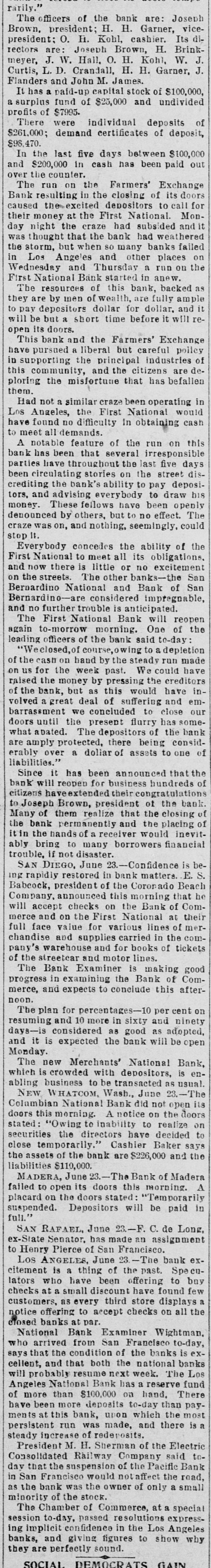 Joseph rarily." officers of the bank Garner, are: viceThe president; H. H. Its diBrown. H. Kohl, cashier. Brinkpresident; O. Brown, H. rectors are: Joseph Hall. O. H. Kohl, W. J. J. meyer, L. J. D. W. Crandall, H. H. Garner, and John M. a Curtis, paid-up James. of $100,000, Flanders capital stock undivided surplus It has a fund of $25,000 and of profits of $7995. individual deposits $261,000; There were demand certificates of deposit, $98,470. last five days between paid $100,000 out over the and In $200,000 the in cash has been counter. the Farmers' Exchange doors The resulting run on in the closing of to its call for Bank the-excited depositors Moncaused the First National. their money at craze had subsided and it day night the that the bank had banks weathered failed was thought but when so many places on the storm, Los Angeles and other a run on the in Wednesday and Bank Thursday started in anew. First National this bank, backed as resources of are fully ample it they The are by men of wealth, for dollar. and be will but to pay depositors a short dollar time before it will reopen This its bank doors. and the Farmers' but careful Exchange policy pursued a liberal industries of deploring this have in supporting community, the misfortune the and principal the that citizens has befallen are them. not a similar craze been National operating would in have Los Had Angeles, found no the difficulty First in obtaining cash to meet all demands. on this A notable feature several of the irresponsible run bank has the last parties have been throughout that on the street five days discirculating stories deposibeen the bank's ability to pay draw his crediting and advising everybody been to openly tors, These fellows have effect. The money. by others, but to no could stop denounced craze was on, and nothing, seemingly. the 11. concedes the ability obligations. of Everybody National to meet all its no excitement First there is little or banks-the San and now streets. The other Bank of San on Bernardino the National and impregnable, Bernardino trouble is considered anticipated. and no Bank of the The further First National morning. One will reopen to-morrow said to-day leading again officers of the bank owing to a depletion "Weclosed,of course, by the steady run made have the cash on hand past. We could on us the money by would have inof raised for the week as this pressing the creditors and emof the bank, but of suffering what barrassment we flurry has bank volved a great the deal present concluded to of close the some- our there doors until a pated. The depositors being considof erably are amply over protected, a doliar of assets to one the liabilities." has been announced hundreds that of Since will it reopen for business congratulations bank have extended their c bank. Brown, the closing of citizens to Joseph them realize president that the ot the placing of Many bank of permanently and would inevitably it in the the bring hands to of many a receiver borrowers financial betrouble. DIEGO, if not disaster. June Confidence matters. is E. S. ing SAN rapidly restored of in the bank Cororado Beach he Babcock, president announced this morning Bank of that ComCompany, accept checks on National the at their will merce and on the First various lines of merchandise full face and value supplies for for carried books in of the tickets comwarehouse and lines. streetear pany's and motor making good of The the Bank Examiner the is Bank of Commerce, progress and in expects examining to conclude this after10 and as good noon. The plan for percentages-10 more in sixty and per adopted, cent ninety on it is and days-is resuming considered expected the as bank will be open Monday. new Merchants' depositors, National Bank, is enThe is crowded with transacted as usual. abling its which business WHATCOM, to be Wash., June 23.-The open NEW Bank did not doors Colambian National A notice OD the on doors this "Owing morning. to inability have to decided realize to securities stated: the directors Cashier Baker says the the close assets temporarily." of the bank are $226,000 and June liabilities $110,000. The Bank morning. of Madera A MADERA, its doors this "Temporarily failed to open doors stated: be paid in suspended. placard on the Depositors will de C. 23.-F. Long, Senator. full." SAN RAFAEL June has made an assignment Francisco. is a ex-State to Henry Pierce of June San 23. -The bank Specu- exoffering Los ANGELES, thing of the past. to buy citement lators who small have discount been store have displays found few notice offering customers. checks at a as every to accept third checks on all the closed banks at par. Examiner Wightman. to-day, National Bank San Francisco is exwho arrived condition from of the national banks banks that the both the Los cellent, says and that resume next week. The fund will probably Bank has a hand. reserve There Angeles National $100,000 on than paymore than to-day most ments was of have been at this more bank, deposits made, upon which and there the is a persistent run redeposits. steady President increase M. Railway H. of Sherman Company of the said Electric Bank toConsolidated suspension of the Pacific the road, was bank day in San that Francisco the would the owner not affect of only a small as the of the stock. special Chamber of session minority The passed Commerce, resolutions at a express- Angeles to-day, in the Los why and sound. ing implicit confidence giving figures to show they banks, are perfectly DEMOCRATS GAIN SOCIAL