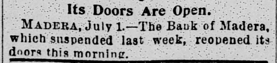 The Bank of Madera failed to open June 23, 1893 with a door notice Temporarily suspended. Depositors will be paid in full. It then reopened July 1, 1893. Articles place the closing in the context of a wider wave of bank runs/closures in California, but there is no explicit description of a run on this specific bank; classification therefore is a suspension (no run) followed by reopening.