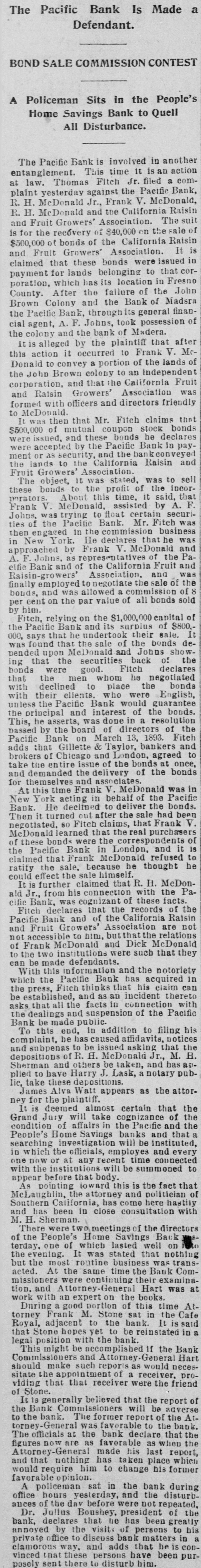 # The Pacific Bank Is Made a Defendant. # BOND SALE COMMISSION CONTEST # A Policeman Sits in the People's Home Savings Bank to Quell All Disturbance. The Pacific Bank is involved in another entanglement. This time it is an action at law. Thomas Fitch Jr. filed a complaint yesterday against the Pacific Bank, R. H. McDonald Jr., Frank V. McDonald, R. H. McDonald and the California Raisin and Fruit Growers' Association. The suit is for the recovery of $40,000 on the sale of $500,000 of bonds of the California Ratsin and Fruit Growers' Association. It is claimed that these bonds were issued in payment for lands belonging to that corporation, which has its location in Fresno County. After the failure of the John Brown Colony and the Bank of Madsra the Pacific Bank, through its general financial agent, A. F. Johns, took possession of the colony and the bank of Madera. It is alleged by the plaintiff that after this action it occurred to Frank V. McDonald to convey a portion of the lands of the John Brown colony to an independent corporation, and that the California Fruit and Raisin Growers' Association was formed with officers and directors friendly to McDonald. It was then that Mr. Fitch claims that $500,000 of mutual coupon stock bonds were issued, and these bonds he declares were accepted by the Pacific Bank in payment or as security, and the bank conveyed the lands to the California Raisin and Fruit Growers' Association. The object, it was stated, was to sell these bonds to the profit of the incorporators. About this time, it said, that Frank V. McDonald, assisted by A. F. Johns, was trying to float certain securities of the Pacific Bank. Mr. Fitch was then engaged in the commission business in New York. He declares that he was approached by Frank V. McDonald and A. F. Johns, as representatives of the Pacific Bank and of the California Fruit and Raisin-growers' Association, and was finally employed to negotiate the sale of the bouds, and was allowed a commission of 8 per cent on the par value of all bonds sold by him. Fitch, relying on the $1,000,000 capital of the Pacific Bank and its surplus of $800,000, says that he undertook their sale. It was found that the sale of the bonds depended upon McDonald and Johns showing that the securities back of the bonds were good. Fitch declares that the men whom he negotiated with declined to place the bonds with their clients, who were English, unless the Pacific Bank would guarantee the principal and interest of the bonds. This, he asserts, was done in a resolution passed by the board of directors of the Pacific Bank on March 13, 1893. Fitch adds that Gillette & Taylor, bankers and brokers of Chicago and London, agreed to take the entire issue of the bonds at once, and demanded the delivery of the bonds for themselves and associates. At this time Frank V. McDonald was in New York acting in behalf of the Pacific Bank. He declined to deliver the bonds. Then it turned out after the sale had been negotiated, so Fitch claims, that Frank V. McDonald learned that the real purchasers of these bonds were the correspondents of the Pacific Bank in London, and it is claimed that Frank McDonald refused to ratify the sale, because he thought he could effect the sale himself. It is further claimed that R. H. McDonald Jr., from his connection with the Pacific Bank, was cognizant of these facts. Fitch declares that the records of the Pacific Bank and of the California Raisin and Fruit Growers' Association are not not accessible to him, but that the relations of Frank McDonald and Dick McDonald to the two institutions were such that they can be made defendants. With this information and the notoriety which the Pacific Bank has acquired in the press, Fitch thinks that his claim can be established, and as an incident thereto asks that all the facts in connection with the dealings and suspension of the Pacific Bank be made public. To this end, in addition to filing his complaint, he has caused atidavits, notices and subpenas to be issued asking that the depositions of R. H. McDonald Jr., M. H. Sherman and others be taken, and has applied to have Harry J. Lask, a notary public, take these depositions. James Alva Watt appears as the attorney for the plaintiff. It is deemed almost certain that the Grand Jury will take cognizance of the condition of affairs in the Pacific and the People's Home Savings banks and that a searching investigation will be instituted, in which the officials, employes and every one now or at any recent time counected with the institutions will be summoned to appear before that body. As pointing toward this is the fact that McLaughlin, the attorney and politician of Southern California, has come here hastily and has been in close consultation with M. H. Sherman. There were two meetings of the directors of the People's Home Savings Back yesterday, one of which lasted well on ito the evening. It was stated that nothing but the most routine business was transacted. At the same time the Bank Commissioners were continuing their examination, and Attorney-General Hart was at work with an expert on the books. During a good portion of this time Attorney Frank M. Stone sat in the Cafe Royal, adjacent to the bank. It is said that Stone hopes yet to be reinstated in a legal position with the bank. This might be accomplished if the Bank Commissioners and Attorney-General Hart should make such reports as would necessitate the appointment of a receiver, providing that that receiver were the friend of Stone. It is generally believed that the report of the Bank Commissioners will be adverse to the bank. The former report of the Attorney-General was favorable to the bank. The officials at the bank declare that the figures now are as favorable as when the Attorney-General made his last report, and that nothing has taken place whien would require him to change his former favorable opinion. A policeman sat in the bank during office hours yesterday, and the disturbances o