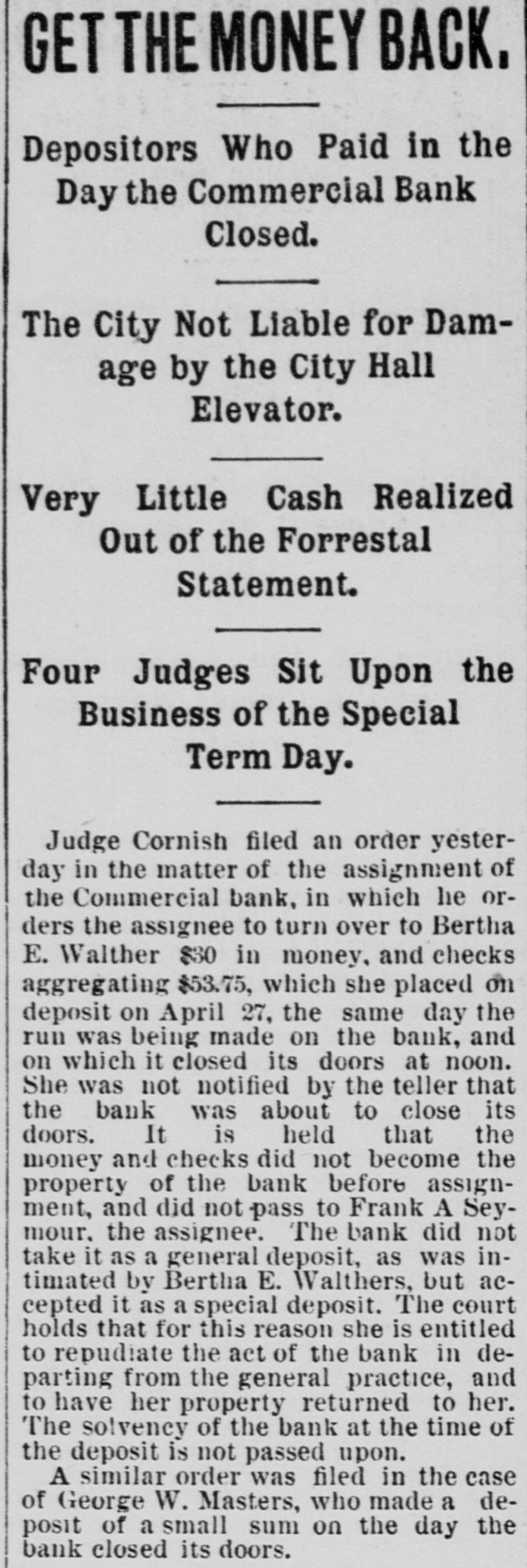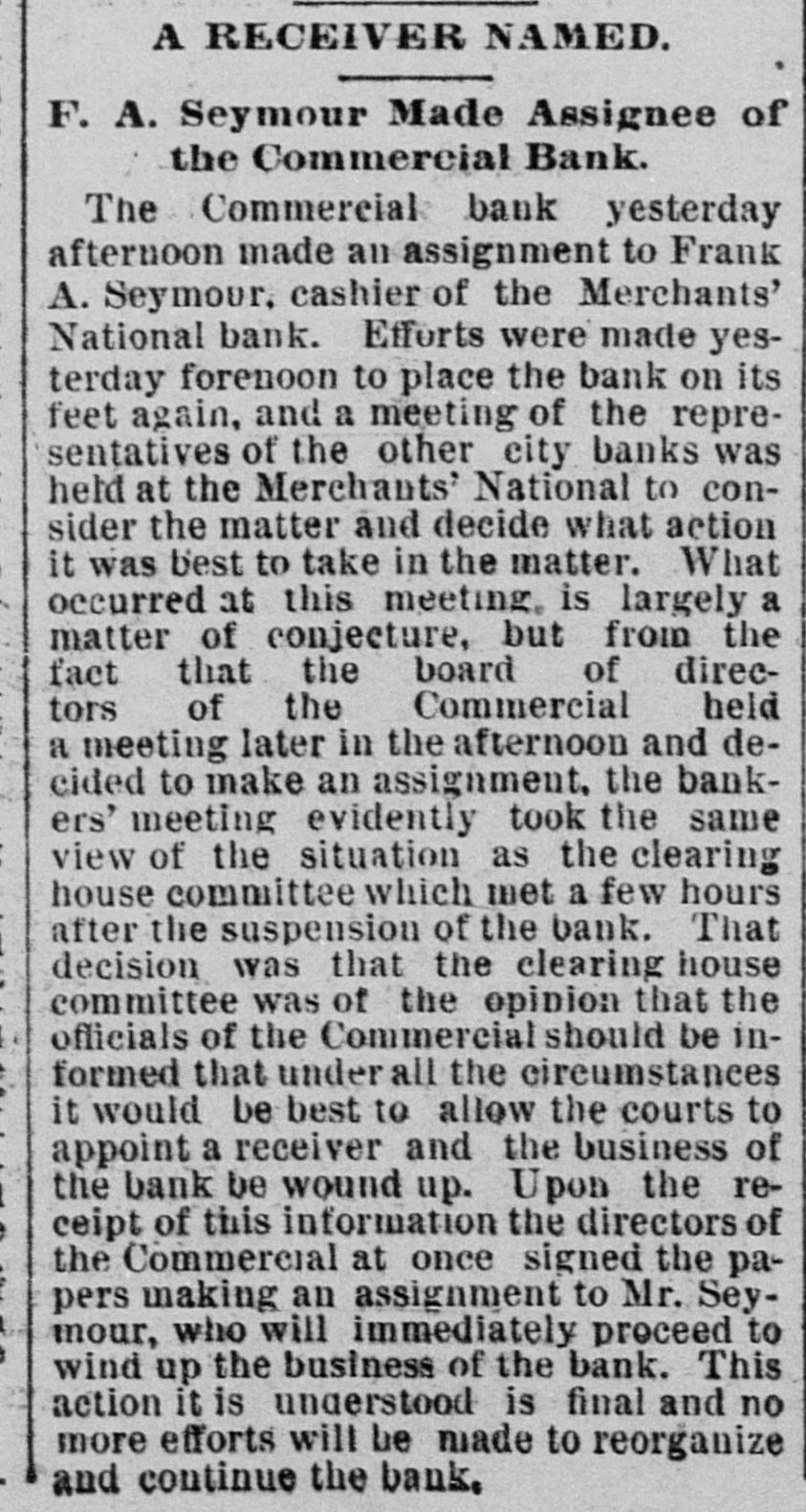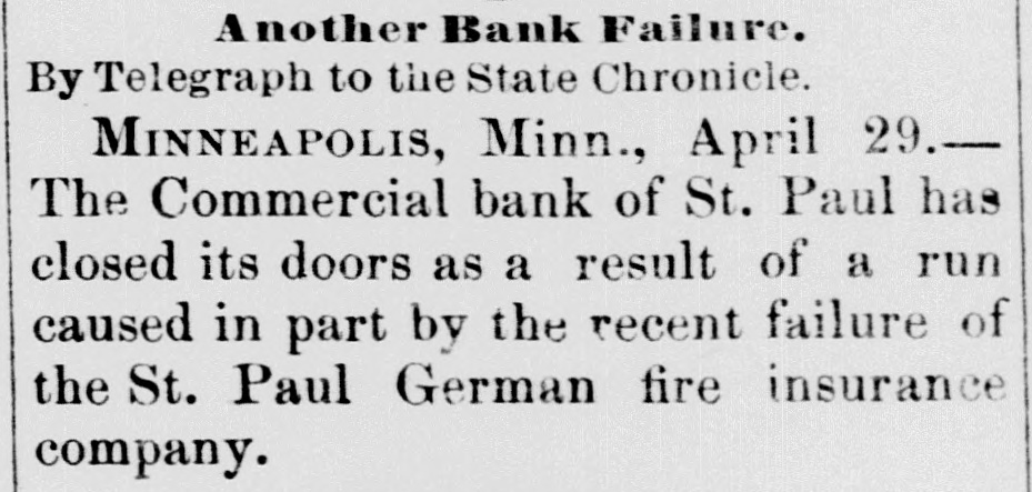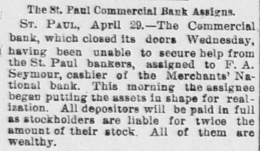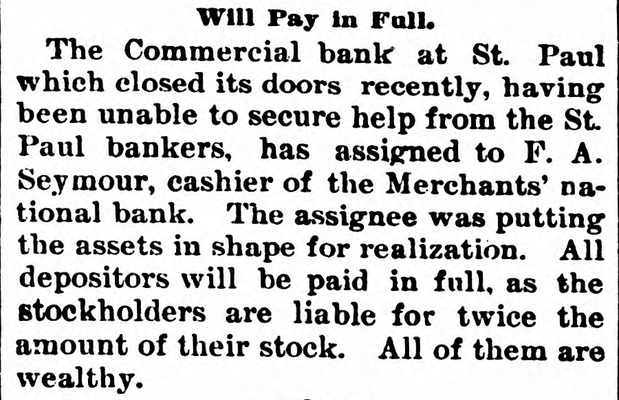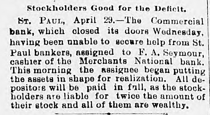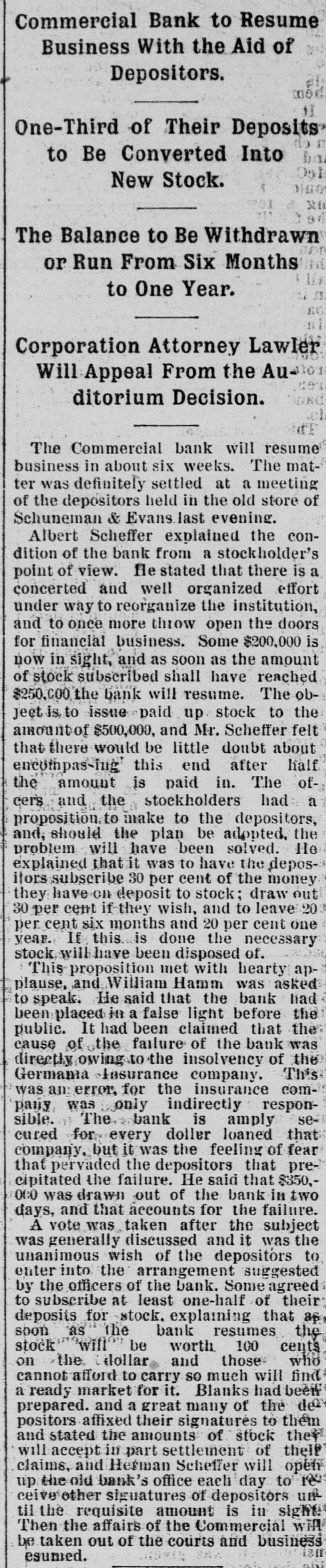 office of president in the insurance company, as well as the bank, alarmed some of the local banks throughout the Northwest having accounts with the Commercial, and they commenced withdrawing their funds. This in itself was not a matter of sufficient moment to Cause Any Trouble, but it speedily became known in the city and was whispered around among the many depositors, and the run was started. The Commercial bank on March 1 last had nearly $1,000,000 of deposits, belonging to over 1,400 different people. It has been a popular bank and an especial favorite with the smaller merchants, as will be seen from the number of the depositors, which is nearly twice as great as most banks with double the amount of deposits. On account of the great number of depositors the run was perhaps made a great deal worse than it would have been otherwise. The report furnished the papers last evening by the cashier, Herman Scheffer, shows that since the run commenced over $300,000 have been drawn out, the amount due depositors at the present time being $699,419.44, against which the bank shows assets in notes, real estate, bonds, etc., of $1,559,815.35. This apparent surplus is reduced, however, by rediscounts amounting to $276,912.60. The full statement of Herman Scheffer, the cashier of the suspended bank, follows: "It IS well known that banking business is largely founded on confidence. The fact that the German Insurance company, which lately closed its doors, has been generally supposed to be closely allied to the Commercial bank, Albert Scheffer being president of both Institutions, has, without reason, caused the opinion to become prevalent among the depositors that the future of the one Involved the Other. "This has caused a feeling of uncertainty among depositors, which has resulted in their withdrawing from the deposits over $300,000 in cash within the last few days. Today the run became so strong that the officers considered that justice to all depositors required them to suspend payment temporarily. The assets are ample for the protection of all depositors, and an effort is bring made to effect an arrangement by which the bank will be enabled to pay off its depositors speedily. Mr. Scheifer furnished the following statement of assets and liabilities: Liabilities $699,419 4 Due depositors Rediscounts 276,912 60 Total $976,352 Assets $1,559,815 Notes, real estate, etc At the commencement of business yesterday morning the bank officials had no idea that they would be obliged to close up. Aid from other banks had been promised and a considerable amount advanced. The clearing house association met yesterday morning, and after looking over the situation suspended the bank before the clearing hour. This was with the assent of Cashier Herman Scheffer, and was made necessary by the fact that the bank did not have the funds with which to meet the heavy drafts. When this news reached the bank the payment of all demands was continued for a time, several of the other banks having volunteered the funds. Some of this money was furnished, but several of the volunteers desired time to consult with their fellow officers, and this delay was fatal to the success of the plan. At 2 o'clock the members of the clearing house committee, which is made up of President W. B. Merriam, of the Merchants' National: E. H. Bailey, cashier of the First National, and WillJam Dawson Jr., cashier of the Bank of Minnesota, met in Gov. Merriam's private office and made an examination of the assets of the suspended bank. A good part of the afternoon was spent at this task, and when it was completed it was agreed that the board of directors of the Commercial bank should be advised that, under the circumstances, the clearing house committee is under the Impression that it will be best to allow the courts to Appoint a Receiver to wind up the business of the bank. The committee estimated that it would require $500,000 to help the bank through as the opening would precipitate another rush. The clearing house was willing to furnish $200,000, but not $500,000. While this decision of the clearing house does not settle the fate of the bank, it means that if it IS reopened the aid will have to be furnished from outside the members of the association. According to the vice president of the Commercial bank, E. A. Hendrickson, this adverse report of the clearing house is largely due to the idea given by the