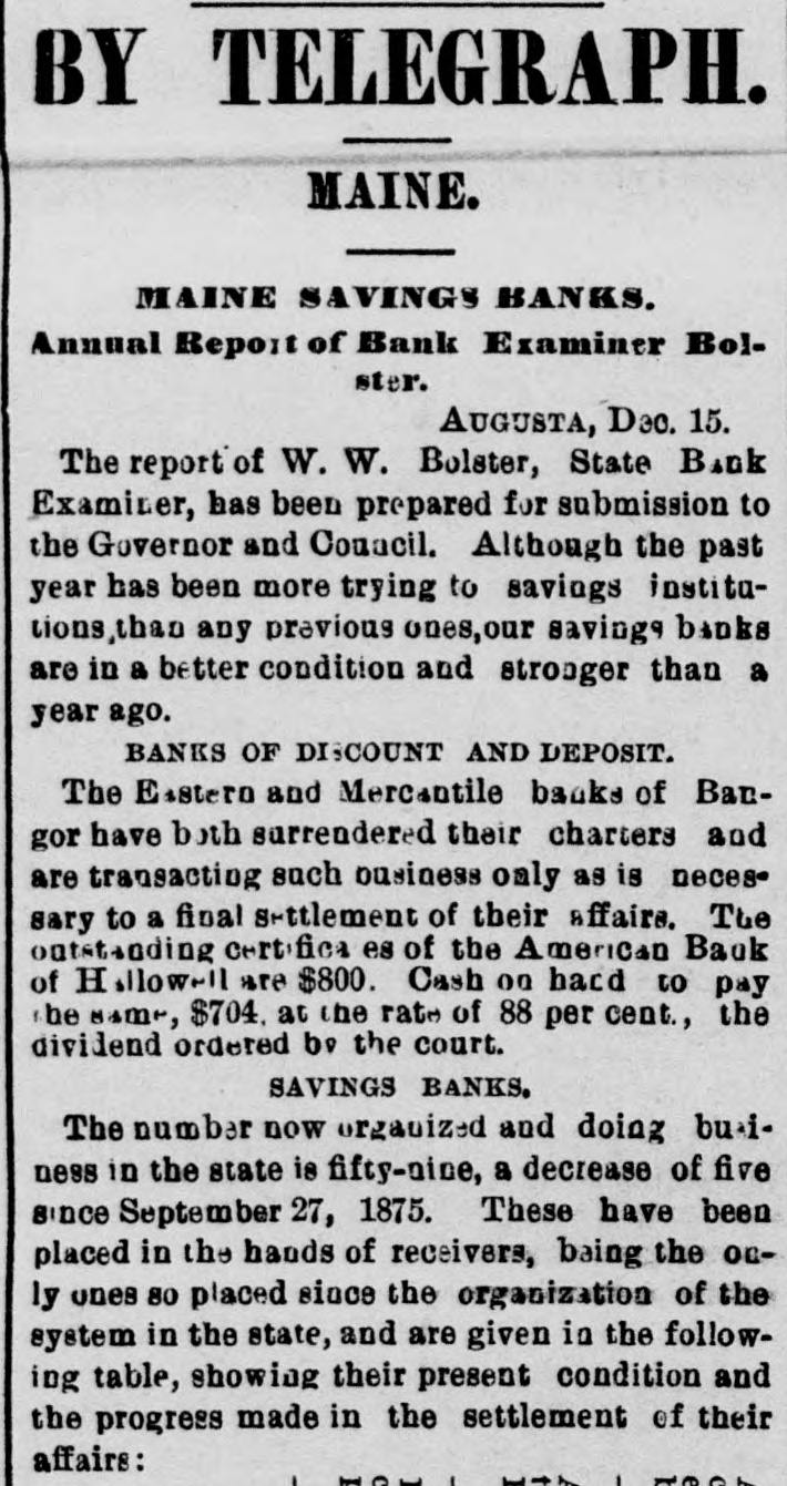 BY TELEGRAPH. MAINE. MAINE SAVINGS BANKS. Fifth Annual Report of Examiner Belster. [Special to the Press.] AUGUSTA, Dec. 16.-The fifth annual report of Bank Examiner Bolster gives a gratifying exhibit of the condition of our savings banks. The improvement in their condition is very marked and there has been a corresponding increase in public confidence in them. BANKS OF DISCOUNT. The report first deals with banks of discount of which the only one left is the Eastern of Bangor, the Mercantile of the same city having surrendered its charter in March, 1876, and the North of Rockland, having opened its books as National Bank, on the 15th of last September. The Eastern is thoroughly sound and in a prosperous condition. During the year the receivers of the defunct American bank of Hallowell, have paid dividends to the amount of $580.24. The amount of certificates now outstanding is $896, and the cash on hand to pay the same is $788.48. LOAN ASSOCIATIONS. The Peoples' Loan and Building Association of Richmond, is the only one in the State. It was incorporated in February, 1875, and is in a Sound condition with assets to the amount of $20,178.42. The receipts and disbursements for the two years ending March 19, were $18,730.11. The system on which it operates has been frequently explained. SAVINGS BANKS. The number of savings banks now organized in this State is sixty-four, the same as last year. Those which have been placed in the hands of receivers are the Winthrop, Solon, Bucksport and Lewiston Institution for Savings, paying respectively, 40, 85, 40 and 50 cents on the dollar. There will be an early settlement of the affairs of the Solon bank and Lewiston Institution for Savings, but the final settlement of the others will be delayed by pending litigation. The deposits and profits of the sixty banks now doing business, on the 5th of November last, were $26,898,432.76. The assets, as compared with 1876, are as follows: ASSETS. 1876. 1877. Invested in United States bonds...$ 602,419 16 $ 982,869 47 State of Maine bonds 137,319 75 97,216 50 Other state. county and