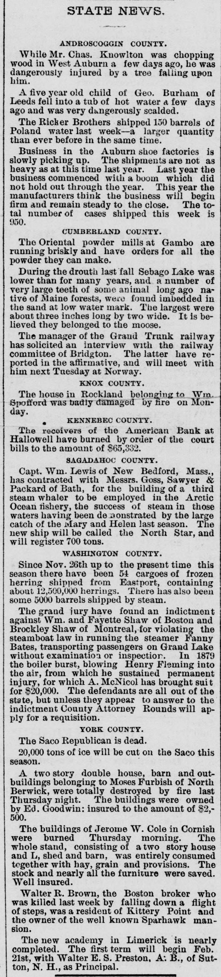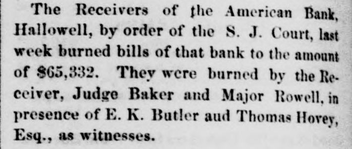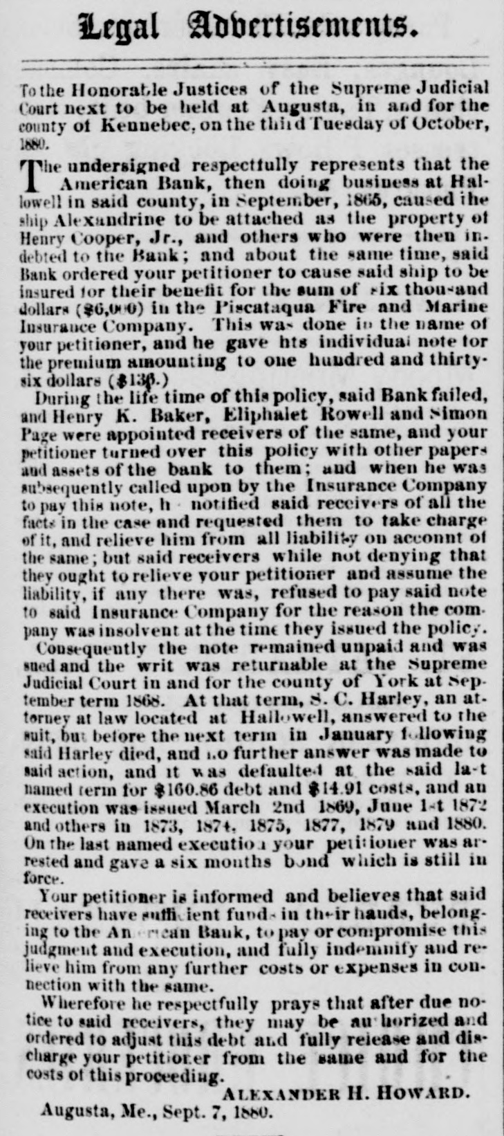 Legal Abbertisements. To the Honorable Justices of the Supreme Judicial Court next to be held at Augusta, in and for the county of Kennebee, on the third Tuesday of October, 1880. American Bank, then doing business at HalThe undersigned respectfully represents that the lowell in said county, in September, 1865, caused the ship Alexandrine to be attached as the property of Henry Cooper, Jr., and others who were then in. debted to the Bank: and about the same time, said Bank ordered your petitioner to cause said ship to be insured for their benefit for the sum of rix thou-and dollars ($6,000) in the Piscataqua Fire and Marine Insurance Company. This was done in the name of your petitioner, and he gave hts individual note for the premium amounting to one hundred and thirtysix dollars ($136.) During the life time of this policy, said Bank failed, and Henry K. Baker, Eliphalet Rowell and Simon Page were appointed receivers of the same, and your petitioner turned over this policy with other papers and assets of the bank to them: and when he was subsequently called upon by the Insurance Company to pay this note, h notified said receivers of all the facts in the case and requested them to take charge of it, and relieve him from all liability on account of the same; but said receivers while not denying that they ought to relieve your petitioner and assume the liability, if any there was, refused to pay said note to said Insurance Company for the reason the company was insolvent at the time they issued the policy. Consequently the note remained unpaid and was sued and the writ was returnable at the Supreme Judicial Court in and for the county of York at Sep. tember term 1868. At that term, S. C. Harley, an attorney at law located at Hailowell, answered to the suit, but before the next term in January following said Harley died, and 1.0 further answer was made to said action, and it was defaulted at the said la-t named term for $160.86 debt and $14.91 costs, and an execution was issued March 2nd 1869, June 1-t 1872 and others in 1873, 187+, 1875, 1877, 1879 and 1880. On the last named execution your petitiouer was arrested and gave a six months bond which is still in force. Your petitioner is informed and believes that said receivers have suffi ient fund. in their hauds, belonging to the An emean Bauk, to pay or compromise this judgment and execution, and fully indemnify and relieve him from any further costs or expenses in connection with the same. Wherefore he respectfully prays that after due notice to said receivers, they may be au horized and ordered to adjust this debt and fully release and discharge your petitioner from the same and for the costs of this proceeding. ALEXANDER H. HOWARD. Augusta, Me., Sept. 7, 1880.