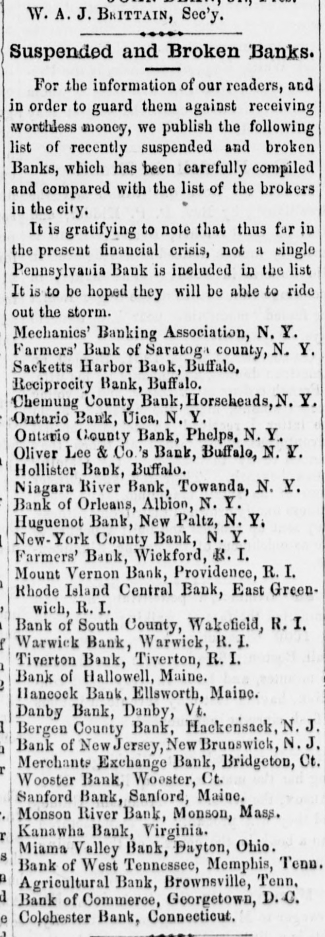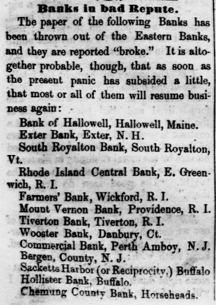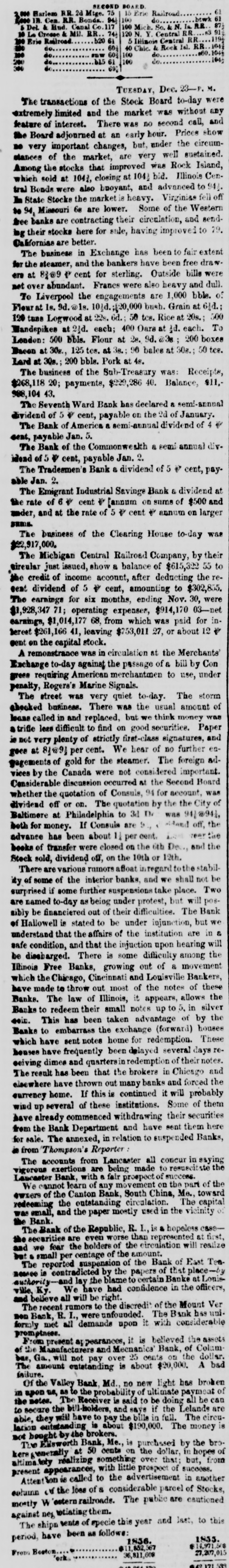 SECOND BOARD 61 Erie Railroad ... Harlem RR 2d Mtge. 75 61 btwk $600 18. Cen. RR. Bonds. 94 100 100 Mich. So. Is. RR 871 Del. & Hud. Canal Co. 117 74) 120 N. Central RR 91, La Crosse Mil. RR b20 Illinois Central RR Erie Railroad. 601 40 Chic. Rock Isl. RR 1042 100 snw 601 104; 615 100 300 69, TUESDAY, Dec. 23-P. M. The transactions of the Stock Board to-day were extremely limited and the market was without any feature of interest. There was no second call, and the Board adjourned at an early hour. Prices show no very important changes, but, under the circumstances of the market, are very well sustained. Among the stocks that improved was Rock Island, which sold at 1042, closing at 104} bid. Illinois Central Bonds were also buoyant, and advanced to 941. h State Stocks the market is heavy. Virginias fell off to 94, Missouri 6g are lower. Some of the Western free banks are contracting their circulation, and sendbg their stocks here for sale, having improved to 79. Californias are better. The business in Exchange has been to fair extent for the steamer, and the bankers have been free draw. ere at 81@9 P cent for sterling. Outside bills were net over abundant. Francs were also heavy and dull. To Liverpool the engagements are 1,000 bble. of Floura 1s. 9d. 104d.;{20,000 bush. Grain at 61d.; 120 tune Logwood at 22s. 6d.; 50 tcs. Rice at 20s.; 500 Mandspikes at 21d. each; 400 Oars at 1d. each. To London: 500 bbls. Flour at 2e. 9d. @3s 200 boxes Bacon at 30s., 125 tes. at 3s.; 96 bales at 30s.; 50 tce. Lard at 30s.; 200 bbls. Pork at 4s. The business of the Sub-Treasury was: Receipts, $268,118 20; payments, $229,286 40. Balance, $11,988,104 43. The Seventh Ward Bank has declared a semi-annual dividend of 5 # cent, payable on the 2d of January. The Bank of America a semi-annual dividend of 4 * cent, payable Jan. 5. The Bank of the Commonweakh a semi annual div. idend of 5 * cent, payable Jan. 2. The Tradesmen's Bank a dividend of 5 & cent, payable Jan. 2. The Emigrant Industrial Savings Bank & dividend at the rate of 6 P cent * [annum on sums of $500 and under, and at the rate of 5 P cent * annum on larger sums. The business of the Clearing House to-day was $22,917,000. The Micbigan Central Railroad Company, by their aireular just issued, show a balance of $615,322 55 to the credit of income account, after deducting the recent dividend of 5 P cent, amounting to $302,855. The earnings for six months, ending Nov. 30, were $1,928,347 71; operating expenses, $914,170 03-net earnings, $1,014,177 68, from which was paid for inBereet $261,166 41, leaving $753,011 27, or about 12 P Cent on the capital stock. A remonstrance was in circulation at the Merchants' Exchange to-day against the passage of & bill by Con green requiring American merchantmen to use, under penalty, Regers's Marine Signals. The street was very quiet to-day. The storm shecked business. There was the usual amount of loans called in and replaced, but we think money was a trifle less difficult to find on good securities. Paper is not very plenty of strictly first-class signatures, and goes at 81@91 per cent. We hear of no further enpagements of gold for the steamer. The foreign advices by the Canada were not considered important. Considerable discussion occurred at the Second Board whether the quotation of Consuls, 94 for account, was dividend off or on. The quotation by the the City of Baltimere at Philadelphia to 3d Dr was 941 @941, both for money. If Consuls are Adend off, the the advance has been about 11 per cent. 1 year books of transfer were closed on the 6th Dec., and the Steck sold, dividend off, on the 10th or 12th. There are various rumors afloat oregard to the stability of some of the interior banks, and we shall not be surprised if some further suspensions take place. Two are named to-day as being under protest, but will possibly be financiered out of their difficulties. The Bank of Hallowell is stated to be under injunction, but we understand that the affairs of the institution are in & safe condition, and that the injuction upon hearing will be discharged. There is some difficulty among the Illinois Free Banks, growing out of a movement which the Chicago, Cincinnati and Louisville Bankers, have made to throw out most of the notes of these Banks. The law of Illinois, it appears, allows the Banks to redeem their small notes up to 5, in silver soin. This has been taken advantage of by the Banks to embarrass the exchange (forward) houses which have sent notes home for redemption. These houses have frequently been delayed several days reociving dimes and quartersi in redemption of their notes. The result has been that the brokers in Chicago and alsewhere have thrown out many banks and forced the currency home. If this is continued it will probably wind up several of these institutions. Some of them have already commenced withdrawing their securities from the Bank Department and have sent them here for sale. The annexed, in relation to suspended Banks, in from Thompson's Reporter The accounts from Lancaster all concur in saying vigorous exertions are being made to resuscitate the Lancaster Bank, with a fair prospect of success. We cannot learn of any movement on the part of the *wners of the Canton Bank, South China, Me., toward redeeming the outstanding circulation. The capital was small, and the paper mostly used in the vicinity the Bank. The Bank of the Republic, R. I., is & hopeless cassthe securities are even worse than represented at first, and we fear the holders of the circulation will realize but & small per centage of the amount. The reported suspension of the Bank of East Teanessee is contradicted by the papers of that place-by authority lay the blameto certain Banke at Lonisville, Ky. We have had confidence in the officers, and believe all will be right. The recent rumors to the discredi of the Mount Ver men Bank, R. I., were unfounded. The Bank has uniformly met all demands upon it with considerable promptness. From p