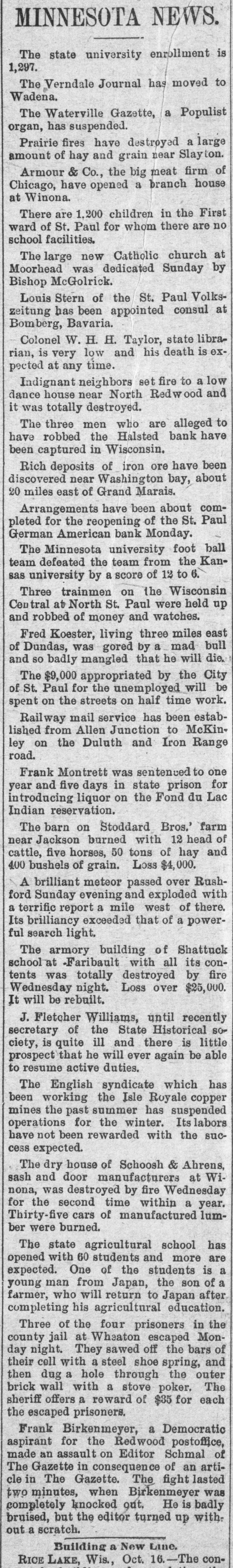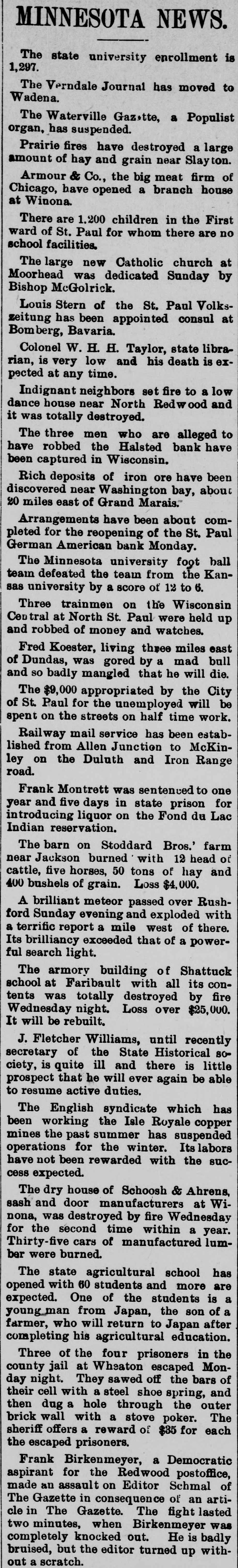THE el etric light plant at Franki Ind., was destroved by a boiler exp sion. The loss is $10,000. FREIGHT handlers in St. Louis, M failed to strike, as was expected, on count of a reduction 10 wages. \ SECOND fight between boomers a troops has taken place in the herok Strip, Two boomers were killed. THE property of the company pla ming an electric road between India apolisand bicago has been attached THE Standard Bievele Manufacturi Company, of Indianapolis has faile The assets and liabilities are each $6 000. THE Niedringhaus timplate and stan ing works at St. Louis. Mo., will start next week. giving employment to 2,0 hands. ARRY Lt rzand George Ross. propr tors of the Areade ice cream parlo Muncie, Ind., are under arrest charg with arson. NEARLY all mills at Fall River, Mas have shut down. THE Bank of Commerce at Hava Cuba, has suspended. ANOTHER death from cholera has curred on Swinburne Island. W. W. DEAN,a prospector, was buri in the sand near Lincoln, Neb. MRS. SOPHIA BEANING was killed an electric car at Indianapolis. PRINCE LEOPOLD, of Austria, is of hunting trip in the Adirondacks. MOBS still threaten to attack Chir men in San Joaquin Valley, Cal. MAIL M. B. FARR, a well-kno Brookly newspaper man, is dead. CHOCTAWS and Chickasaws refuse sell their lands to the government. JOHN HOGAN was mysteriously mi dered by poison at Shelbyville, Ind. THE Finney County Bank of Kans was deliberately looted by the officers JOHN OLESON, of Oswego, III., SI posed to have suicided, was murder NELLIE GRAY, of Rochester, Ind under arrest on a charge of horse-ste ing. IN a fight between Mexican troo and rebels three of the latter we slain 1. M. MMINGS, of Des Moines, I IS a candidate for United States NE ator. ST. PAUL printers refused to acce the cut in wages suggested by owners offices. THREE of the Wilson gang of Ke tucky desperadoes were captured officers. THE post-office at Washington, I was robbed of $75 in money and $300 stamps. THREE attempts were made near S Francisco to wreck atraincrowded " passengers. BARRETT Scorr. county treasurer a fugitive from Lincoln, Neb. He is defaulter. THE Irondale Rolling Mill Company Anderson, Ind., has signed the Annal: mated scale. PRESIDENT CLEVELAND, and family " leave Buzzard's Bay for Washington September 1. FRED. MILLER, a juryman, fell fro the court-house window at Newton, I and was killed. \ JEWELRY store in the City of Me CO was robbed of several thousand de lars worth of goods. JOHN TERHAN fell into a well which was cleaning at Reading, Ohio, and " suffocated by foul air. \ BOAT capsized in Niagara River a Edward Brennan, of New York Ci was.carried over the falls. WILLIAM HIGHFIELD, the Whitee: was sentenced to two years 111 the pe tentiary at Evansville, Ind. THE Hubbard & Vincent saw mill Duluth. Minn., burned. Loss, $16.0 \ BLOCK of buildings burned at T. arkana, Ark., causing a loss of $40,000 \ DOZEN buildings were destroved fire at Benton, III., causing a loss $150,000 Lois ARMSTADE, ont of employment Toledo, O., committed suicide by taki laudanum. THE body of John Oleson, an Oswes 111. farmer, was found in the road " a bullet in the head. THE residence of .I. W. Ellis, at No port, R. 1., was entered by burglars a robbed of jewelry worth $8,000. JOHN M. LOWERY, a prominent citiz of Hot Springs, Ark., was shot killed by a dairy named Wilson. BURGI VRS cracked the safe in 1 Missouri Pacific freight office at No raska City, Neb., and secured $1,000. JOHN W. ASILEAR, the painter member of the National Academy sit 1851 and an associate since 1835. is JOHN BOYD and George Terry resist arrest at the hand of a sheriff's posse Winslow, Ark., and Boyd was si dead. J. B. BRT NER. treasurer of the CO bined Masonic lodges of Omaha, No IS alleged to be $1,200 short in h counts. WILLIAM Mo MAIN, a miner of Dona souville, ind., was badly erushed 11110 falling slate and died soon after bei taken out. THE German American Bank at Paul will resume business. CONGRESSMAN DENN. of New Jersey seriously ill with heart failure. CYRUS BROWN. aged 50 years, shot killed his wife near Columbus, Ind THE Sons of Veterans have adop black belts instead of belts of g color THE steamer Weser from Naples arrived at New York with 1,000 pass gers. MALIGNANT diphtheria has broken in Findiay, O., and the town has be quarantined. S M. DORR & Sox, in Western be and mortgage business at Rutland. ) failed. Liabilities, $142,875. In has been necessary to call