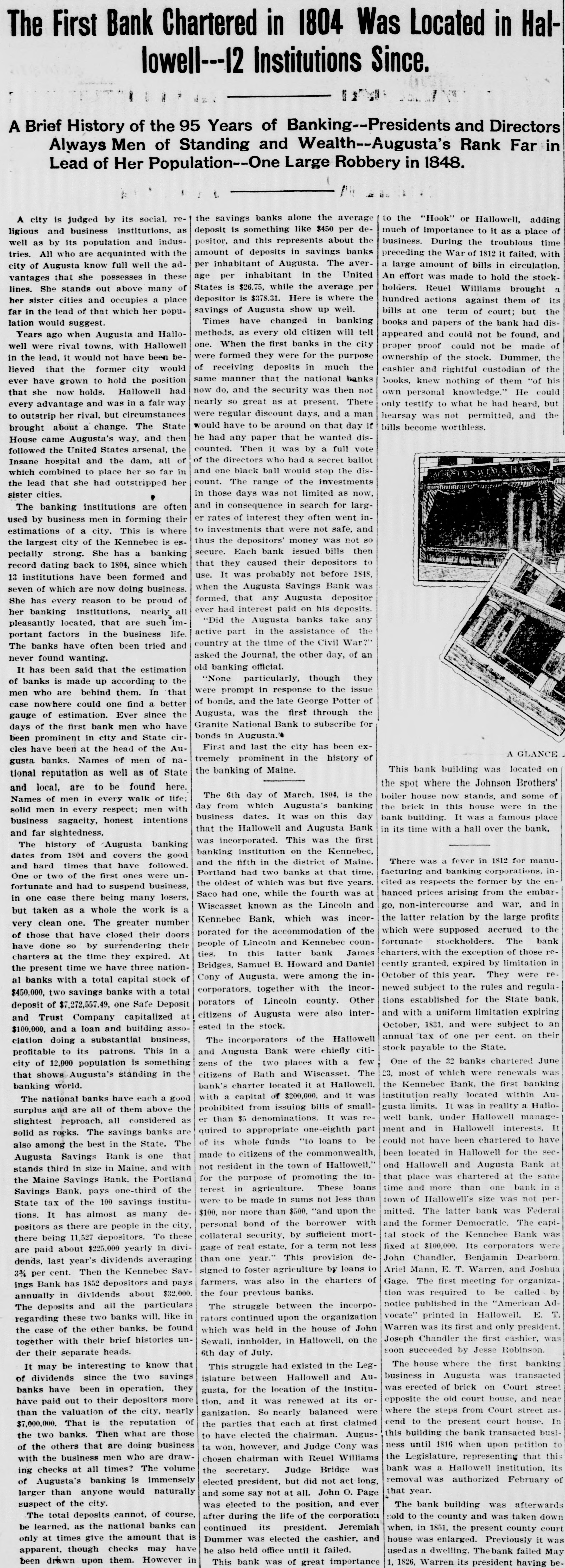 # The First Bank Chartered in 1804 Was Located in Hallowell--12 Institutions Since. # A Brief History of the 95 Years of Banking--Presidents and Directors Always Men of Standing and Wealth--Augusta's Rank Far in Lead of Her Population--One Large Robbery in 1848. A city is judged by its social, re- ligious and business institutions, as well as by its population and indus- tries. All who are acquainted with the city of Augusta know full well the ad- vantages that she possesses in these lines. She stands out above many of her sister cities and occupies a place far in the lead of that which her popu- lation would suggest. Years ago when Augusta and Hallo- well were rival towns, with Hallowell in the lead, it would not have been be- lieved that the former city would ever have grown to hold the position that she now holds. Hallowell had every advantage and was in a fair way to outstrip her rival, but circumstances brought about a change. The State House came Augusta's way, and then followed the United States arsenal, the Insane hospital and the dam, all of which combined to place her so far in the lead that she had outstripped her sister cities. The banking institutions are often used by business men in forming their estimations of a city. This is where the largest city of the Kennebec is es- pecially strong. She has a banking record dating back to 1804, since which 13 institutions have been formed and seven of which are now doing business. She has every reason to be proud of her banking institutions, nearly all pleasantly located, that are such im- portant factors in the business life. The banks have often been tried and never found wanting. It has been said that the estimation of banks is made up according to the men who are behind them. In that case nowhere could one find a better gauge of estimation. Ever since the days of the first bank men who have been prominent in city and State cir- cles have been at the head of the Au- gusta banks. Names of men of na- tional reputation as well as of State and local, are to be found here. Names of men in every walk of life; solid men in every respect; men with business sagacity, honest intentions and far sightedness. The history of Augusta banking dates from 1804 and covers the good and hard times that have followed. One or two of the first ones were un- fortunate and had to suspend business, in one case there being many losers, but taken as a whole the work is a very clean one. The greater number of those that have closed their doors have done so by surrendering their charters at the time they expired. At the present time we have three nation- al banks with a total capital stock of $450,000, two savings banks with a total deposit of $7,272,557.49, one Safe Deposit and Trust Company capitalized at $100,000, and a loan and building asso- ciation doing a substantial business, profitable to its patrons. This in a city of 12,000 population is something that shows Augusta's standing in the banking world. The national banks have each a good surplus and are all of them above the slightest reproach, all considered as solid as rocks. The savings banks are also among the best in the State. The Augusta Savings Bank is one that stands third in size in Maine, and with the Maine Savings Bank, the Portland Savings Bank, pays one-third of the State tax of the 100 savings institu- tions. It has almost as many de- positors as there are people in the city, there being 11,527 depositors. To these are paid about $225,000 yearly in divi- dends, last year's dividends averaging 334 per cent. Then the Kennebec Sav- ings Bank has 1852 depositors and pays annually in dividends about $32.000. The deposits and all the particulars regarding these two banks will, like in the case of the other banks, be found together with their brief histories un- der their separate heads. It may be interesting to know that of dividends since the two savings banks have been in operation, they have paid out to their depositors more than the valuation of the city, nearly $7,000,000. That is the reputation of the two banks. Then what are those of the others that are doing business with the business men who are draw- ing checks at all times? The volume of Augusta's banking is immensely larger than anyone would naturally suspect of the city. The total deposits cannot, of course, be learned, as the national banks can only at times give the amount that is apparent, though checks may have been drawn upon them. However in the savings banks alone the average deposit is something like $450 per de- positor, and this represents about the amount of deposits in savings banks per inhabitant of Augusta. The aver- age per inhabitant in the United States is $26.75, while the average per depositor is $378.31. Here is where the savings of Augusta show up well. Times have changed in banking methods, as every old citizen will tell one. When the first banks in the city were formed they were for the purpose of receiving deposits in much the same manner that the national banks now do, and the security was then not nearly so great as at present. There were regular discount days, and a man would have to be around on that day if he had any paper that he wanted dis- counted. Then it was by a full vote of the directors who had a secret ballot and one black ball would stop the dis- count. The range of the investments in those days was not limited as now, and in consequence in search for larg- er rates of interest they often went in- to investments that were not safe, and thus the depositors' money was not so secure. Each bank issued bills then that they caused their depositors to use. It was probably not before 1848, when the Augusta Savings Bank was formed, that any Augusta depositor ever had interest paid on his deposits. "Did the Augusta banks take any active part in the assistance of the country at the time of the Civil War?" asked the Journal, the other day, of an old banking official. "None particularly, though they were pr
