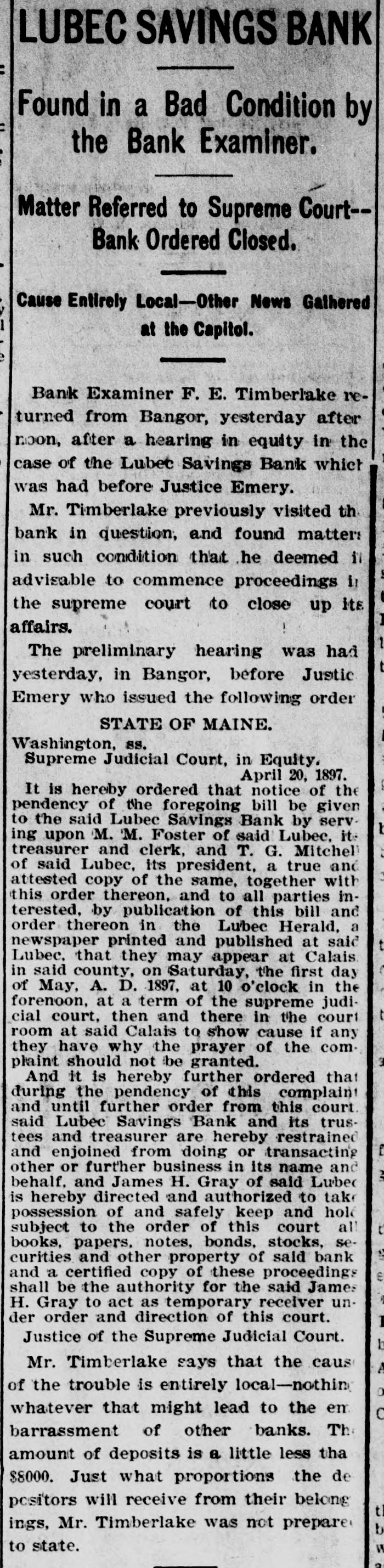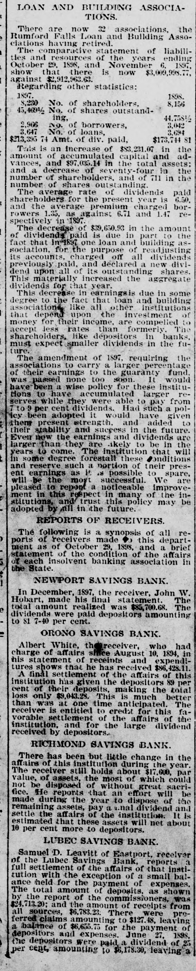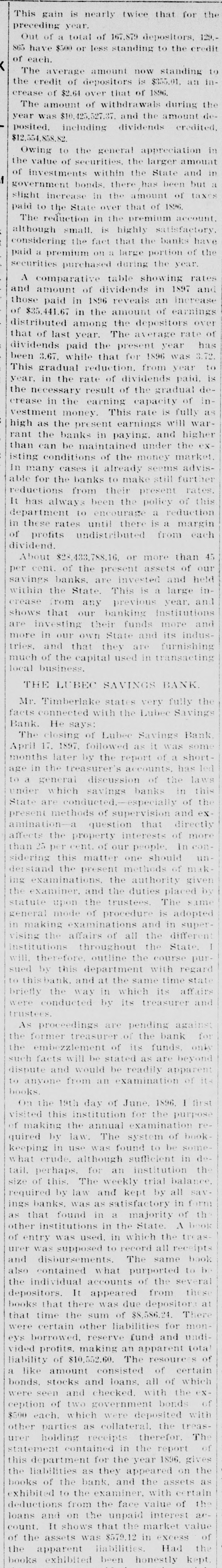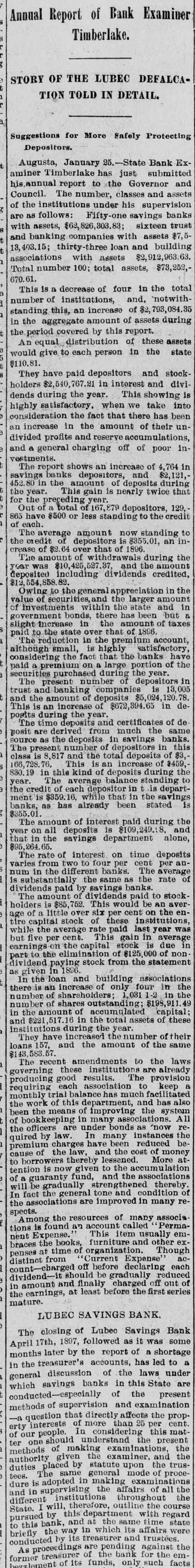 Annual Report of Bank Examiner Timberlake. STORY OF THE LUBEC DEFALCA TION TOLD IN DETAIL. Suggestions for More gafely Protecting Depositors Augusta, January 25 State Bank Ex aminer Timberlake has just submitted his.annual report to the Governor assets and Council. The number, classes and of the institutions under his supervision bank as follows: Fifty-one savings trust are with assets, $62, 826,303.83; sixteen and banking companies with assets $7,5 building 13,403.15; thirty -three loan and $2,912,963.63 associations with assets $73,252, Total number 100; total assets, 670.61. This is a decrease of four in the "notwith- total number of institutions, and, $2,793,084.35 standing this, an increase of during the aggregate amount of assets the in period covered by this report. equal distribution of these assets state would An give to each person in the $110.81. They have paid depositors and stock divi holders $2,540,767.21 in interest and during the year. This showing is dends highly satisfactory. when we take been into consideration the fact that there has un increase in the amount of their divided an profits and reserve accumulations, in and general charging off of poor vestments. report shows an increase of 4,764 in $2,121, The banks deposito and during the savings the amount of deposits that year. 452.80 in This gain is nearly twice for the preceding total of year. 167,879 depositors, 129, 865 Out have of $500 or less standing to the credit of each. amount now standing an in- to the The average credit of depositors is 1896 $355.01, of $2.64 over that of crease amount of withdrawals during amount the The 425, 527.37, and the $1,454,858.82 deposited year was $10 including dividends credited, Owing to the general the appreciation larger amount in the of value investments of securities,and within the has state been and but in & government bonds in there the amount of taxes slight increase state over that of 1896. is paid The to reduction in the highly premium satisfactory, account considering although small, the fact that the portion banks have of the premium on a large the year. paid purchased during depositors securities present number of is 13,005 in trust The and banking companie $5. 1,024,120.78 This is an increase and the amount of deposits of $672,394.65 in deposits time during deposits the year and certificates the of same de as source in positors posit The are derived the deposits from in much savings banks. this The present number and the of total deposits of $459, $3, class is 8,817 This is an increase of the 830.19 166,728 in 76. this kind of balance deposits standing during to year. The average depositor in t is departthe credit of each while that in the savings is banks, ment is as $359. has 16, already been stated $355.01 The amount of interest is $109,249.18 paid during and the year that on in the all savings deposits department alone, $95,264.65. of interest on time deposits The rate from two to four per cent The per an- average varies in the different banks. the rate of num is substantially the savings same as banks The amount be This would dividends paid of by dividends paid to AD stock avera of age of these holders is little $85, 752 over six per cent institutions, on the en tire capital stock rate paid last year was while the average This gain in average but five per cent. the capital stock 000 is due of non in earnings elimination of $125, dividend part to the paying stock from the statement as given in 1896 and building associations in the In the loan an increase of only 1.031 1-2 four in the there is of shareholders $199,911.49 number number of shares outstanding accumulated capital; in the amount of in the total assets of these and $221,517.10 institutions during the the year. number of their loans 157, They have and increase the amount of the same laws $143,583.57 amendments to the The recent these institution The are provision already governing good results. producing requiring each association has much to facilitated keep a monthly trial this balance department, and has system also the work means of of improving lations the All been bookkeepi the in many bonds asso as 'now relaw. of the officers are under In many instances be- the reduced quired premium by charges law, have and been the cost of money at cause of the thereby lessened. accumulation More to borrowe given to the associations tention guaranty is now fund, and the thereby of will be gradually strengthened tone and indition re- of the In fact associations the general are improved in many associaan is found item spects. Among the resources account of called many Perma- emThis usually tions nent Expense. books, furniture and other Though ex braces the organization. penses at time of Current declaring Expense each ac. count - it should count-chargeround distinction from off before be gradually charged off reduced out of mature. the earnings, dividend- in amount and at finally least before the first series LUBEC SAVINGS BANK. closing of Lubec Savings was Bank some The 1897, followed as it shortage months accounts, April 17th, later by the report of has a led to a in the treasurer's discussion of the laws under are general savings banks in this State present which especially of the examination conducted of supervision and the propmethods that directly than affects 25 per cent people. understand erty -& question interests of In more considering the this present matthe of ter our one should of making examiner. examinations, and the the general authority methods placed given by statute upon mode of the proce- trusduties tees. The adopted same in making affairs examinations of all the dure is supervising the throughout the and in institutions therefore outline the course at different State. will, by this depar the ment same with time regard state pursued to this bank way and in which its affairs trustees. were briefly the its treasurer and the conducted by dings are pending for against the emof the bank former As