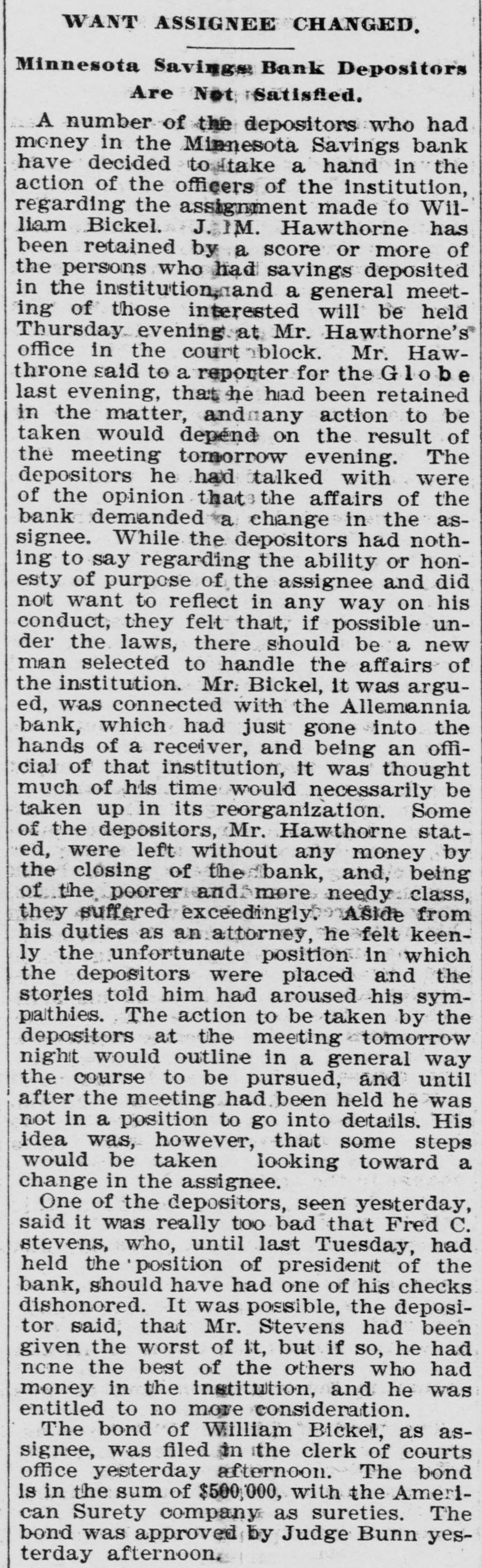 THREE MORE ST. PAUL BANKS. Two Were Large Institutions, the Other Was small. St. Paul, Minn., Jan. 4.-As a direct Minne- rethe closing of the Bank weeks ago, which sota, sult of two and created of started new distrust among depositors were a number of city banks not to be as strong as reputed runs on banks-the the that deposthree St. Paul the Allemania and of them national Germania, itors none wished, institutions, the doors Vest all Side, closely associated-closed their state today, one being in the hands of the asbank examiner and the others making signments. the time that had interv ened During closing of the Bank of Minne- to the Germania paid out sota, since the $225,000 today the frightened depositors, and early the directors concluded they would stop the drain and make an assignment to cashier, Peter M. Keerst. The Allemania bank, which, like the Germania, had a large clientage among and whose vice president the been vice president a the had Germans, formerly target of for Germania, then became the the run. Crowds gathered about the doors lively and fairly fought for a place window. in before the paying teller's such line bank officials realized fully what on The run meant, and promptly called a Bank Examiner Kenyon to take posses- now sion of the bank, and that official is in charge. The West Side bank, a small but possi- Alstronger bank, cleared through the rebly lemania, and today its clearings were turned by the latter institution. Follow~ this there was a decided run inaugu- this ing on the bank, and at 2 o'clock the rated the bank officials closed afternoon and called a meeting of the directors decisdoors decide what action to take. Their to was apparent late in the afternoon, to S. ion filed a deed of assignment H. president of the when Staples, they bank. tied Considerable public money is up m- in three institutions, but there is an in the ple the supply for all immediate needs other banks of the city. The assignment of the Germania and Side banks has brought up a laws some- of West new question in the banking called upwhat state, and the courts will be examiner the settle it. The state bank that on to their right to assign, holding turned doubts should have, under the law, they their assets to him. The attorney acover intimates that he will bring an general tion to test the matter as soon as papers be issued. of can the day numerous reports curDuring among the other banks were of trouble and a few banks suffered runs rent, or lesser intensity, but the that savings algreater were protected by the law before banks them to require 60 days' notice national lows out deposits; and the have no banks paying are in strong condition, and fear of anything of the sort. The Germania Bank. Germania bank was a state insti- The The and had a capital of $400,000. tution official statement of the condition and of last bank, December 21, gave loans resources, I discounts the as $975,420.53; total cap 1 Among the liabilities were undivided $1,625,788. stock, $400,000; surplus and subject ital $58,797; individual deposits certificates of 1 profits, check, $345,191; demand to deposit, $7899; time certificates of deposit, s 3633,019. Germania bank has been organized RamS The ex-Governor Alexander Wilmany being years, a long time president, and say Bickell, cashier. When the governor but liam Mr. Bickell became president, vice f retired, spring Bickell retired, becoming Alle2 last of the newly organized Gusmania president bank. He was succeeded by tav Willius. d Willius told an Associated President representative that the closing was and Press result of an unreasonable panic, the bank would be opened for business usua as the soon as the people regained their cool sense. it bank, as a result of the panicky in o The had paid the depositors $335,000 he fully 1 feeling, last nine days. Willius said by expected the to have the bank reopened the last of March. il The Allemania. r Allemania bank has a capital that of and a clientage similar to o The Allemania was $400,000, the The Germania. of the organ Com last year, as a successor G. ized mercial, William Bickell, formerly forces pres e ident of the Germania, joining Commercial with Albert Scheffer, of the last offl organize a new bank. The show y cial to statement made, December undivided 17, e loans and discounts, $706,842; individua e ed less expenses, $508,764; certificates profits, deposits, $329,789; interest cil n $187,253. President Scheffer, of the Allemania combine n the failure was due to of de twithdrawal said of deposits. A crowd the at positors gathered today demanding decide money, and at 11 o'clock it was to close. Runs on Other Banks. n, to the excitement caused by Alle th Owing of the Germania and the afte ht closing mania banks, many depositors went banks 'S. en their money in one or two other th the Minnesota Savings bank being
