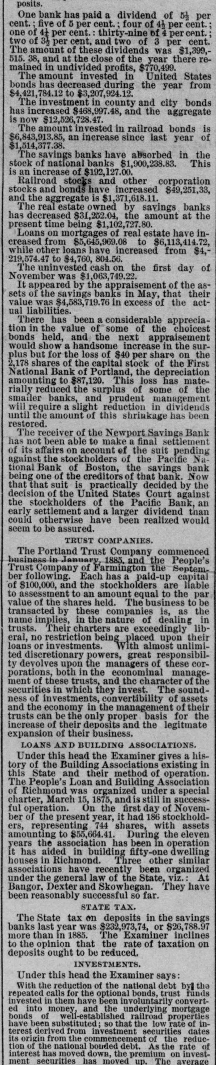 posits. One bank has paid a dividend of 51 per cent. five of 5 per cent.: four of 41 per cent.: one of 41 per cent.: thirty-nine of 4 per cent.: two of 3g per cent. and two of 3 per cent. The amount of these dividends was $1,399,515. 38, and at the close of the year there remained in undivided profits, $770,499. The amount invested in United States bonds has decreased during the year from $4,421,784.12 to $3,207,924.12. The investment in county and city bonds has increased $468,997.48, and the aggregate is now $12,526,728.47. The amount invested in railroad bonds is $6,843,913.85, an increase since last year of $1,514,377.38. The savings banks have absorbed in the stock of national banks $1,900,238.83. This is an increase of $192,127.00. Railroad stocks and other corporation stocks and bonds have increased $49,251,33, and the aggregate is $1,371,618.11. The real estate owned by savings banks has decreased $31,252.04, the amount at the present time being $1,102,727.80. Loans on mortgages of real estate have increased from $5,645,969.08 to $6,113,414.72, while other loans have increased from $4, 219,574.47 to $4,760, 804.56. The uninvested cash on the first day of November was $1,063,749.22. It appeared by the appraisement of the assets of the savings banks in May, that their value was $4,583,719.76 in excess of the actual liabilities. There has been a considerable appreciation in the value of some of the choicest bonds held, and the next appraisement would show a handsome increase in the surplus but for the loss of $40 per share on the 2,178 shares of the capital stock of the First National Bank of Portland, the depreciation amounting to $87,120. This loss has materially reduced the surplus of some of the smailer banks, and prudent management will require a slight reduction in dividends until the amount of this shrinkage has been restored. The receiver of the Newport Savings Bank has not been able to make a final settlement of its affairs on account of the suit pending against the stockholders of the Pacific National Bank of Boston, the savings bank being one of the creditors of that bank. Now that that suit is practically decided by the decision of the United States Court against the stockholders of the Pacific Bank, an early settlement and a larger dividend than could otherwise have been realized would seem to be assured. TRUST COMPANIES. The Portland Trust Company commenced business in January, 1885, and the People's Trust Company of Farmington the September following. Each has a paid-up capital of $100,000, and the stockholders are liable to assessment to an amount equal to the par value of the shares held. The business to be transacted by these companies is, as the name implies, in the nature of dealing in trusts. Their charters are exceedingly liberal, no restriction being placed upon their loans or investments. With almost unlimited discretionary powers, great responsibilty devolves upon the managers of these corporations, both in the econominal management of these trusts, and the character of the securities in which they invest. The soundness of investments, convertibility of assets and the economy in the management of their trusts can be the only proper basis for the increase of their deposits and the legitmate expansion of their business. LOANS AND BUILDING ASSOCIATIONS. Under this head the Examiner gives a history of the Building Associations existing in this State and their method of operation. The People's Loan and Building Association of Richmond was organized under a special charter, March 15, 1875, and is still in successful operation. On the first day of November of the present year, it had 186 stockholders, representing 744 shares, with assets amounting to $55,664.41. During the eleven years the association has been in operation it has aided in building fifty-one dwelling houses in Richmond. Three other similar associations have recently been organized under the general law of the State, viz.: At have Bangor. Dexter and Skowhegan. They been reasonably successful so far. STATE TAX. The State tax on deposits in the savings banks last year was $232,973,74, or $26,788.97 more than in 1885. The Examiner inclines to the opinion that the rate of taxation on deposits ought to be reduced. INVESTMENTS. Under this head the Examiner says: With the reduction of the national debt by the repeated calls for the optional bonds, trust funds invested in them have been involuntarily converted into money, and the underlying mortgage bonds of well-established railroad properties have been substituted; so that the low rate of interest derived from investment securities dates its origin from the commencement of the reduction of the national bonded debt. As the rate of interest has moved down, the premium on investment securities has moved up. The average
