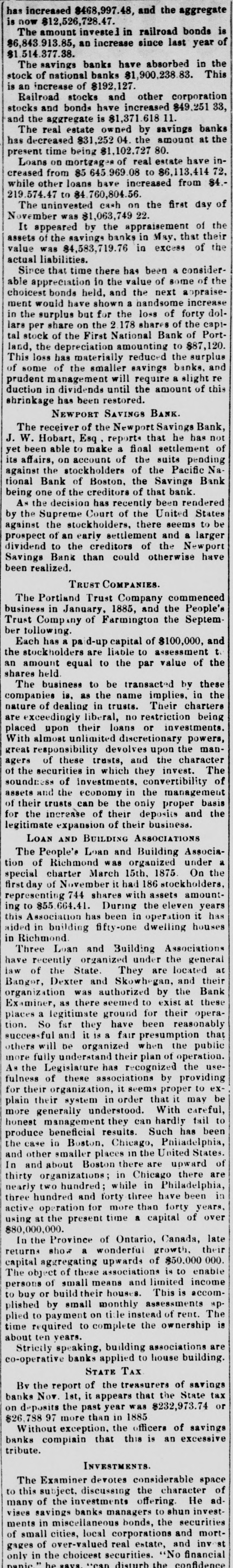 has increased $468,997.48, and the aggregate is now $12,526,728.47. The amount invested in railroad bonds is $6,843.913.85, an increase since last year of $1.514.377.38. The savings banks have absorbed in the stock of national banks $1,900,238.83. This is an increase of $192,127. Railroad stocks and other corporation stocks and bonds have increased $49,251 33, and the aggregate is $1,371.618 11. The real estate owned by savings banks has decreased $31,252 04. the amount at the present time being $1,102,727 80. Loans on mortgages of real estate have increased from 85 645 969.08 to $6,113,414 72, while other loans have increased from $4.219.574.47 to $4.760,804.56. The uninvested cash on the first day of November was $1,063,749 22. It appeared by the appraisement of the assets of the savings banks in May, that their value was $4,583,719.76 in excess of the actual liabilities. Since that time there has been 8 considerable appreciation in the value of some of the choicest bonds held, and the next appraisement would have shown a handsome increase in the surplus but for the loss of forty dollars per share on the 2 178 shares of the capital stock of the First National Bank of Portland, the depreciation amounting to $87,120. This loss has materially reduced the surplus of some of the smaller savings banks, and prudent management will require a slight re duction in dividends until the amount of this shrinkage has been restored. NEWPORT SAVINGS BANK. The receiver of the Newport Savings Bank, J. W. Hobart, Esq reports that he has not yet been able to make a final settlement of its affairs, on account of the suits pending against the stockholders of the Pacific National Bank of Boston, the Savings Bank being one of the creditors of that bank. As the decision has recently been rendered by the Supreme Court of the United States against the stockholders, there seems to be prospect of an early settlement and a larger dividend to the creditors of the Newport Savings Bank than could otherwise have been realized. TRUST COMPANIES. The Portland Trust Company commeneed business in January, 1885, and the People's Trust Company of Farmington the September following. Each has a d-up capital of $100,000, and the stockholders are liable to assessment t. an amount equal to the par value of the shares held. The business to be transacted by these companies is, as the name implies, in the nature of dealing in trusts. Their charters are exceedingly liberal, no restriction being placed upon their loans or investments. With almost unlimited discretionary powers, great responsibility devolves upon the managers of these trusts, and the character of the securities in which they invest. The soundness of investments. convertibility of assets and the economy in the management of their trusts can be the only proper basis for the increase of their deposits and the legitimate expansion of their business. LOAN AND BUILDING ASSOCIATIONS The People's Loan and Building Association of Richmond was organized under a special charter March 15th, 1875. On the first day of November it had 186 stockholders, representing 744 shares with assets amounting to $55,664.41. During the eleven years this Association has been in operation it has aided in building fifty-one dwelling houses in Richmond. Three Loan and Building Associations have recently organized under the general law of the State. They are located at Bangor, Dexter and Skowhegan, and their organization was authorized by the Bank Examiner, as there seemed to exist at these places a legitimate ground for their operation. So far they have been reasonably successful and it is a fair presumption that others will be organized when the public more fully understand their plan of operation. As the Legislature has recognized the usefulness of these associations by providing for their organization, it seems proper to explain their system in order that it may be more generally understood. With careful, honest management they can hardly tail to produce beneficial results. Such has been the case in Boston, Chicago, Philadelphia, and other smaller places in the United States. In and about Boston there are upward of thirty organizations; in Chicago there are nearly two hundred; while in Philadelphia, three hundred and forty three have been in active operation for more than forty years, using at the present time a capital of over $80,000,000. In the Province of Ontario, Canada, late returns show a wonderful growth, their capital aggregating upwards of $50,000 The object of these associations is to enable persons of small means and limited income to buy or build their houses. This is accomplished by small monthly assessments applied to payment on instead of rent. The time required to complete the ownership is about ten years. Strictly speaking, building associations are co-operative banks applied to house building. STATE Tax Bv the report of the treasurers of savings banks Nov. 1st, it appears that the State tax on deposits the past year was $232,973.74 or $26,788 97 more than in 1885 Without exception, the officers of savings banks compiain that this is an excessive tribute. INVESTMENTS. The Examiner devotes considerable space to this subject, discussing the character of many of the investments offering. He advises savings banks managers to shun investments in miscellaneous bonds, the securities of small cities, local corporations and mortgages of over-valued real estate, and inv st only in the choicest securities. "No financial panic. he savs "can disturb the confidence