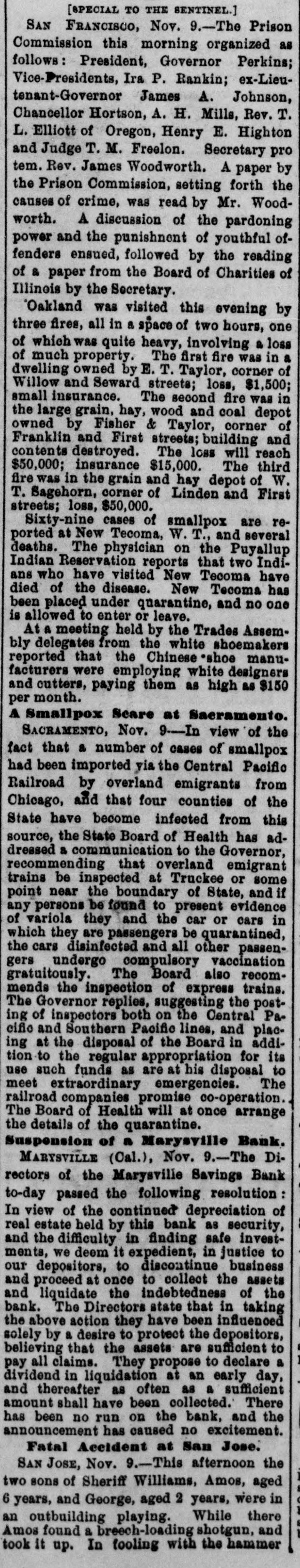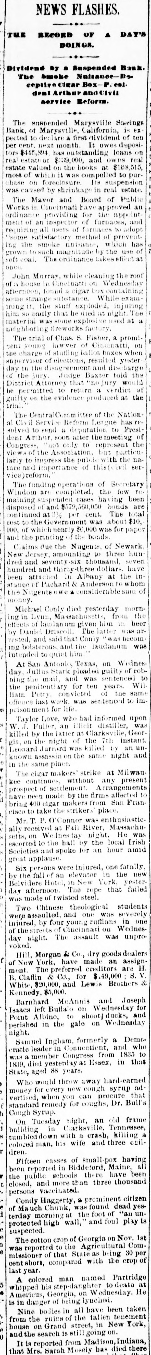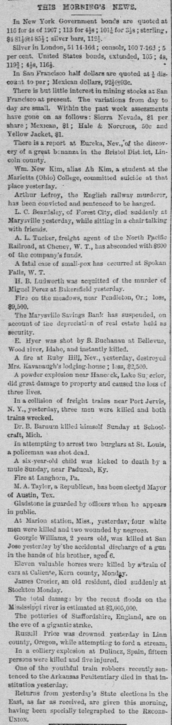 THIS MORNING'S NEWS. In New York Government bonds are quoted at 116 for 4s of 1907 113 for 4}s; 1011 for 34s sterling, $4811@485}: silver bars, 112}. Silver in London, 51 14-16d ; consols, 100 7-16d 5 per cent. United States bonds, extended, 105; 4s, 119]; 41s, 1164. In San Francisco half dollars are quoted at 1/2 discount to par; Mexican dollars, 921@93c. There is but little interest in mining stocks at San Francisco at present. The variations from day to day are small. Within the past week assessments have gone on as follows: Sierra Nevada, 81 per share; Mexican, 81; Hale & Norcross, 50c and Yellow Jacket, $1. There is a report at Eureka, Nev., of the discovery of a great bonanza in the Bristol Dist ict, Lincoln county. Wm. New Kim, alias Ah Kim, a student at the Marietta (Ohio) College, committed suicide at that place yesterday. Arthur Lefroy, the English railway murderer, has been convicted and sentenced to be changed. C. Beardsley, of Forest City, died suddenly at Marysville yesterday, while sitting in a chair talking with friends. A. L. Tucker, freight agent of the North Pacific Railroad, at Cheney, W. T., has absconded with $600 of the company's funds. A fatal case of small-pox has occurred at Spokan Falls, W.T. H. B. Ludworth was acquitted of the murder of Miguel Perez at Bikerefield yesterday. Fire on the meadows, near Pendleton, Or.; loss, 89,500. The Marysville Savings Bank has suspended, on account of the depreciation of real estate held as security. E. Hyer was shot by B. Buchanan at Bellevue, Wood river, Idaho, and instantly killed. A fire at Ruby Hill, Nev., yesterday, destroyed Mrs. Kavanaugh's lodging-house; loss, $2,500. A powder explosion near Hancock, Lake Su; erior, did great damage to property and caused the loss of three lives. In a collision of freight trains near Port Jervis, . Y., yesterday, three men were killed and both trains wrecked. Dr. B. Barnum killed himself Sunday at Schoolcraft, Mich. In attempting to arrest two burglars at St. Louis, a policeman was shot dead. A six-year-old child was kicked to death by a mule Sunday, near Paducah, Ky. Fire at Langhorn, Pa. M.A. Taylor, a Republican, has been elected Mayor of Austin, Tex. Gladstone is guarded by officers when he appears in public. At Marion station, Miss., yesterday, four white men were killed and two wounded by negroes. Georgie Williams, 2 years old, was killed at San Jose yesterday by the accidental discharge of a gun in the hands of his brother, aged 6. Eleven valuable horses were killed by a train of cars at Caliente, Kern county, Monday. James Crosier, an old resident, died suddenly at Stockton Monday. The total damage by the recent floods on the Mississippi river is estimated at $3,005,000. The potteries of Staffordshire, England, are on the eve of a gigantic strike. Russell Price was drowned yesterday in Linn county, Oregon, while attempting to ford a stream. In a colliery explosion at Dulinez, Spain, fifteen persons were killed and five injured. One of the youthful train robbers recently sentenced to the Arkansas Penitentiary died in that institution yesterday. Returns from yesterday's State elections in the East, as far as received, are given this morning, having been specially telegraphed to the RECORDUNION.