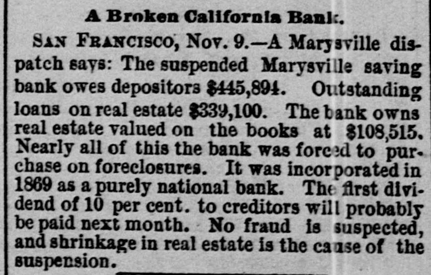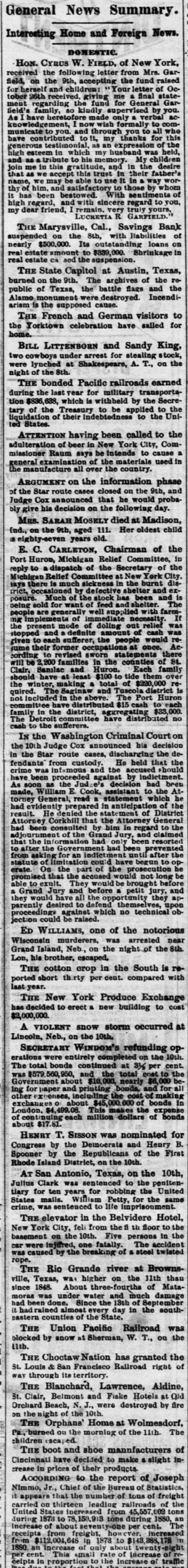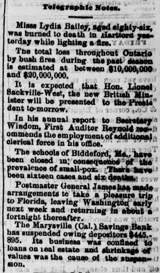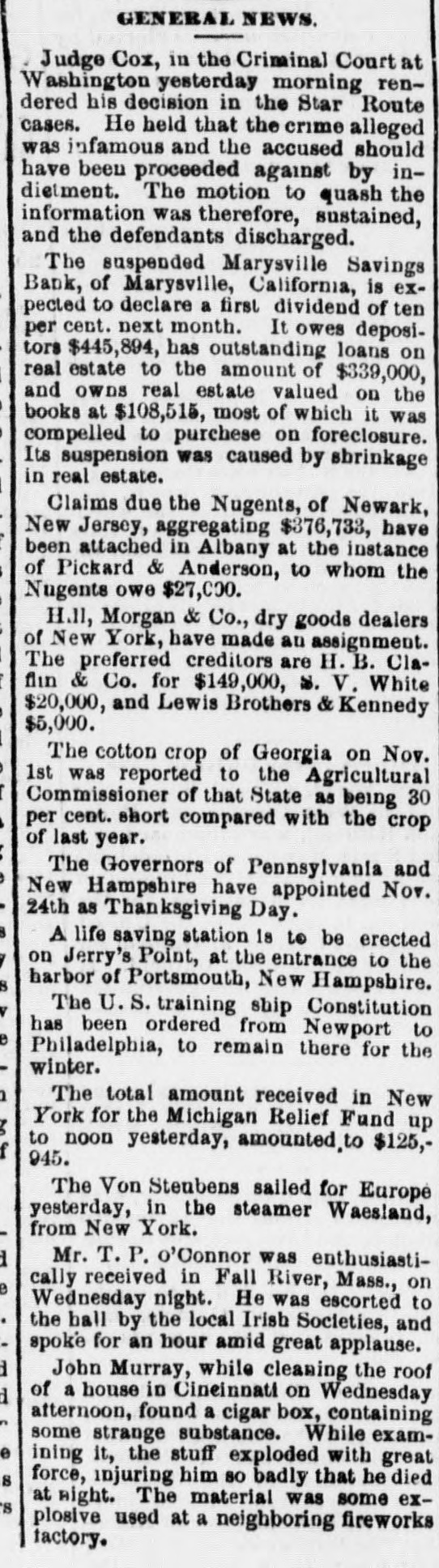 THIS MORNING'S NEWS. In New York Government bonds are quoted at 116 for 4s of 1907 113 for 4}s; 1011 for 34s sterling, $4811@485}: silver bars, 112}. Silver in London, 51 14-16d ; consols, 100 7-16d 5 per cent. United States bonds, extended, 105; 4s, 119]; 41s, 1164. In San Francisco half dollars are quoted at 1/2 discount to par; Mexican dollars, 921@93c. There is but little interest in mining stocks at San Francisco at present. The variations from day to day are small. Within the past week assessments have gone on as follows: Sierra Nevada, 81 per share; Mexican, 81; Hale & Norcross, 50c and Yellow Jacket, $1. There is a report at Eureka, Nev., of the discovery of a great bonanza in the Bristol Dist ict, Lincoln county. Wm. New Kim, alias Ah Kim, a student at the Marietta (Ohio) College, committed suicide at that place yesterday. Arthur Lefroy, the English railway murderer, has been convicted and sentenced to be changed. C. Beardsley, of Forest City, died suddenly at Marysville yesterday, while sitting in a chair talking with friends. A. L. Tucker, freight agent of the North Pacific Railroad, at Cheney, W. T., has absconded with $600 of the company's funds. A fatal case of small-pox has occurred at Spokan Falls, W.T. H. B. Ludworth was acquitted of the murder of Miguel Perez at Bikerefield yesterday. Fire on the meadows, near Pendleton, Or.; loss, 89,500. The Marysville Savings Bank has suspended, on account of the depreciation of real estate held as security. E. Hyer was shot by B. Buchanan at Bellevue, Wood river, Idaho, and instantly killed. A fire at Ruby Hill, Nev., yesterday, destroyed Mrs. Kavanaugh's lodging-house; loss, $2,500. A powder explosion near Hancock, Lake Su; erior, did great damage to property and caused the loss of three lives. In a collision of freight trains near Port Jervis, . Y., yesterday, three men were killed and both trains wrecked. Dr. B. Barnum killed himself Sunday at Schoolcraft, Mich. In attempting to arrest two burglars at St. Louis, a policeman was shot dead. A six-year-old child was kicked to death by a mule Sunday, near Paducah, Ky. Fire at Langhorn, Pa. M.A. Taylor, a Republican, has been elected Mayor of Austin, Tex. Gladstone is guarded by officers when he appears in public. At Marion station, Miss., yesterday, four white men were killed and two wounded by negroes. Georgie Williams, 2 years old, was killed at San Jose yesterday by the accidental discharge of a gun in the hands of his brother, aged 6. Eleven valuable horses were killed by a train of cars at Caliente, Kern county, Monday. James Crosier, an old resident, died suddenly at Stockton Monday. The total damage by the recent floods on the Mississippi river is estimated at $3,005,000. The potteries of Staffordshire, England, are on the eve of a gigantic strike. Russell Price was drowned yesterday in Linn county, Oregon, while attempting to ford a stream. In a colliery explosion at Dulinez, Spain, fifteen persons were killed and five injured. One of the youthful train robbers recently sentenced to the Arkansas Penitentiary died in that institution yesterday. Returns from yesterday's State elections in the East, as far as received, are given this morning, having been specially telegraphed to the RECORDUNION.