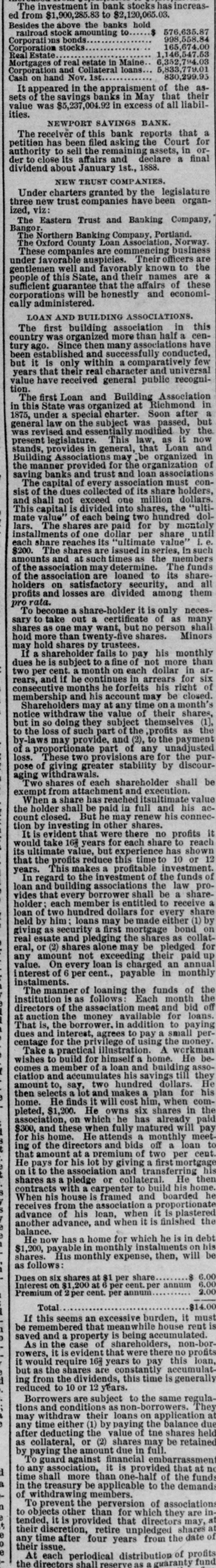 The in bank stock ed from $1,900,285.83 to $2,120,065.03 Besides the above the banks hold railroad stock amounting to Corporati ons bonds Corporation stocks Real Estate Mortgages of real estate in Maine Corporation and Collatera loans Cash on hand Nov. 1st It appeared in the appraisment of the sets of the savings banks in May that their value was $5,237,004.92 in excess of all liabil ities. NEWPORT SAVINGS BANK. The receiver of this bank reports that petition has been filed asking the Court for authority to sell the remaining assets, in orfinal der to close its affairs and declare a dividend about January 1st. 1888. NEW TRUST COMP. ANIES. Under charters granted by the legislature three new trust companies have been organized, viz The Eastern Trust and Banking Company Bango: The Northern Banking Company, Portland The Oxford County Loan Associati Norway These companies are commencing business under favorable auspicies. Their officers are gentlemen well and favorably known to the people of this State, and their names are sufficient guarantee that the affairs of these corporations will be honestly and economically administered LOAN AND BUILDING ASSOCIATIONS. The first building association in this country was organized more than half century ago. Since then many associ ations have been established and successfully conducted, but it is only within a comparatively few years that their real character and universal value have received general public recogni tion. The first Loan and Building Association in this State organized at Richmond 1875, under a special charter Soon after but general law on the subject was passed, the was revised and essentially modified by present legislature. This law, as it now stands, provides in general, that Loan and organized be Associations may in Building the manner provided for the organization saving banks and trust and loan associations The capital of every association must sist of the dues collected of its share holders and shall not exceed one million dollars This capital is divided into shares, the mate value of each being two hundred lars. The shares are paid for by montal installments of one dollar per share until each share reaches its "ultimate value $200. The shares are issued in series, in amounts and at such times as the members of the association may determine. The funds of the association are loaned to its share holders on satisfactory security and all profits and losses are divided among them rata. To become a share-holder it is only necessary to take out a certificate of as many shares as one may want. but no person shall hold more than twenty-five shares. Minors may hold shares by trustees. shareholder fails to pay his monthly dues he is subject to a fine of not more than two per cent. a month on each dollar in rears, and if he continues in arrears for six consecutive months he forfeits his right membership and his account may be closed Shareholders may at any time on month notice withdraw the value of their shares but in so doing they subject themselves to the loss of such part of the profits as the v-laws may provide, and (2). the payment of a proportionate part of any unadjusted loss. These two provisions are for the purpose of giving greater stability by discour aging withdrawals. Two shares of each shareholder shall be exempt from atta achment and execution. When a share has reached itsultimate value the holder shall be paid in full and his account closed. But he may renew his connec tion by investing in other shares. it It is evident that were there no profits would take 16 years for each share to reach its ultimate value, but experience has shown 12 that the profits reduce this time to 10 or years. This makes a profitable of In regard to the investment of the funds loan and building associations the law provides that every borrower shall be shareholder each member is entitled to receive loan of two hundred dollars for every share held by him: loans may be made either giving as security a first mortgage bond real estate and pledging the shares collat eral, or (2) shares alone may be pledged for any amount not exceeding their paid up value. On every loan is charged an annual interest of 6 per cent., payable in monthly instalments. The manner of loaning the funds of the institution as follows: Each month the off directors of the association meet and bid at auction the money available for loans. That is, the borrower. in addition to paying dues and interest, agrees to pay small percentage for the privilege of using the money Take a practical illustration. A wishes to build for himself a home. He becomes a member of loan and building ciation and accumulates his till they amount to, say, two hundred dollars. then selects lot and makes plan for his home. He finds it will cost him, when completed, $1,200. He owns six shares in the association, on which he has already paid $300, and these when fully matured will pay for his home. He attends monthly meet to ing of the directors and bids off a loan that amount at premium of two per cent He pays for his lot by giving first mortgag on it to the association and transferring shares as a pledge or collateral He then contracts with carpenter to build his home he When his house is framed and boarded receives from the association advance of his loan, when it plastered another advance, and when it is finished the balance. He now has a home for which he is in debt $1,200. payable in monthly instalments on his shares. His monthly expense, then, will be as follows Dues on six shares at $1 per share Interest on 1.200 at per cent. per annum 2.00 Premium of per cent. per annum $14. Total If this seems an excessive burden, it must be remembered that meanwhile house rent is saved and a property is being accumulated As in the case of shareholders, non-borit is evident that were there no profits would require 16 years to pay this loan. but as the shares are constantly ing from the dividends, this time is generally reduc