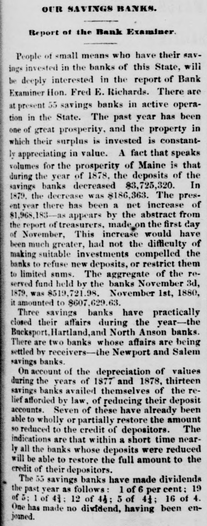 THE BANKS PAY 20 PER CENT OF THEIR EARNINGS INTO THE STATE TREASURY EVERY YEAR The State Bank Examiner, Hon. Fred E. the Richards of Camden, has presented twenty-fourth annual report of his department in conformity to the law of the State. It is a of voluminous and interesting document which we can give but a brief synopsis. Each of the State banking institutions has been visited during the year, and a careful baland thorough examination made, a trial ance taken, the bonds, stocks, notes, books cash. d and other securities examined, and the these proved to exactly correspond with vouchers. F BANKS OF DISCOUNT There are but two banks of this character acting under authority of the State, whose Eastaffairs are not entirely closed. viz. the Both and Mercantile banks of Bangor. of ern these have surrendered their charters, and are redeeming the outstanding circulation, and will soon make a final settlement. SAVINGS BANKS. There are three savings banks that have the practically closed their affairs during viz. the Bucksport, Hartland, and year, October 3d, the receiver of the Savings Bank made a per cent., an dend Bucksport North of Anson. 111 making tinal divi- aggregate settleof 711 per cent. paid the depositors in Savment. The trustees of the North Anson Bank. in October 1879. voted a final divi- voted dend ings of its funds, and, in January last, of surrender its charter. The treasurer the to Hartland Savings Bank. November 1st. be reported the amount due depositors to 814. and cash on hand 814. There are two banks whose affairs are and besettled by receivers-the Newport will Solon ing banks. It is estimated that there 70 finally be paid depositors,by the first 65 to per cent., and by the latter 100 per cent. BANKS WITH DEPOSIT ACCOUNTS REDUCED. of the depreciation of values the years of 1877 and banks availed during savings On account themselves 1878. their of thirteen the deposit relief afforded by law. of reducing been account. Seven of these have already the able to wholly or partially restore amount so reduced. and the indications the are t that. within a short time, nearly all banks, whose deposit accounts were reduced, the will be able to restore the full amount to credit of their depositors. On account of the peculiar financial condition of the town, an injunction was granted July 3d. by Judge Danforth, restraining payment to depositors in the Wiscasset Savings the Bank. of more than 20 per cent. of amount of their deposits. With the estimated value of the assets of this bank, which, careful examination, is regarded sufficiently upon low. the bank has a surplus. above the all liabilities, of $12,677.40, and with deearnings of another year, it can pay its positors dollar for dollar. without realizing from its loan on mortgages of real estate. 2 DEPOSITS. During the year 1878, the deposits of the In savings banks decreased $3,725,320.00. 1879. the decrease was $186,363.00. The of present year there has been a net increase $1,968,183.00 RESERVED FUND. The of the reserved fund held the banks November 3d. 1879, was to November 1st. 1880. it 721.98: by aggregate amounted 8519.- is $607,629.63. The safety of depositors dependent upon this safe-guard to secure against losses. that the Examiner recommends the law be amended, so that this fund five shall amount to ten per cent. instead of per cent. of the assets of the bank. before an extra dividend be declared. INVESTMENTS. mortgages of real estate have ever as the best the of bank officers been While experience regarded possible has the security, demon- availastrated. to their satisfaction, that bility of money loaned on real estate mortis inadequate to meet, at all times, gages, the demands of depositors. whose deposits The by them are regarded as a loan on call. mortgage loans have. in consequence, been gradually reduced. and investments in securities more easily converted to cash have been made. The propriety of investing the deposits of savings banks in railroad stocks, the Examiner thinks is. at least. questionable. Some of the banks continue to make loans on names alone. Although no losses have been refrom such loans. it is. nevertheless, a ported violation of the law. to which the attention x of the officers of such banks has already been called. The Examiner hopes that these loans will soon be collected. and no new transactions of this character be negotiated. DIVIDENDS. : The fifty-five savings banks have made dividends as follows one, 6 percent; nineteen. cent: one. 4 3.4 per cent: twelve, 1-2 per per cent; five, 4 1-4 per cent; sixteen hav4 per cent. One has made no dividend, ing been enjoined. STATE TAX. The bonds issued by municipalities and of railroads years ago. bearing high rates form an important factor in the reof the banks. These and interest, rapidly sources maturing. investments securities at possible. much are of interest only, are of the banks must less. year Bonds, of The lower grow earnings rates correspondingly sufficiently unquestionable of necessity, by value year. to be held by savings banks, bearing 4 1-2 at cent interest. can only be purchased if per premium. and the present State tax. assessed a and collected without expense to the State, must amount to. at least, 20 per cent. of the revenue received from such safe ine vestments as are afforded the banks at the present time. AGGREGATE STATEMENT, Nov. 1, 1880.