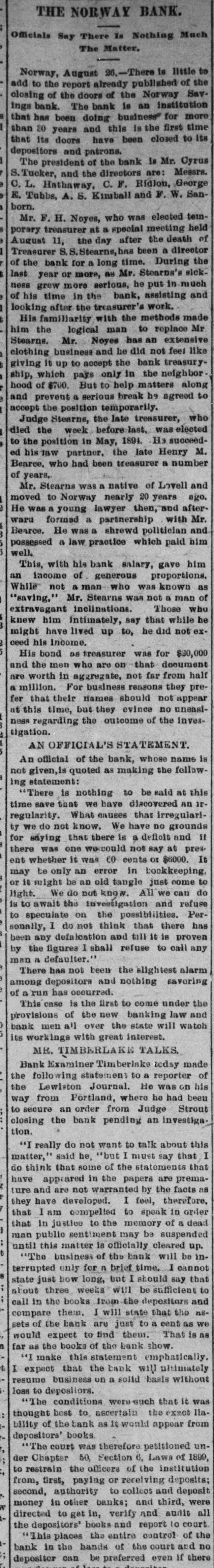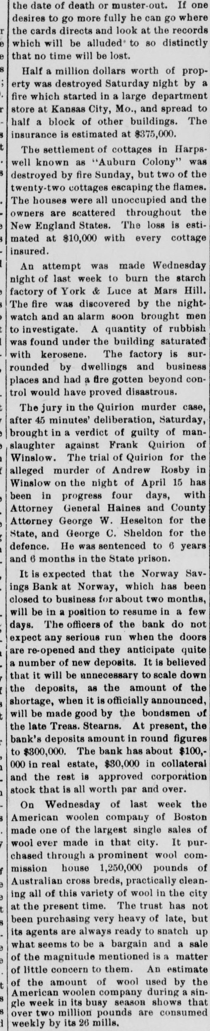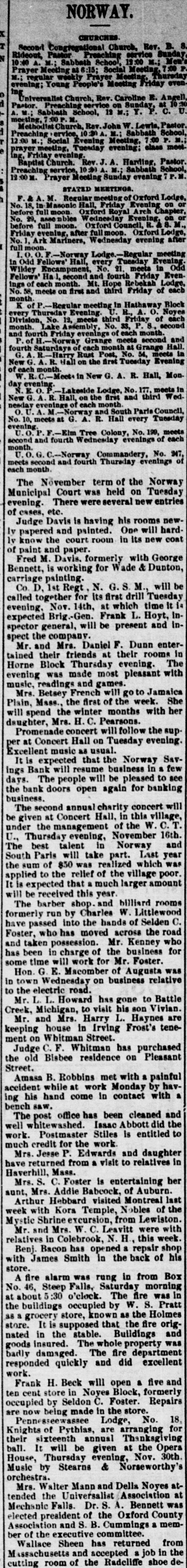 NORWAY. CHURCHES Second Congregational Church, Rev. B. 8. Rideout, Pastor Preaching service Sunday, 10:40 A. M.; Sabbath School, 12:00 M.; Mem's Prayer Meeting at 6 Social Meeting 7:00 P M.; regular weekly Prayer Meeting, Thursday evening; Young People's Meeting Friday even. ing Universalist Church, Rev. Caroline E. Angell Pastor. Preaching service on Sunday, at 10 30 A. M.; Sabbath School, 12 M.; Y. P. C. U. meeting, M. Methodist Church, Rev. John W. Lewis, Pastor. Preaching ervice, 10 A. M.: Sabbath School, 12 00 M.; Social Evening Meeting, 7:00 P. M. prayer meeting, Tuesday evening; class meet. ing. Friday evening Baptist Church. Rev. J. A. Harding, Pastor. Preaching service, 91 A. M.; Sabbath School, 12:00 M. Prayer Meeting Sunday evening M. STATED MEETINGS. A. F.& M. Regular meeting of Oxford Lodge, No. 18, in Masonic Hall, Friday Evening on or before full moon Oxford Royal Arch Chapter, No. 29, assembles Wednesday Evening, on or before full moon. Oxford Council, R.& 8. M Friday evening, after fullmoon. Oxford Lodge, No. 1, Ark Mariners, Wednesday evening after full moon. I. F.-Norway Lodge.-Regular meeting in Odd Fellows' Hall, every Tuesday Evening Wildey Encampment, No. 21. meets in Odd Fellows' Ha 1, second and fourth Friday Even ings of each month. Mt. Hope Rebekah Lodge, No. 58, meets on first and third Friday of each month K of .--Regular meeting in Hathaway Block every Thursday Evening U. R., A. O. Noyes Division, No. 19, meets third Friday of each month. Lake Assembly, No. SS,P.S, second and fourth Friday evenings of each month. P. of H.-Norway Grange meets second and fourth Saturdays of each month at Grange Hall G. R.-Harry Rust Post, No. 54, meets in New G. A. R. Hall on the first Tuesday Evening of W each R. month C.-Meet+ in New G. A. R. Hall, Mon day evening N. E. Lakeside Lodge, No. 177. meets in New G. A. R. Hall, on the first and third Wed. nesday evenings of each month O. U. A. -Norway and South Paris Council, No. 10, meets at G. A. R. Hall every Tuesday evening. U. O. F Elm Tree Colony, No. 199, meets second and fourth Wednesday evenings of each month. U.O. G. C.-Norway Commandery, No. 947, meets second and fourth Thursday evenings of each month. The November term of the Norway Municipal Court was held on Tuesday evening. There were several new entries of cases, etc. Judge Davis is having his rooms newly papered and painted. One will hardlv know the court room in its new coat of paint and paper. Fred M. Davis. formerly with George Bennett, is working for Wade & Dunton, carriage painting. Co. D, 1st Regt N. G. S. M., will be called together for its first drill Tuesday evening. Nov. 14th, at which time It 14 expected Brig.-Gen. Frank L. Hoyt, Inspector general, will be present and Inspect the company. Mr. and Mrs. Daniel F. Dunn entertained their friends at their rooms in Horne Block Thursday evening. The evening was made most pleasant with music, readings and games. Mrs. Betsey French will go to Jamaica Plain, Mass., the first of the week. She will spend the winter months with her daughter, Mrs. H. C. Pearsons. Promenade concert will follow the supper at Concert Hall on Tuesday evening. Excellent music as usual. It is expected that the Norway Savings Bank will resume business in a few days. The people will be pleased to see the bank doors open again for banking business. The second annual charity concert will be given at Concert Hall. in this village, under the management of the W. C.T. U., Thursday evening, November 16th. The best talent in Norway and South Paris will take part. Last year the sum of 850 was realized which was applied to the relief of the village poor. It is expected that a much larger amount will be received this year. The barber shop and billiard rooms formerly run by Charles W. Littlewood have passed into the hands of Selden C. Foster, who has moved across the road and taken possession. Mr. Kenney who has been in charge of the business for some time will work for Mr. Foster. Hon. G. E. Macomber of Augusta was in town Wednesday on business relative to the electric road. Mr. L. L. Howard has gone to Battle Creek, Michigan, to visit his son Vivian. Mr. and Mrs. Harry L. Haynes are keeping house in Irving Frost's tenement on Whitman Street. Judge C. F. Whitman has purchased the old Bisbee residence on Pleasant Street. Amasa B. Robbins met with a painful accident while at work Monday by having his hand come in contact with a bench saw. The post office has been cleaned and well whitewashed. Issac Abbott did the work. Postmaster Stiles is entitled to much credit for the work. Mrs. Jesse P. Edwards and daughter have returned from a visit to relatives in Haverhill, Mass. Mrs. S. C. Foster is entertaining her aunt, Mrs. Addie Babcock, of Auburn. Arthur Hebbard visited Montreal last week with Kora Temple, Nobles of the Mystic Shrine excursion, from Lewiston. Mr. and Mrs. W. C. Leavitt were with relatives in Colebrook, N. H., this week. Benj. Bacon has opened a repair shop with James Smith in the back of his store. A fire alarm was rung in from Box No. 46, Steep Falls, Saturday morning at about 5:30 o'clock. The fire was in the buildings occupied by W. S. Pratt as a grocery store, known as the Holmes store. It is supposed that the fire orignated in the stable. Buildings and goods insured. The whole property was badly damaged. The fire department responded quickly and did excellent work. Frank H. Beck will open a five and ten cent store in Noyes Block, formerly occupied by Seldon C. Foster. Repairs are now being made in the store. Pennesseewassee Lodge, No. 18, Knights of Pythias, are arranging for their sixteenth annual Thanksgiving ball. It will be given at the Opera House, Thursday evening, Nov. 30th. Music by Stearns & Norseworthy's orchestra. Mrs. Walter Mann and Della Noyes attended the Universalist Association at Mechanic Falls. Dr. S. A. Bennett was elected president of the Oxford County Association and S. B. Cummings a mem-