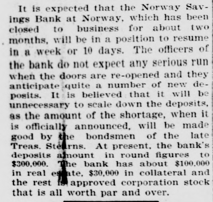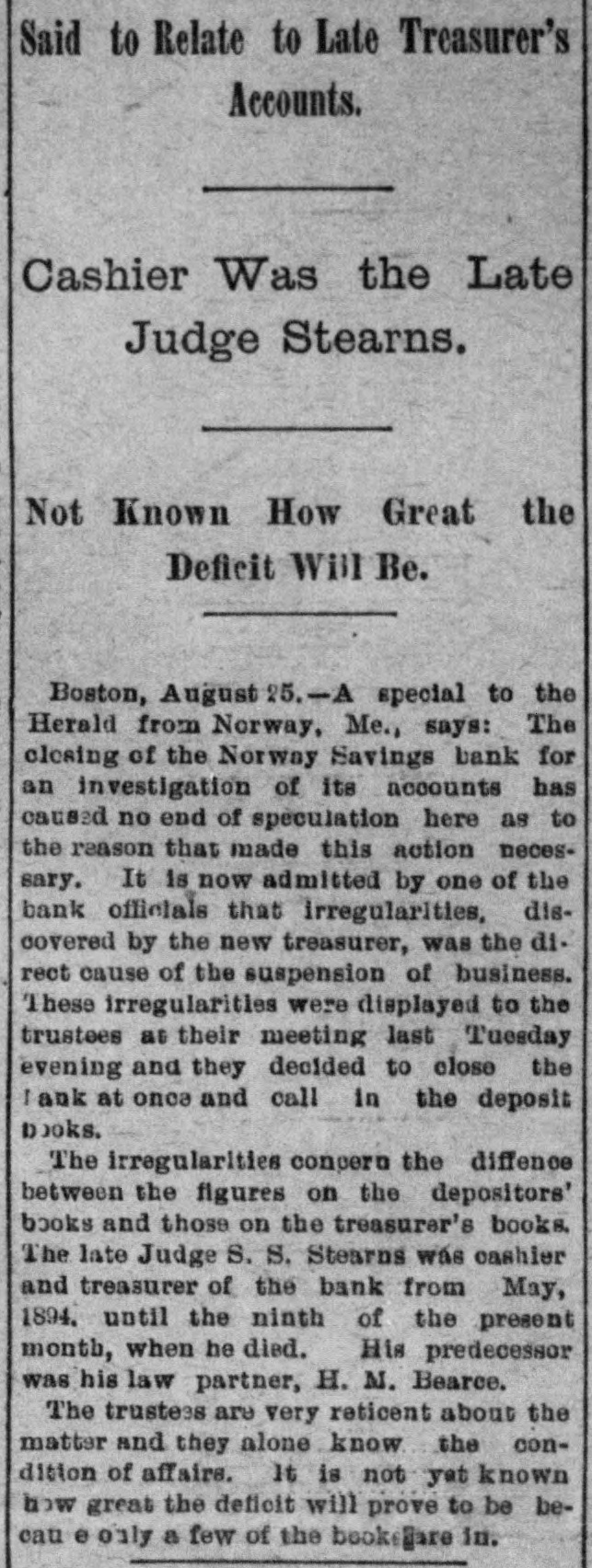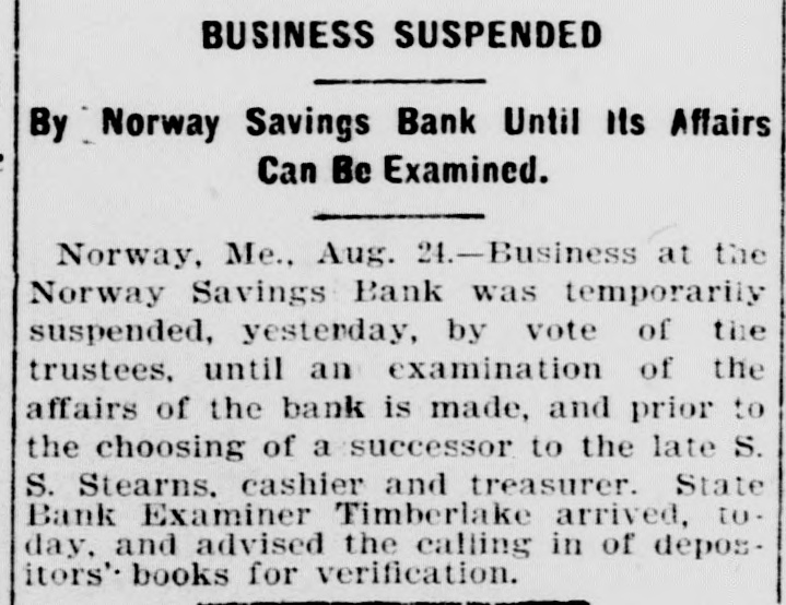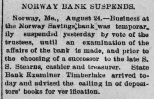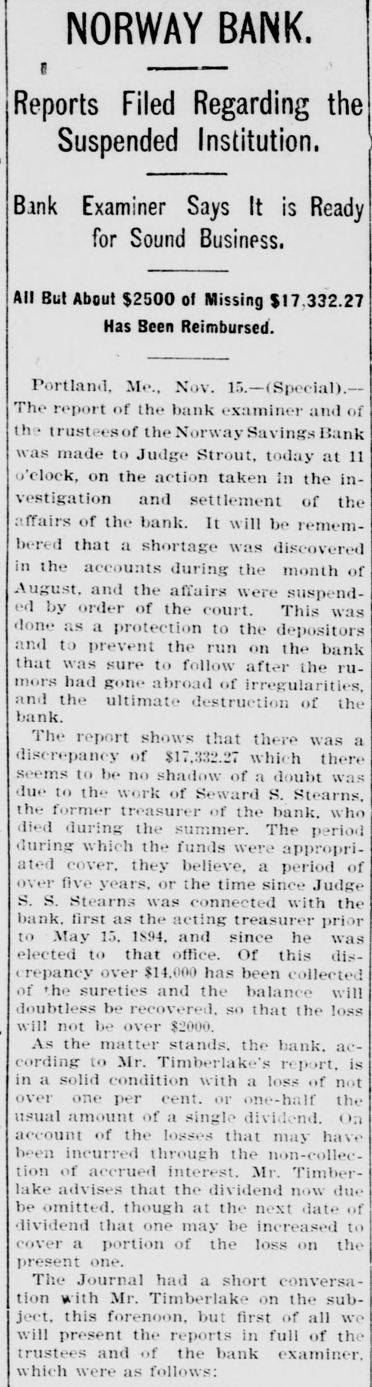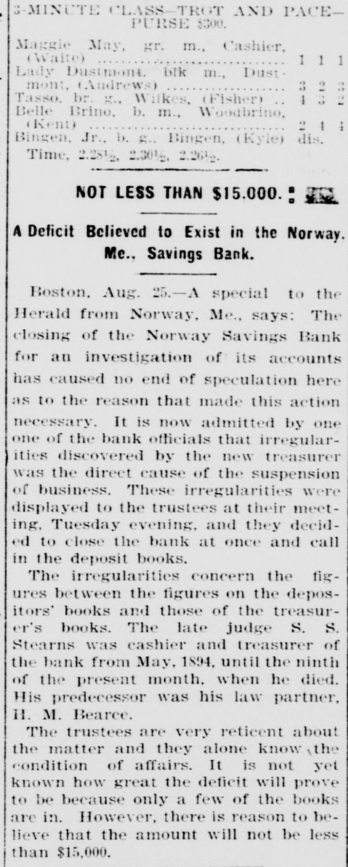 NORWAY. CHURCHES Second Congregational Church, Rev. B. 8. Rideout, Pastor Preaching service Sunday, 10:40 A. M.; Sabbath School, 12:00 M.; Mem's Prayer Meeting at 6 Social Meeting 7:00 P M.; regular weekly Prayer Meeting, Thursday evening; Young People's Meeting Friday even. ing Universalist Church, Rev. Caroline E. Angell Pastor. Preaching service on Sunday, at 10 30 A. M.; Sabbath School, 12 M.; Y. P. C. U. meeting, M. Methodist Church, Rev. John W. Lewis, Pastor. Preaching ervice, 10 A. M.: Sabbath School, 12 00 M.; Social Evening Meeting, 7:00 P. M. prayer meeting, Tuesday evening; class meet. ing. Friday evening Baptist Church. Rev. J. A. Harding, Pastor. Preaching service, 91 A. M.; Sabbath School, 12:00 M. Prayer Meeting Sunday evening M. STATED MEETINGS. A. F.& M. Regular meeting of Oxford Lodge, No. 18, in Masonic Hall, Friday Evening on or before full moon Oxford Royal Arch Chapter, No. 29, assembles Wednesday Evening, on or before full moon. Oxford Council, R.& 8. M Friday evening, after fullmoon. Oxford Lodge, No. 1, Ark Mariners, Wednesday evening after full moon. I. F.-Norway Lodge.-Regular meeting in Odd Fellows' Hall, every Tuesday Evening Wildey Encampment, No. 21. meets in Odd Fellows' Ha 1, second and fourth Friday Even ings of each month. Mt. Hope Rebekah Lodge, No. 58, meets on first and third Friday of each month K of .--Regular meeting in Hathaway Block every Thursday Evening U. R., A. O. Noyes Division, No. 19, meets third Friday of each month. Lake Assembly, No. SS,P.S, second and fourth Friday evenings of each month. P. of H.-Norway Grange meets second and fourth Saturdays of each month at Grange Hall G. R.-Harry Rust Post, No. 54, meets in New G. A. R. Hall on the first Tuesday Evening of W each R. month C.-Meet+ in New G. A. R. Hall, Mon day evening N. E. Lakeside Lodge, No. 177. meets in New G. A. R. Hall, on the first and third Wed. nesday evenings of each month O. U. A. -Norway and South Paris Council, No. 10, meets at G. A. R. Hall every Tuesday evening. U. O. F Elm Tree Colony, No. 199, meets second and fourth Wednesday evenings of each month. U.O. G. C.-Norway Commandery, No. 947, meets second and fourth Thursday evenings of each month. The November term of the Norway Municipal Court was held on Tuesday evening. There were several new entries of cases, etc. Judge Davis is having his rooms newly papered and painted. One will hardlv know the court room in its new coat of paint and paper. Fred M. Davis. formerly with George Bennett, is working for Wade & Dunton, carriage painting. Co. D, 1st Regt N. G. S. M., will be called together for its first drill Tuesday evening. Nov. 14th, at which time It 14 expected Brig.-Gen. Frank L. Hoyt, Inspector general, will be present and Inspect the company. Mr. and Mrs. Daniel F. Dunn entertained their friends at their rooms in Horne Block Thursday evening. The evening was made most pleasant with music, readings and games. Mrs. Betsey French will go to Jamaica Plain, Mass., the first of the week. She will spend the winter months with her daughter, Mrs. H. C. Pearsons. Promenade concert will follow the supper at Concert Hall on Tuesday evening. Excellent music as usual. It is expected that the Norway Savings Bank will resume business in a few days. The people will be pleased to see the bank doors open again for banking business. The second annual charity concert will be given at Concert Hall. in this village, under the management of the W. C.T. U., Thursday evening, November 16th. The best talent in Norway and South Paris will take part. Last year the sum of 850 was realized which was applied to the relief of the village poor. It is expected that a much larger amount will be received this year. The barber shop and billiard rooms formerly run by Charles W. Littlewood have passed into the hands of Selden C. Foster, who has moved across the road and taken possession. Mr. Kenney who has been in charge of the business for some time will work for Mr. Foster. Hon. G. E. Macomber of Augusta was in town Wednesday on business relative to the electric road. Mr. L. L. Howard has gone to Battle Creek, Michigan, to visit his son Vivian. Mr. and Mrs. Harry L. Haynes are keeping house in Irving Frost's tenement on Whitman Street. Judge C. F. Whitman has purchased the old Bisbee residence on Pleasant Street. Amasa B. Robbins met with a painful accident while at work Monday by having his hand come in contact with a bench saw. The post office has been cleaned and well whitewashed. Issac Abbott did the work. Postmaster Stiles is entitled to much credit for the work. Mrs. Jesse P. Edwards and daughter have returned from a visit to relatives in Haverhill, Mass. Mrs. S. C. Foster is entertaining her aunt, Mrs. Addie Babcock, of Auburn. Arthur Hebbard visited Montreal last week with Kora Temple, Nobles of the Mystic Shrine excursion, from Lewiston. Mr. and Mrs. W. C. Leavitt were with relatives in Colebrook, N. H., this week. Benj. Bacon has opened a repair shop with James Smith in the back of his store. A fire alarm was rung in from Box No. 46, Steep Falls, Saturday morning at about 5:30 o'clock. The fire was in the buildings occupied by W. S. Pratt as a grocery store, known as the Holmes store. It is supposed that the fire orignated in the stable. Buildings and goods insured. The whole property was badly damaged. The fire department responded quickly and did excellent work. Frank H. Beck will open a five and ten cent store in Noyes Block, formerly occupied by Seldon C. Foster. Repairs are now being made in the store. Pennesseewassee Lodge, No. 18, Knights of Pythias, are arranging for their sixteenth annual Thanksgiving ball. It will be given at the Opera House, Thursday evening, Nov. 30th. Music by Stearns & Norseworthy's orchestra. Mrs. Walter Mann and Della Noyes attended the Universalist Association at Mechanic Falls. Dr. S. A. Bennett was elected president of the Oxford County Association and S. B. Cummings a mem-