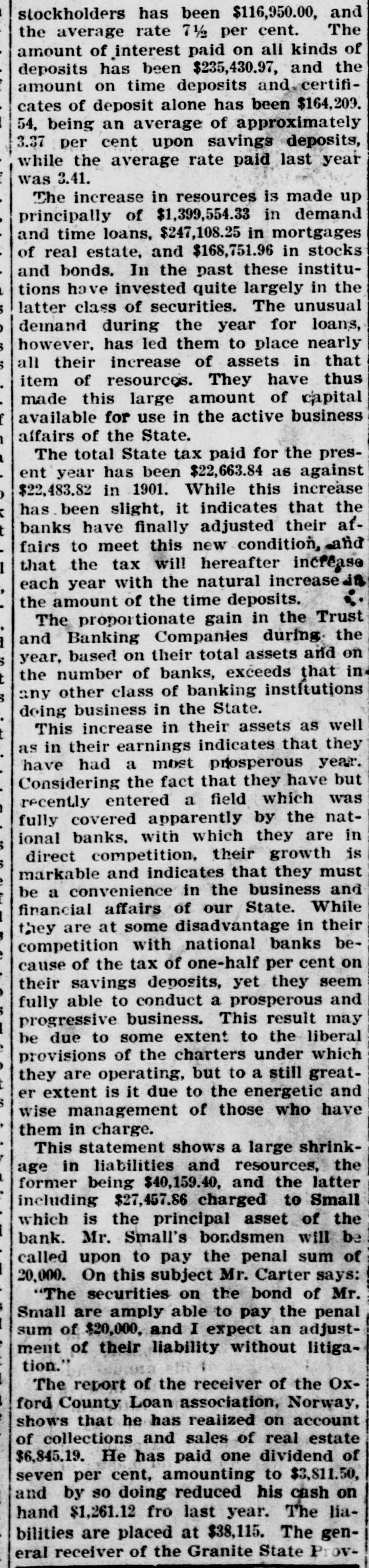 stockholders has been $116,950.00, and the average rate 7½ per cent. The amount of interest paid on all kinds of deposits has been $235,430.97, and the amount on time deposits and certifi- cates of deposit alone has been $164,209. 54, being an average of approximately 3.37 per cent upon savings deposits, while the average rate paid last year was 3.41. The increase in resources is made up principally of $1,399,554.33 in demand and time loans, $247,108.25 in mortgages of real estate, and $168,751.96 in stocks and bonds. In the past these institu- tions have invested quite largely in the latter class of securities. The unusual demand during the year for loans, however, has led them to place nearly all their increase of assets in that item of resources. They have thus made this large amount of capital available for use in the active business affairs of the State. The total State tax paid for the present year has been $22,663.84 as against $22,483.82 in 1901. While this increase has been slight, it indicates that the banks have finally adjusted their af- fairs to meet this new condition, and that the tax will hereafter increase each year with the natural increase in the amount of the time deposits. The proportionate gain in the Trust and Banking Companies during the year, based on their total assets and on the number of banks, exceeds that in any other class of banking institutions doing business in the State. This increase in their assets as well as in their earnings indicates that they have had a most prosperous year. Considering the fact that they have but recently entered a field which was fully covered apparently by the nat- ional banks, with which they are in direct competition, their growth is markable and indicates that they must be a convenience in the business and financial affairs of our State. While they are at some disadvantage in their competition with national banks be- cause of the tax of one-half per cent on their savings deposits, yet they seem fully able to conduct a prosperous and progressive business. This result may be due to some extent to the liberal provisions of the charters under which they are operating, but to a still great- er extent is it due to the energetic and wise management of those who have them in charge. This statement shows a large shrink- age in liabilities and resources, the former being $40,159.40, and the latter including $27,457.86 charged to Small which is the principal asset of the bank. Mr. Small's bondsmen will be called upon to pay the penal sum of 20,000. On this subject Mr. Carter says: "The securities on the bond of Mr. Small are amply able to pay the penal sum of $20,000, and I expect an adjust- ment of their liability without litiga- tion." The report of the receiver of the Ox- ford County Loan association, Norway, shows that he has realized on account of collections and sales of real estate $6,845.19. He has paid one dividend of seven per cent, amounting to $3,811.50, and by so doing reduced his cash on hand $1,261.12 fro last year. The lia- bilities are placed at $38,115. The gen- eral receiver of the Granite State Prov-