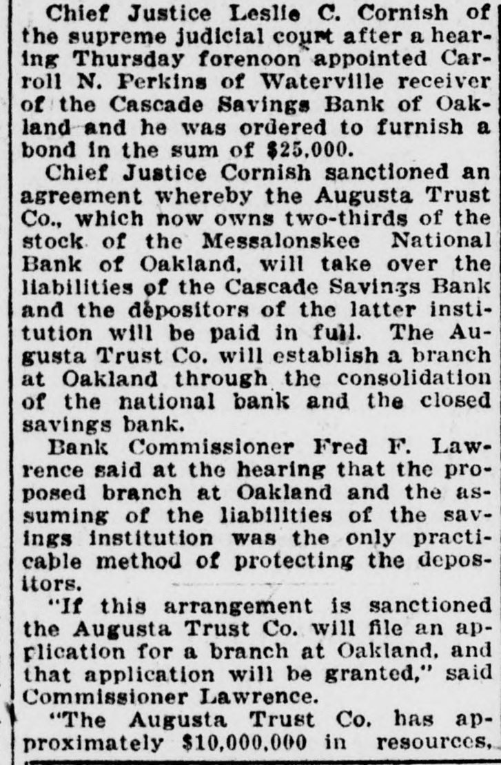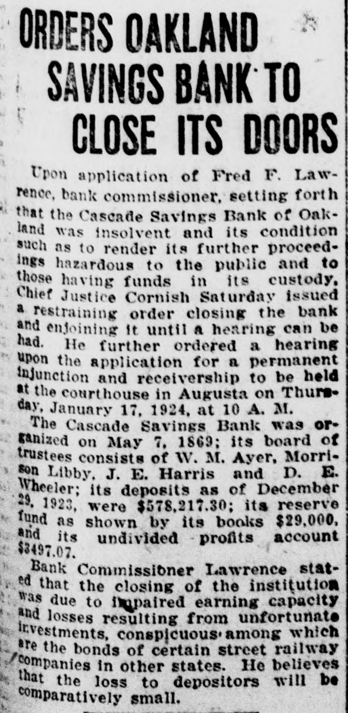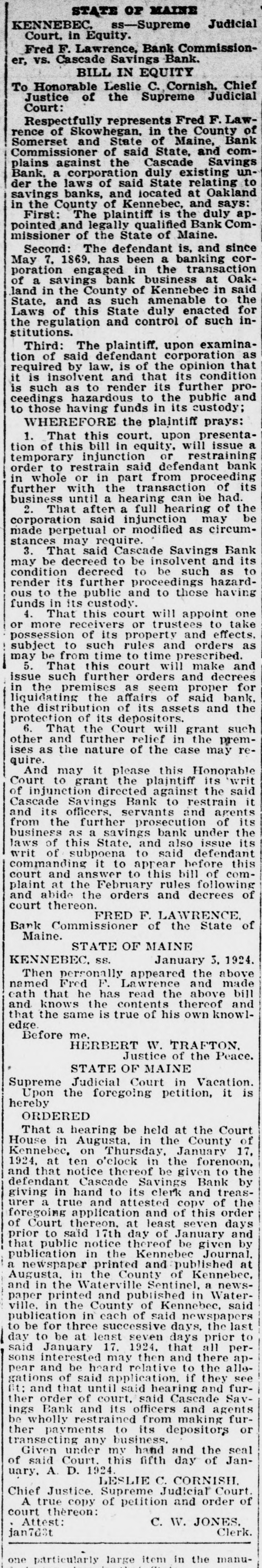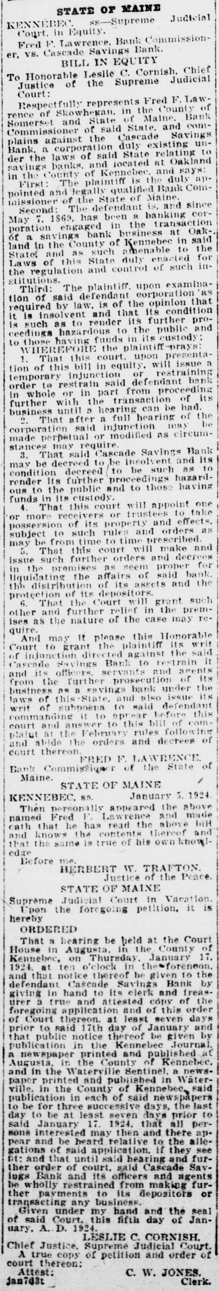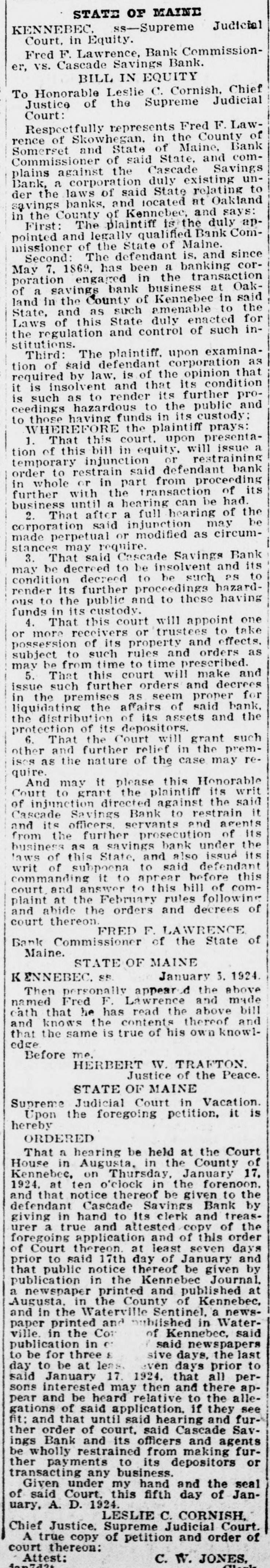 -un Sunsixe Ninp B e laws of said State relating to gs banks. and located at Oakland County of Kennebec. and says: -de slop am s! equal :18 d and legally qualified Bank Comoner of the State of Maine. ond: The defendant is. and since 7. 1869. has been a banking coron engaged in the transaction savings bank business at Oak-, n the County of Kennebec in said and as such amenable to the of this State duly enacted for egulation and control of such inrd: ions. The plaintiff. upon examinaSB, defendent plus 10 red by law. is of the opinion that insolvent and that its condition ch as to render its further proga hazardous to the public and se having funds in its custody: EREFORE the plaintiff That this court. upon presentaf this bill in equity. will issue a rary injunction or restraining to restrain said defendant bank nole or in part from proceeding er with the transaction of its ess until a hearing can be had. That after a full hearing of the ration said injunction may be perpetual or modified as circumes may require. That said Cascade Savings Bank be decreed to be insolvent and its tion decreed to be such as to r its further proceedings hazardo the public and to those having in its custody. That this court will appoint one ore receivers or trustees to take ssion of its property and effects. ct to such rules and orders as be from time to time prescribed. That this court will make and such further orders and decrees n premises as seem proper for ating the affairs of said bank. istribution of its assets and the tion of its depositors. That the Court will grant such and further relief in the premS the nature of the case may reI may it please this Honorable to grant the plaintiff its writ unction directed against the said de Savings Bank to restrain it is officers. servants and agents the further prosecution of its 941 Japan runq STUJAS 8 SU ssa of this State. and also issue its of subpoena to said defendant anding it to aprear before this and answer to this bill of comat the February rules following ibide the orders and decrees of thereon. FRED F. LAWRENCE Commission of the State of ne. STATE OF MAINE January 5. 1924. US NEBRO n personally appeared the above i Fred F. Lawrence and made that he has read the above bill snows the contents thereof and he same is true of his own knowlore me. HERBERT 11". TRAFTON. Justice of the Peace. STATE OF MAINE me Judicial Court in Vacation. in the foregoing petition. it is & DERED bearing be held at the Court