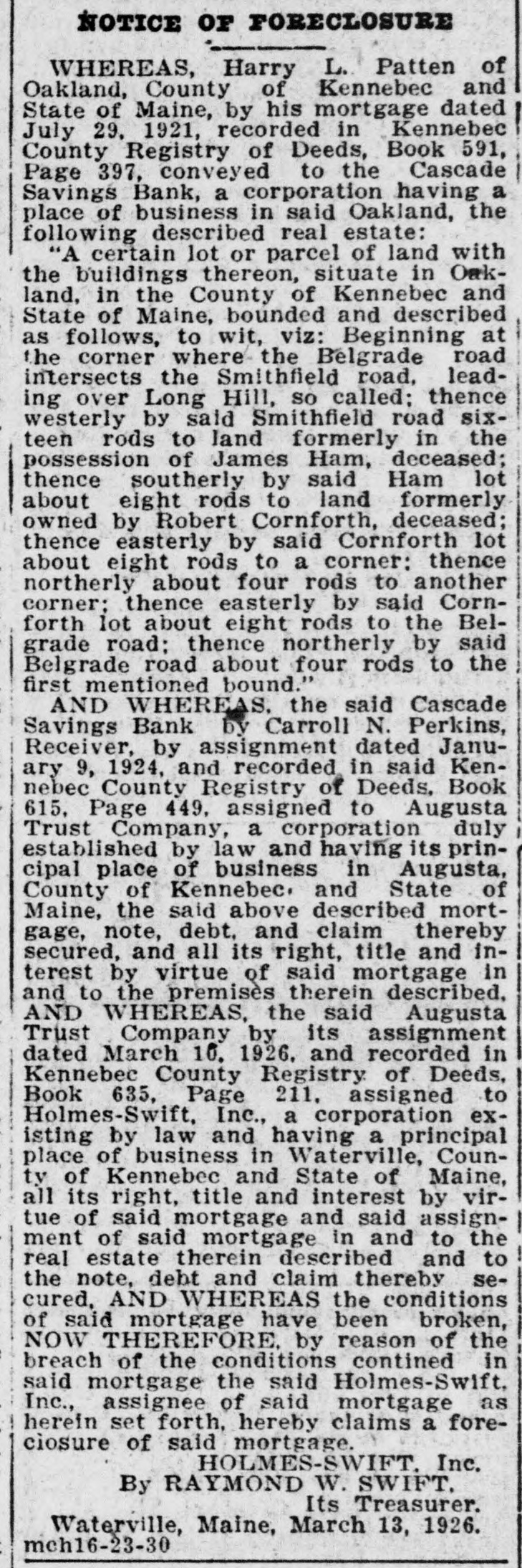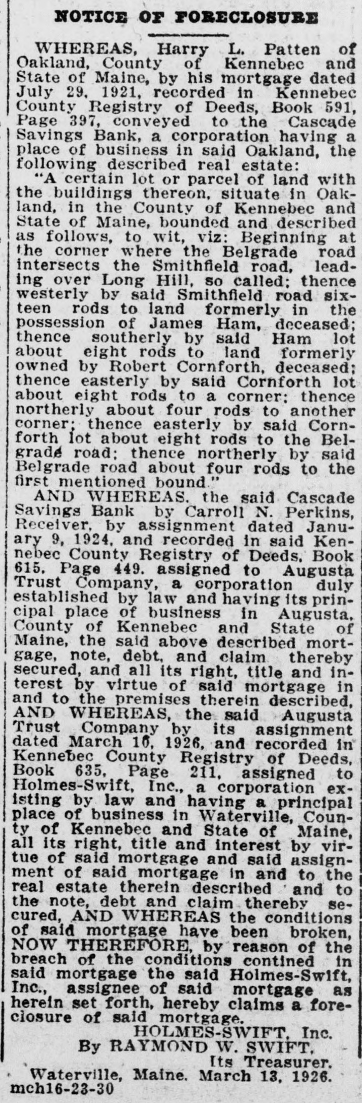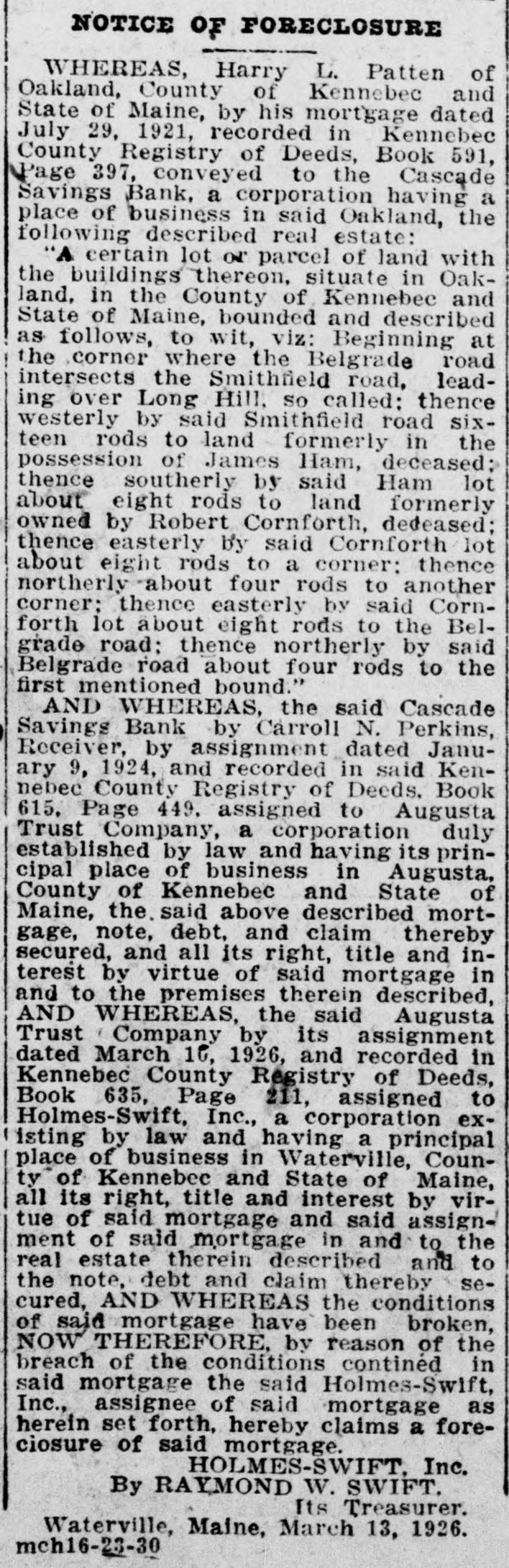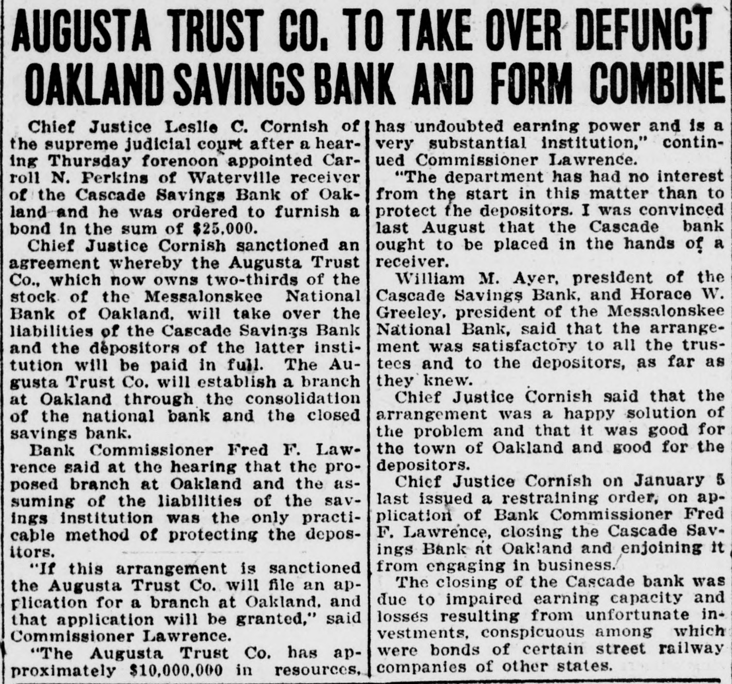 -un Sunsixe Ninp B e laws of said State relating to gs banks. and located at Oakland County of Kennebec. and says: -de slop am s! equal :18 d and legally qualified Bank Comoner of the State of Maine. ond: The defendant is. and since 7. 1869. has been a banking coron engaged in the transaction savings bank business at Oak-, n the County of Kennebec in said and as such amenable to the of this State duly enacted for egulation and control of such inrd: ions. The plaintiff. upon examinaSB, defendent plus 10 red by law. is of the opinion that insolvent and that its condition ch as to render its further proga hazardous to the public and se having funds in its custody: EREFORE the plaintiff That this court. upon presentaf this bill in equity. will issue a rary injunction or restraining to restrain said defendant bank nole or in part from proceeding er with the transaction of its ess until a hearing can be had. That after a full hearing of the ration said injunction may be perpetual or modified as circumes may require. That said Cascade Savings Bank be decreed to be insolvent and its tion decreed to be such as to r its further proceedings hazardo the public and to those having in its custody. That this court will appoint one ore receivers or trustees to take ssion of its property and effects. ct to such rules and orders as be from time to time prescribed. That this court will make and such further orders and decrees n premises as seem proper for ating the affairs of said bank. istribution of its assets and the tion of its depositors. That the Court will grant such and further relief in the premS the nature of the case may reI may it please this Honorable to grant the plaintiff its writ unction directed against the said de Savings Bank to restrain it is officers. servants and agents the further prosecution of its 941 Japan runq STUJAS 8 SU ssa of this State. and also issue its of subpoena to said defendant anding it to aprear before this and answer to this bill of comat the February rules following ibide the orders and decrees of thereon. FRED F. LAWRENCE Commission of the State of ne. STATE OF MAINE January 5. 1924. US NEBRO n personally appeared the above i Fred F. Lawrence and made that he has read the above bill snows the contents thereof and he same is true of his own knowlore me. HERBERT 11". TRAFTON. Justice of the Peace. STATE OF MAINE me Judicial Court in Vacation. in the foregoing petition. it is & DERED bearing be held at the Court