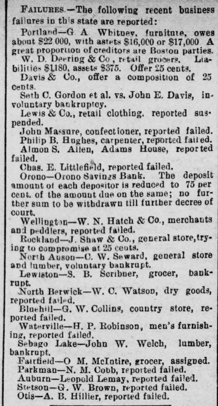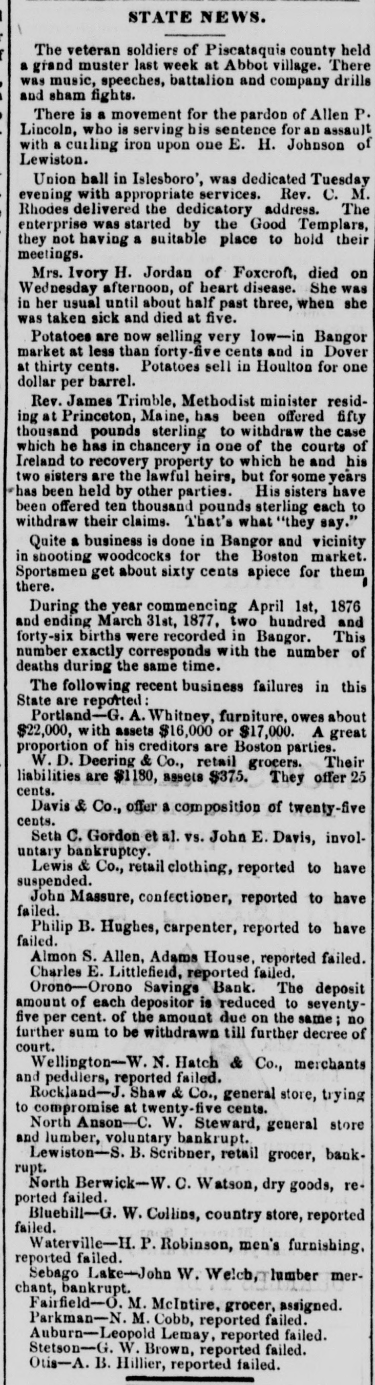 STATE NEWS. The veteran soldiers of Piscataquis county held a grand muster last week at Abbot village. There was music, speeches, battalion and company drills and sham fights. There is a movement for the pardon of Allen P. Lincoln, who is serving his sentence for an assault with a curling iron upon one E. H. Johnson of Lewiston. Union hall in Islesboro', was dedicated Tuesday evening with appropriate services. Rev. C. M. Rhodes delivered the dedicatory address. The enterprise was started by the Good Templars, they not having a suitable place to hold their meetings. Mrs. Ivory H. Jordan of Foxcroft, died on Wednesday afternoon, of heart disease. She was in her usual until about half past three, when she was taken sick and died at five. Potatoes are now selling very low-in Bangor market at less than forty-five cents and in Dover at thirty cents. Potatoes sell in Houlton for one dollar per barrel. Rev. James Trimble, Methodist minister residing at Princeton, Maine, has been offered fifty thousand pounds sterling to withdraw the case which he has in chancery in one of the courts of Ireland to recovery property to which he and his two sisters are the lawful heirs, but for some years has been held by other parties. His sisters have been offered ten thousand pounds sterling each to withdraw their claims. That's what "they say." Quite a business is done in Bangor and vicinity in shooting woodcocks for the Boston market. Sportsmen get about sixty cents apiece for them there. During the year commencing April 1st, 1876 and ending March 31st, 1877, two hundred and forty-six births were recorded in Bangor. This number exactly corresponds with the number of deaths during the same time. The following recent business failures in this State are reported: Portland-G. A. Whitney, furniture, owes about $22,000, with assets $16,000 or $17,000. A great proportion of his creditors are Boston parties. W.D. Deering & Co., retail grocers. Their liabilities are $1180, assets $375. They offer 25 cents. Davis & Co., offer a composition of twenty-five cents. Seth C. Gordon et al. vs. John E. Davis, involuntary bankruptcy. Lewis & Co., retail clothing, reported to have suspended. John Massure, confectioner, reported to have failed. Philip B. Hughes, carpenter, reported to have failed. Almon S. Allen, Adams House, reported failed. Charles E. Littlefield, reported failed. Orone-Orono Savings Bank. The deposit amount of each depositor is reduced to seventyfive per cent. of the amount due on the same no further sum to be withdrawn till further decree of court. Wellington-W. N. Hatch & Co., merchants and peddlers, reported failed. Rockland-J. Shaw & Co., general store, trying to compromise at twenty-five cents. North Anson-C. W. Steward, general store and lumber, voluntary bankrupt. Lewiston-S. B. Scribner, retail grocer, bankrupt. North Berwick-W. C. Watson, dry goods, reported failed. Bluebill-G. W. Collins, country store, reported failed. Waterville-H. P. Robinson, men's furnishing. reported failed. Sebago Lake-John W. Welch, lumber merchant, bankrupt. Fairfield-O. M. McIntire, grocer, assigned. Parkman-N. M. Cobb, reported failed. Auburn-Leopold Lemay, reported failed. Stetson-G. W. Brown, reported failed. Otis-A. B. Hillier, reported failed.