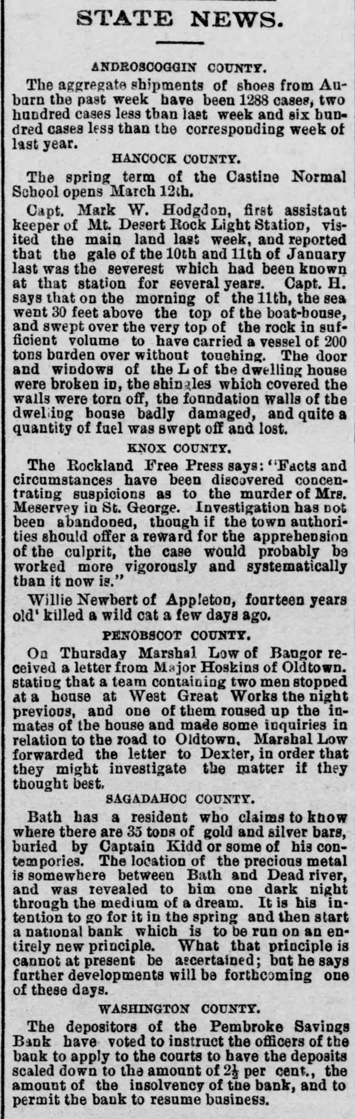 STATE NEWS. ANDROSCOGGIN COUNTY. The aggregate shipments of shoes from Auburn the past week have been 1288 cases, two hundred cases less than last week and six hundred cases less than the corresponding week of last year. HANCOCK COUNTY. The spring term of the Castine Normal School opens March 12th. Capt. Mark W. Hodgdon, first assistant keeper of Mt. Desert Rock Light Station, visited the main land last week, and reported that the gale of the 10th and 11th of January last was the severest which had been known at that station for several years. Capt. H. says that on the morning of the 11th, the sea went 30 feet above the top of the boat-bouse, and swept over the very top of the rock in sufficient volume to have carried a vessel of 200 tons burden over without touching. The door and windows of the L of the dwelling house were broken in, the shingles which covered the walls were torn off, the foundation walls of the dwelling bouse badly damaged, and quite a quantity of fuel was swept off and lost. KNOX COUNTY. The Rockland Free Press says: "Facts and circumstances have been discovered concentrating suspicions as to the murder of Mrs. Meservey in St. George. Investigation has not been abandoned, though if the town authorities should offer a reward for the apprehension of the culprit, the case would probably be worked more vigorously and systematically tban it now is." Willie Newbert of Appleton, fourteen years old' killed a wild cat a few days ago. PENOBSCOT COUNTY. On Thursday Marshal Low of Bangor received a letter from Major Hoskins of Oldtown. stating that a team containing two men stopped at a house at West Great Works the night previous, and one of them roused up the inmates of the house and made some inquiries in relation to the road to Oldtown. Marshal Low forwarded the letter to Dexter, in order that they might investigate the matter if they thought best. SAGADAHOC COUNTY. Bath has a resident who claims to know where there are 35 tons of gold and silver bars, buried by Captain Kidd or some of his contempories. The location of the precious metal is somewhere between Bath and Dead river, and was revealed to bim one dark night through the medium of a dream. It is his intention to go for it in the spring and then start a national bank which is to be run on an entirely new principle. What that principle is cannot at present be ascertained; but he says further developments will be forthcoming one of these days. WASHINGTON COUNTY. The depositors of the Pembroke Savings Bank have voted to instruct the officers of the bauk to apply to the courts to have the deposits scaled down to the amount of 2½ per cent., the amount of the insolvency of the bank, and to permit the bank to resume business.