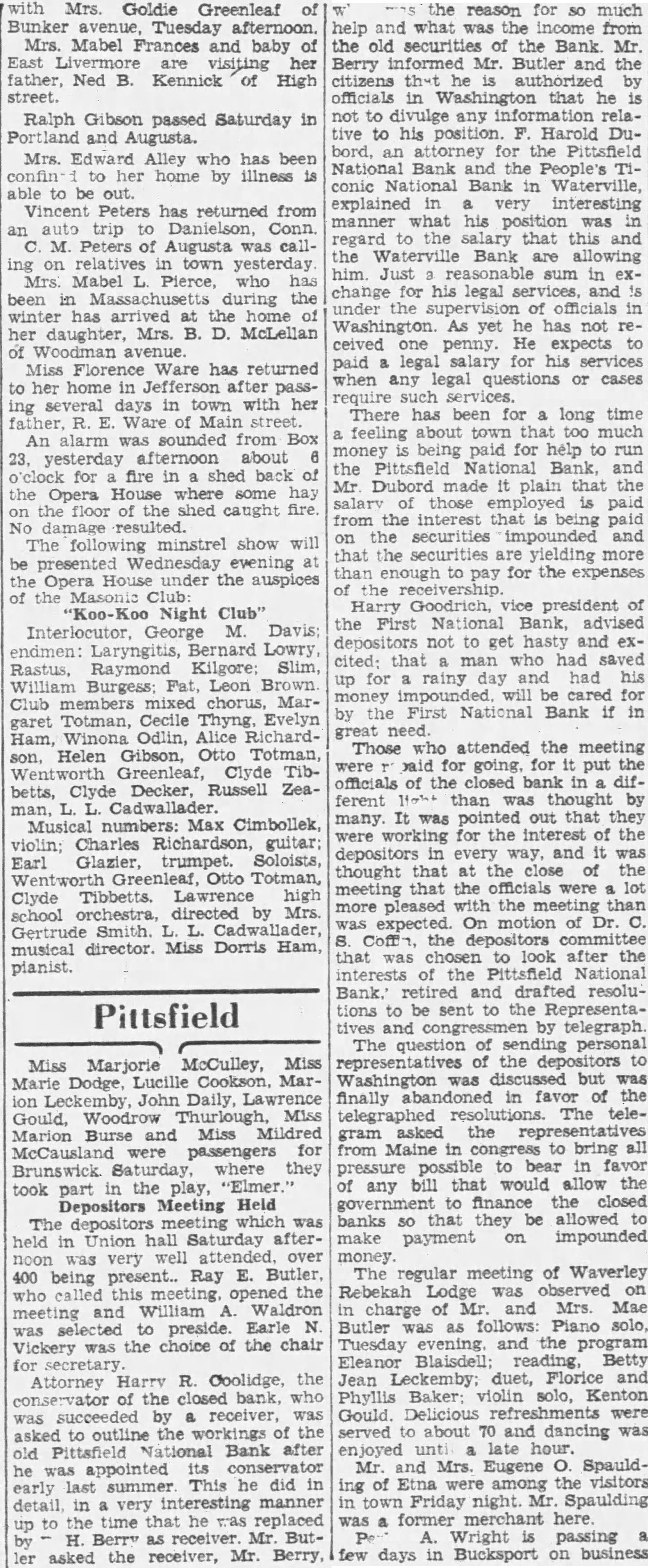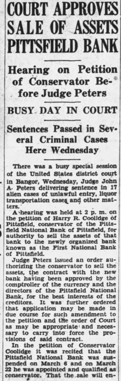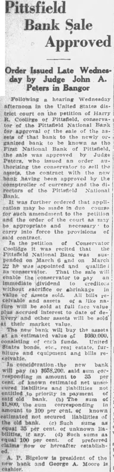 Pittsfield Bank Sale Approved Order Issued Late Wednesday by Judge John A. Peters in Bangor Following hearing Wednesday afternoon in the United States district court on the petition of Harry Coolinge Pittsfield, tor of the Pittafield National Bank for approval of the of the seta that bank to the ganized bank be known the First National Bank of Pittsfield. the sale was approved by Judge Peters. who issued an order thorizing the sell the assets, the contract with the new bank having been by the comptroller and the directors of the Pittafield National Bank. was further ordered that application may be made in due course for such to the petition and the order of the court as may be appropriate and necessary carry into force the provisions of In the petition of Conservator Coolidge was that the Pittsfield Bank was suspended March and on March appointed and qualifie That the sale will enable the conservator an pay dividend creditors without sacrifice shrinkage in value assets sold. bills celvable and like fure will be sold full face value plus interest to date of livery and other assets will be sold their market The new bank will buy the assets estimated value of consisting of each funds. United States bonds, furniture and equipment and bills reIn consideration the new bank will pay (a) $658,200. said sum corresponding amount to 35 per cent. of known estimated net unselcured liabilities and liabilities entitled to priority payment said old bank. (b) The sum of $1,800, the sum corresponding amount to 100 per cent. of known estimated not secured liabilities of the old bank. (c) Such as equal 35 per cent. of unknown liabilities, any. (d) Such sums equal 100 per cent. preferred claims now hereafter establishBigelow is president of the bank and George A. Moore cashier.