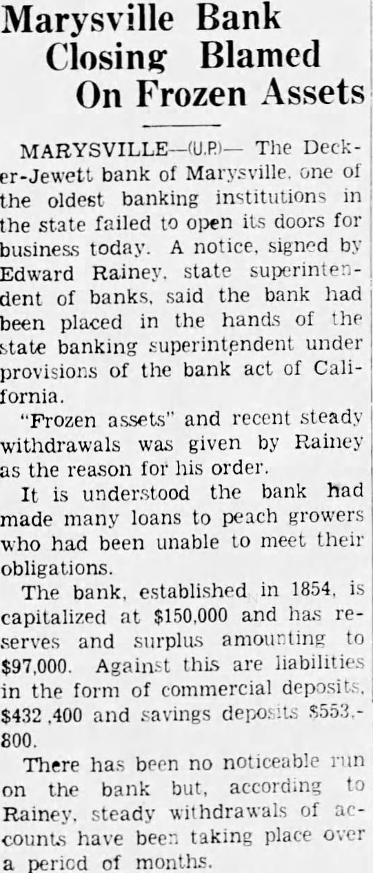 Marysville Bank Closing Blamed On Frozen Assets Deckbank of the oldest banking institutions the state failed open its doors for business today. notice, signed by Edward state superintensaid the bank had dent been placed in the hands of the state banking superintendent under of the bank act of Caliprovisions fornia. "Frozen assets" and recent steady withdrawals given by Rainey the reason order understood the bank had made many loans to peach growers who had been unable to meet their obligations. The bank, established in 1854, $150,000 and has capitalized serves and surplus amounting $97,000. Against this are liabilities in the form commercial and deposits $553.savings 800. There has been no noticeable on the bank but, according Rainey, steady withdrawals of counts have been taking place period of months.