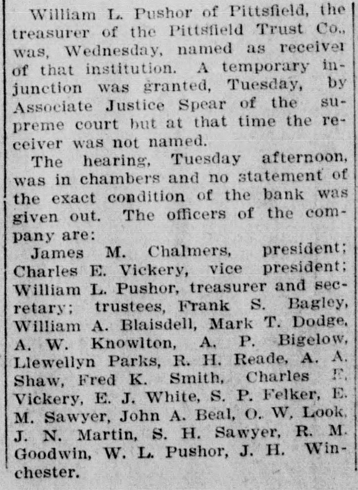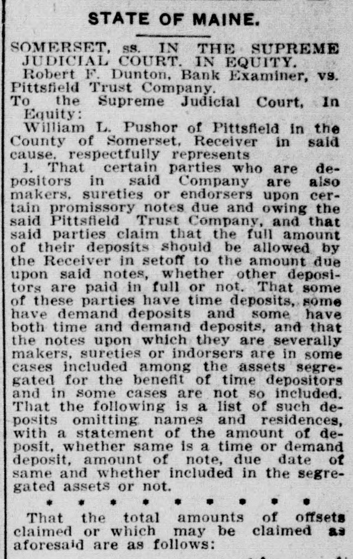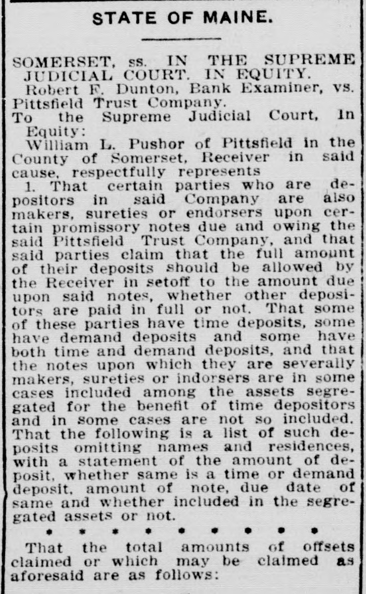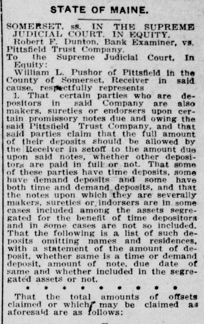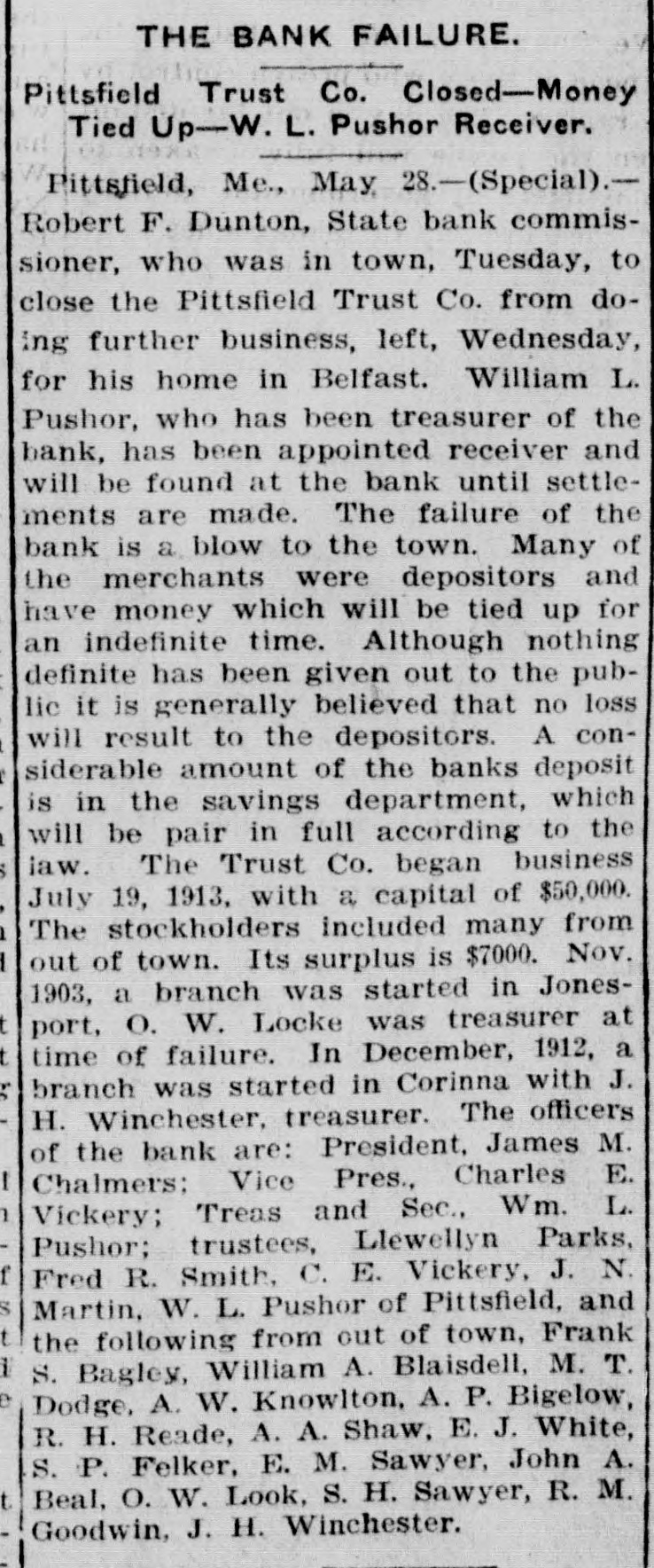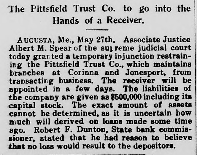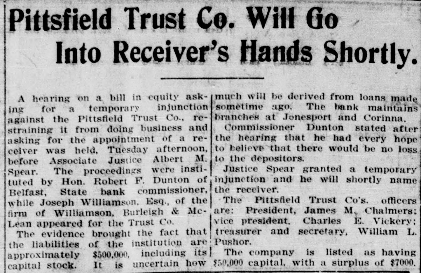 Pittsfield Trust Co. Will Go Into Receiver's Hands Shortly. A hearing on a bill in equity ask- much will be derived from loans made sometime ago. The bank maintains ing for a temporary injunction branches at Jonesport and Corinna. against the Pittsfield Trust Co., reCommissioner Dunton stated after straining it from doing business and the hearing that he had every hope asking for the appointment of a reto believe that there would be no loss ceiver was held, Tuesday afternoon, to the depositors. before Associate Justice Albert M. Justice Spear granted a temporary Spear. The proceedings were instiinjunction and he will shortly name tuted by Hon. Robert F. Dunton of the receiver. Belfast, State bank commissioner, The Pittsfield Trust Co's. officers while Joseph Williamson, Esq., of the are: President, James M. Chalmers: firm of Williamson, Burleigh & Mcvice president, Charles E. Vickery; Lean appeared for the Trust Co. treasurer and secretary, William L. The evidence brought the fact that Pushor. the liabilities of the institution are The company is listed as having approximately $500,000, including its capital stock. It is uncertain how $50,000 capital, with a surplus of $7000.