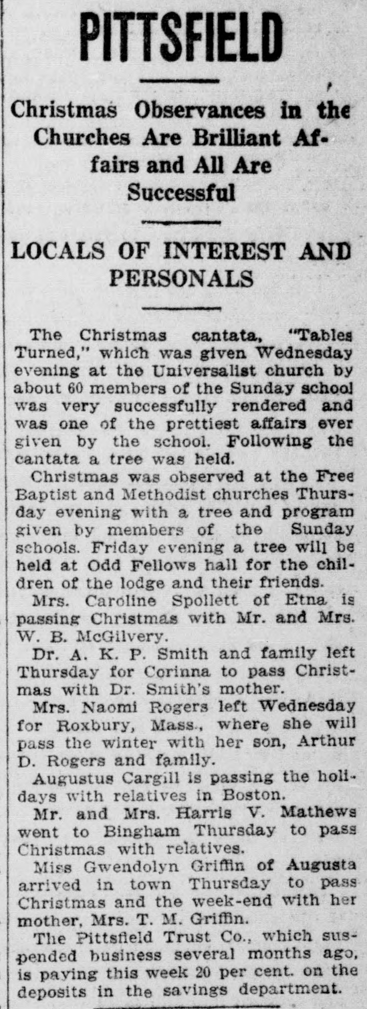 PITTSFIELD Christmas Observances in the Churches Are Brilliant Affairs and All Are Successful LOCALS OF INTEREST AND PERSONALS The Christmas cantata, "Tables Turned," which was given Wednesday evening at the Universalist church by about 60 members of the Sunday school was very successfully rendered and was one of the prettiest affairs ever given by the school. Following the cantata a tree was held. Christmas was observed at the Free Baptist and Methodist churches Thursday evening with a tree and program given by members of the Sunday schools. Friday evening a tree will be held at Odd Fellows hall for the children of the lodge and their friends. Mrs. Caroline Spollett of Etna is passing Christmas with Mr. and Mrs. W. B. McGilvery. Dr. A. K. P. Smith and family left Thursday for Corinna to pass Christmas with Dr. Smith's mother. Mrs. Naomi Rogers left Wednesday for Roxbury, Mass., where she will pass the winter with her son, Arthur D. Rogers and family. Augustus Cargill is passing the holidays with relatives in Boston. Mr. and Mrs. Harris V. Mathews went to Bingham Thursday to pass Christmas with relatives. Miss Gwendolyn Griffin of Augusta arrived in town Thursday to pass Christmas and the week-end with her mother, Mrs. T. M. Griffin. The Pittsfield Trust Co., which suspended business several months ago, is paying this week 20 per cent. on the deposits in the savings department.