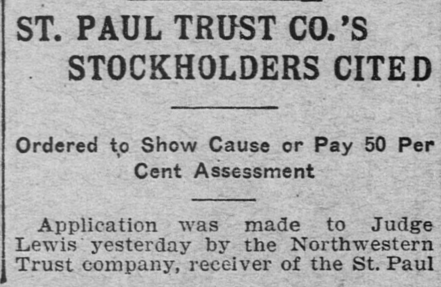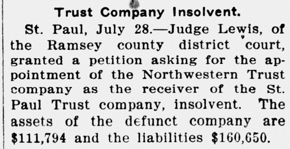 NAMES A RECEIVER Northwestern Trust to Wind up St. Paul Trust Company The Northwestern Trust company was appointed yesterday by Judge Lewis, of the district court, as receiver for the St. Paul Trust company, insolvent. A receiver was named on motion of Assistant Attorney General F. N. Dickson, following the application of State Public Examiner S. T. Johnson. The Northwestern Trust company was recommended as such receiver in a petition to the court signed by the principal creditors of the insolvent company. Examiner Johnson declares, in his application, that in January, 1902, it appeared to him that the decision of the Minnesota supreme court in the case of The St. Paul Trust Company, executors, etc., appellants, against Ab-igail Spurr Strong et al, respondents, would result in a very material increase of the trust company's liabilities and possibly in the insolvency of said company. "An examination of the company made by me," continues Mr. Johnson, disclosed that the business and affairs of the company had been conducted in an unsafe and unauthorized manner. The petitioner directed the company not to accept any new trust or business, and under a change of management. the company proceeded to dispose of its real estate and decrease its liabilities. The affairs of the company since January, 1902, have been conducted under the supervision and with the approval of your petitioner, and, as your petitioner believes, to the best interests of all concerned. The company is now insolvent, says Mr. Johnson. Its liabilities exceed its assets by about $54,000. These assets are: Cash and marketable bonds, $52,683; real estate, $43,000; real estate mortgages, $5,952; contract of sale, $1,709; miscellaneous, $8,450; total, $111,794. The liabilities include $15,330 due to stockholders. The request of creditors that the Northwestern Trust company, of St. Paul, be chosen as the receiver was signed by creditors. These creditors and their respective interests are: Freeman P. Strong, $68,000; Freeman P. Strong, trustee, $9,000; First National bank, $14,000; Merchants National bank, $13,000; St. Paul National bank, $12,000. A formal acceptance of the receivership was filed by the Northwestern Trust company.