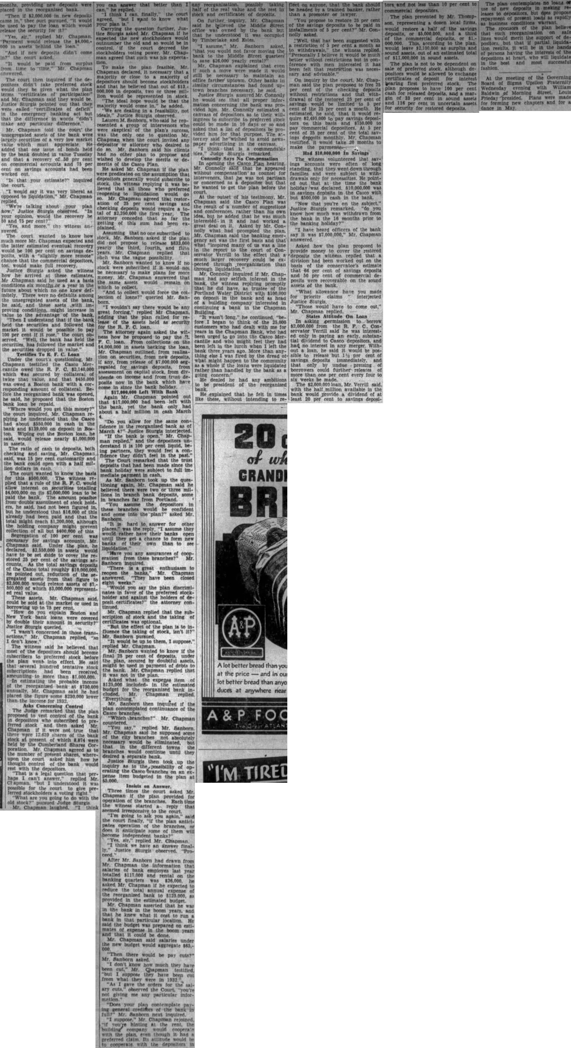 months, providing new deposits were you placed in the in new came ourt would be the which would release the security for tice replied the 000 in assets behind the If deposits come court would from surplus from Mr. Chapman The court inquired the detake stock they plan Mr. Chapman said they Justice pointed out that they were deficit in act but that the in "didn't any difference.' Mr. Chapman the the bank were was of market value which added that one issue of bonds held do by the doubled in value Tuesday and of 50 per on accounts 75 per cent on accounts had been worked out. that your inquired the would say liberal as opposed to liquidation, Mr. Chapman so. talking about your plan tal would the recovery be 50 and 75 per and the witness anThe wanted know how and did the be 100 per cent on savings dewith "slightly remote" that the depositors, make full Justice Sturgis asked the witness be arrived these Mr said he as basis the six the future no one There among assets of the bank, he and these asets ,with proving might in value the the "Then that the bank held the securities and the for market would to pay 100 per cent the court the bank has the has followed the market and the in value.' Mr. Testifies To Loan Under the Chapman the cantile owed the was secured collateral that and that $450,000 was owed Boston bank with amount Before the reorganized was opened, he he that the Boston bank loan would you get this money?" the court replying he that the about in cash in the and deposit in out the Boston loan. he nearly $1,000,000 The ratio of cash to both Mr. per cent and the bank could open with half mildollars cash. The wanted to know the basis for this witness that of the allow on on loan to be paid the The possible from of stock holdnot but that already had that the might reach although the holding prevent all but 000 of this of cent for savings accounts, Under the assets would to be to cover the stored 25 the savings As total savings deposits of the Casco total roughly he reduction of the segregated assets from figure 000 of 000 which ed Mr. Chapman could be the market or used in up per do explain Boston and New York bank were covered by double their amount in security? Justice Sturgis wasn't concerned in those transChapman The he that most of the become to preferred before the into effect. said several hundred tentative stock been to more than In estimating the probable of the at Mr. he the $230,000 for Asks Concerning Control The Judge that the proposed to control of the bank depositors who subscribed ferred stock then asked Chapman not that true the at present of which held by the Shares CorMr. Chapman agreed to the of shares, the court asked how bank would is replied for the court give going do with the Sturgis Mr. Chapman can answer that better than replied. court to know what your plan the JusSturgis Mr. Chapman he outnumber and so would the the voting power Chapagreed such was his expectaTo make plan Mr. or to majority depositors he out in or three lion would be hope that are not Sturgis he resented were skeptical the the question Chapman any depositor attorney who desired his had to propose wished develop the merits or dethe Casco Plan. He asked Mr. the plan on the = was believed all liquidation would Chapman agreed that restor. ation of 25 require the far of this had been plained. to stock, Mr. Sanborn asked if release yearly the replied that was the Mr. to stock were not make plans for Mr. Chapman that same assets would which would force the loans?" queried Mr. Sanborn. wouldn't say would be any great replied adding that plan called for lease the held security the loan. The again asked the ness how he proposed the in assets the loan, from on new from release regated savings from on capital from divon trust posits in which have come Left With Bank Again Mr. pointed that had left with the yet the only had half million in cash March about "Do you for the same fidence the as Justice the Mr. Chap- 20 man and the depositors derstand cent they would feel conthey didn't feel the The the deposits the bank holiday subject to full mediate As Sanborn up the questioning said he believed millions in some in far from the depositors in would come into asked for other assume their chance banks than see any of cooperation from these Sanborn great to reopen the banks, Mr Chapman answered. "They have been closed eight the plan nates in favor the stockholder and against the holders of the attorney conMr. replied that the subof and the taking of was the effect of the plan is AP fluence the taking of stock, isn't Mr. Sanborn "It would be Chapman. Mr. to know if the final 25 under the by might be used payment of debts to the bank. replied that it was in the what item of in estimated for bank cluded. Chapman Mr. Sanborn then inquired the plan of branches. Mr. Chapman replied Mr Chapman said he the city not absolutely be that the different towns until they separate Justice then took the the Casco on an pense in Insists on Answer. times the court asked Chapman plan of the time the witness started that irresponsive to the going to said the court the the anticipate of will replied think have an answer Sturgis observed. After Mr. Sanborn had from Mr. the that salaries last employes year totalled rental the Chapman expected total annual expense the reorganized bank to in the estimated budget. Mr. asserted that he the he knew what cost to that He the budget prepared on estiof expense boom years and that done. Mr. Chapman salaries under new budget would cuts?" don't know they Chapman suppose they been cut from gave the for the salthe me particular inforyour plan contemplate paycreditors the Mr. next inquired. hinting the cooperate with the attitude would to cooperate with depositors possibly taking of the real value and the rest and of On he believed Middle Street was owned by the he was by Mr. Sanborn the bank Street yearly that even such move were would be necessary maintain uptown. Other found upsee that the was vid