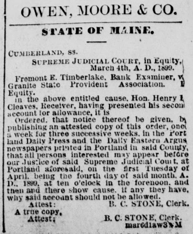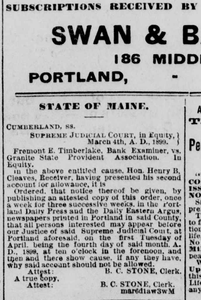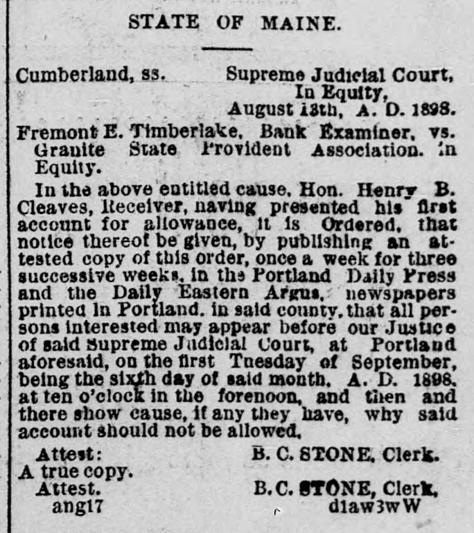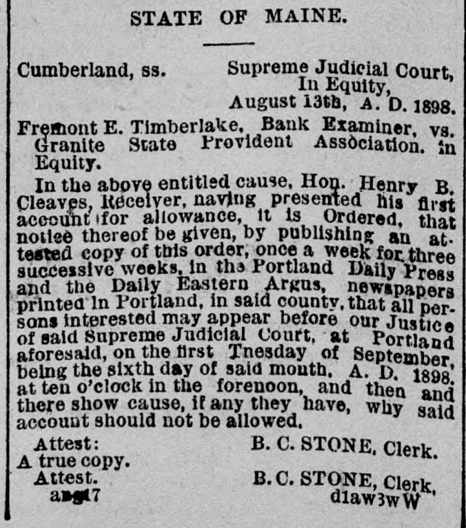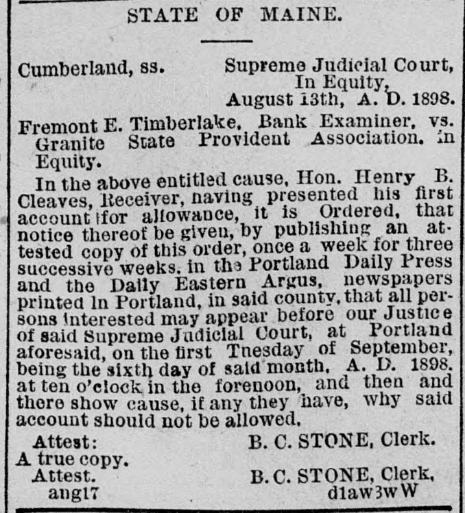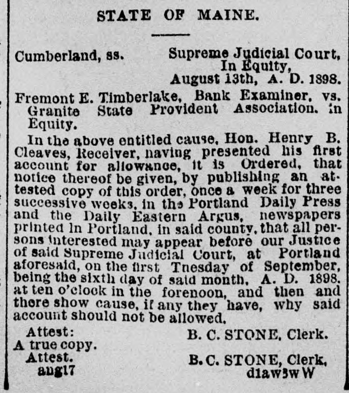 STATE OF MAINE. Supreme Judicial Court, Cumberland, SS. In Equity, August 13th, A. D. 1898. Fremont E. Timberlake, Bank Examiner, vs. Granite State Provident Association. in Equity. In the above entitled cause, Hon. Henry B. Cleaves, Receiver, naving presented his first account for allowance, it is Ordered, that notice thereof be given, by publishing an attested copy of this order, once a week for three successive weeks. in the Portland Daily Press and the Daily Eastern Argus, newspapers printed In Portland, in said county. that all persons interested may appear before our Justice of said Supreme Judicial Court, at Portland aforesaid, on the first Tnesday of September, being the sixth day of said month. A. D. 1898. at ten o'clock in the forenoon, and then and there show cause, if any they have, why said account should not be allowed. Attest: B. C. STONE, Clerk. A true copy. Attest. B.C. STONE, Clerk, d1aw3w W ang17