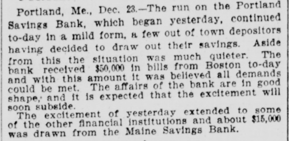 RUN ON PORTLAND SAVINGS BANK CONTINUED TODAY. Portland, Me., Dec. 23.-The run on the Portland Savings bank continues today in a mild form. A few out-oftown depositors are drawing out their $100, but otherwise than this the situation is much quieter. The bank received this morning from Boston $50.000 in bills and with this amount they will be able to meet all demands. The affairs of the bank are in good shape. and it is expected the excitement will soon cool down. The excitement of yesterday extended to some of the other institutions and about $15,000 was drawn from the Maine Savings bank. It is estimated that about $45,000 was taken from the Portland Savings bank during the run.